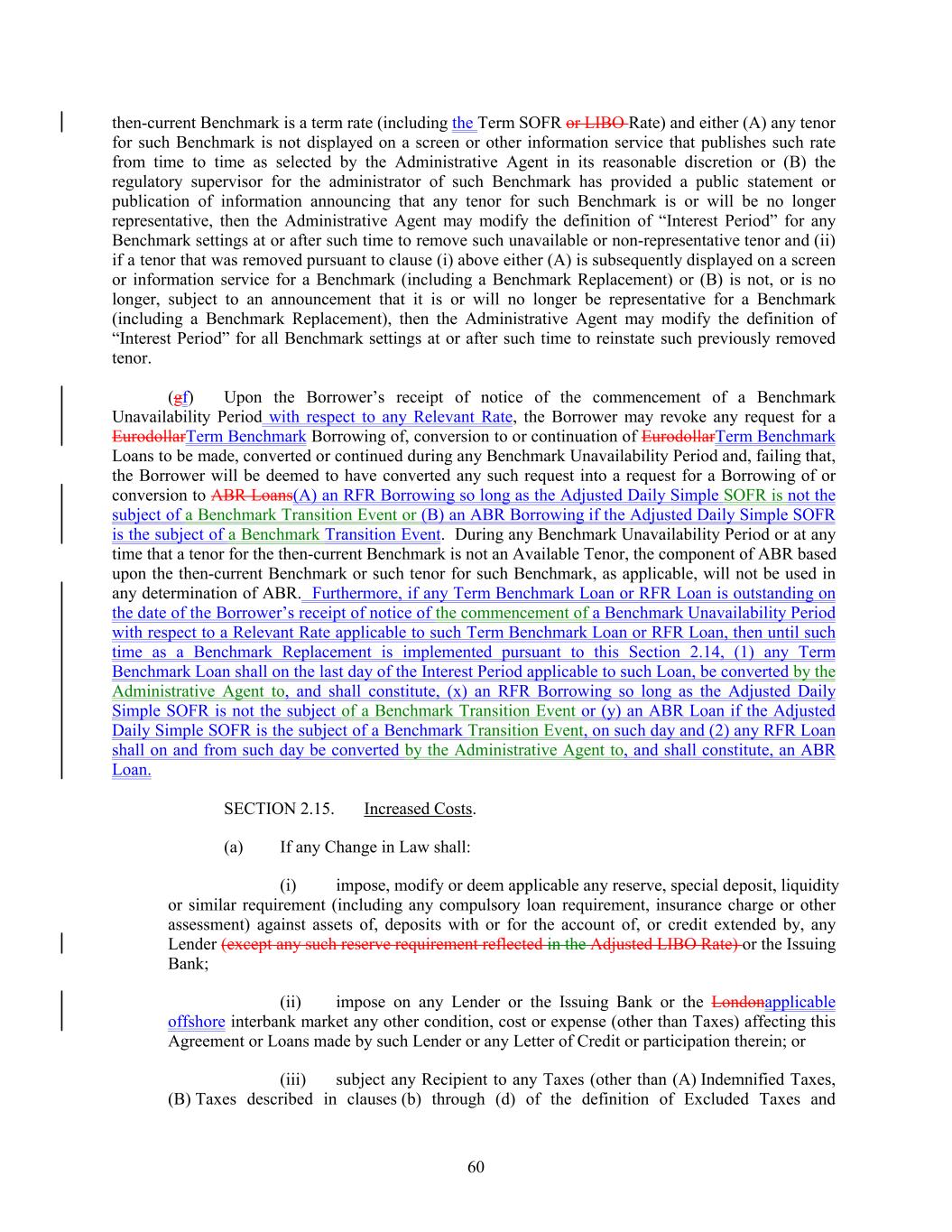 then-current Benchmark is a term rate (including the Term SOFR or LIBO Rate) and either (A) any tenor for such Benchmark is not displayed on a screen or other information service that publishes such rate from time to time as selected by the Administrative Agent in its reasonable discretion or (B) the regulatory supervisor for the administrator of such Benchmark has provided a public statement or publication of information announcing that any tenor for such Benchmark is or will be no longer representative, then the Administrative Agent may modify the definition of “Interest Period” for any Benchmark settings at or after such time to remove such unavailable or non-representative tenor and (ii) if a tenor that was removed pursuant to clause (i) above either (A) is subsequently displayed on a screen or information service for a Benchmark (including a Benchmark Replacement) or (B) is not, or is no longer, subject to an announcement that it is or will no longer be representative for a Benchmark (including a Benchmark Replacement), then the Administrative Agent may modify the definition of “Interest Period” for all Benchmark settings at or after such time to reinstate such previously removed tenor. (gf) Upon the Borrower’s receipt of notice of the commencement of a Benchmark Unavailability Period with respect to any Relevant Rate, the Borrower may revoke any request for a EurodollarTerm Benchmark Borrowing of, conversion to or continuation of EurodollarTerm Benchmark Loans to be made, converted or continued during any Benchmark Unavailability Period and, failing that, the Borrower will be deemed to have converted any such request into a request for a Borrowing of or conversion to ABR Loans(A) an RFR Borrowing so long as the Adjusted Daily Simple SOFR is not the subject of a Benchmark Transition Event or (B) an ABR Borrowing if the Adjusted Daily Simple SOFR is the subject of a Benchmark Transition Event. During any Benchmark Unavailability Period or at any time that a tenor for the then-current Benchmark is not an Available Tenor, the component of ABR based upon the then-current Benchmark or such tenor for such Benchmark, as applicable, will not be used in any determination of ABR. Furthermore, if any Term Benchmark Loan or RFR Loan is outstanding on the date of the Borrower’s receipt of notice of the commencement of a Benchmark Unavailability Period with respect to a Relevant Rate applicable to such Term Benchmark Loan or RFR Loan, then until such time as a Benchmark Replacement is implemented pursuant to this Section 2.14, (1) any Term Benchmark Loan shall on the last day of the Interest Period applicable to such Loan, be converted by the Administrative Agent to, and shall constitute, (x) an RFR Borrowing so long as the Adjusted Daily Simple SOFR is not the subject of a Benchmark Transition Event or (y) an ABR Loan if the Adjusted Daily Simple SOFR is the subject of a Benchmark Transition Event, on such day and (2) any RFR Loan shall on and from such day be converted by the Administrative Agent to, and shall constitute, an ABR Loan. SECTION 2.15. Increased Costs. (a) If any Change in Law shall: (i) impose, modify or deem applicable any reserve, special deposit, liquidity or similar requirement (including any compulsory loan requirement, insurance charge or other assessment) against assets of, deposits with or for the account of, or credit extended by, any Lender (except any such reserve requirement reflected in the Adjusted LIBO Rate) or the Issuing Bank; (ii) impose on any Lender or the Issuing Bank or the Londonapplicable offshore interbank market any other condition, cost or expense (other than Taxes) affecting this Agreement or Loans made by such Lender or any Letter of Credit or participation therein; or (iii) subject any Recipient to any Taxes (other than (A) Indemnified Taxes, (B) Taxes described in clauses (b) through (d) of the definition of Excluded Taxes and 60