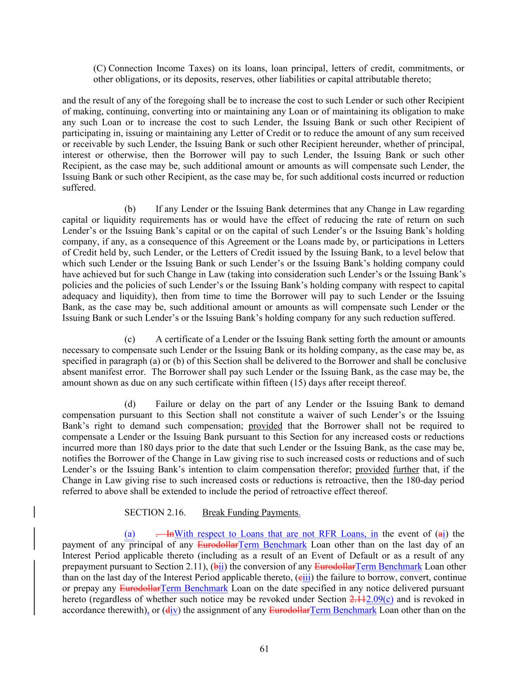 (C) Connection Income Taxes) on its loans, loan principal, letters of credit, commitments, or other obligations, or its deposits, reserves, other liabilities or capital attributable thereto; and the result of any of the foregoing shall be to increase the cost to such Lender or such other Recipient of making, continuing, converting into or maintaining any Loan or of maintaining its obligation to make any such Loan or to increase the cost to such Lender, the Issuing Bank or such other Recipient of participating in, issuing or maintaining any Letter of Credit or to reduce the amount of any sum received or receivable by such Lender, the Issuing Bank or such other Recipient hereunder, whether of principal, interest or otherwise, then the Borrower will pay to such Lender, the Issuing Bank or such other Recipient, as the case may be, such additional amount or amounts as will compensate such Lender, the Issuing Bank or such other Recipient, as the case may be, for such additional costs incurred or reduction suffered. (b) If any Lender or the Issuing Bank determines that any Change in Law regarding capital or liquidity requirements has or would have the effect of reducing the rate of return on such Lender’s or the Issuing Bank’s capital or on the capital of such Lender’s or the Issuing Bank’s holding company, if any, as a consequence of this Agreement or the Loans made by, or participations in Letters of Credit held by, such Lender, or the Letters of Credit issued by the Issuing Bank, to a level below that which such Lender or the Issuing Bank or such Lender’s or the Issuing Bank’s holding company could have achieved but for such Change in Law (taking into consideration such Lender’s or the Issuing Bank’s policies and the policies of such Lender’s or the Issuing Bank’s holding company with respect to capital adequacy and liquidity), then from time to time the Borrower will pay to such Lender or the Issuing Bank, as the case may be, such additional amount or amounts as will compensate such Lender or the Issuing Bank or such Lender’s or the Issuing Bank’s holding company for any such reduction suffered. (c) A certificate of a Lender or the Issuing Bank setting forth the amount or amounts necessary to compensate such Lender or the Issuing Bank or its holding company, as the case may be, as specified in paragraph (a) or (b) of this Section shall be delivered to the Borrower and shall be conclusive absent manifest error. The Borrower shall pay such Lender or the Issuing Bank, as the case may be, the amount shown as due on any such certificate within fifteen (15) days after receipt thereof. (d) Failure or delay on the part of any Lender or the Issuing Bank to demand compensation pursuant to this Section shall not constitute a waiver of such Lender’s or the Issuing Bank’s right to demand such compensation; provided that the Borrower shall not be required to compensate a Lender or the Issuing Bank pursuant to this Section for any increased costs or reductions incurred more than 180 days prior to the date that such Lender or the Issuing Bank, as the case may be, notifies the Borrower of the Change in Law giving rise to such increased costs or reductions and of such Lender’s or the Issuing Bank’s intention to claim compensation therefor; provided further that, if the Change in Law giving rise to such increased costs or reductions is retroactive, then the 180-day period referred to above shall be extended to include the period of retroactive effect thereof. SECTION 2.16. Break Funding Payments. (a) . InWith respect to Loans that are not RFR Loans, in the event of (ai) the payment of any principal of any EurodollarTerm Benchmark Loan other than on the last day of an Interest Period applicable thereto (including as a result of an Event of Default or as a result of any prepayment pursuant to Section 2.11), (bii) the conversion of any EurodollarTerm Benchmark Loan other than on the last day of the Interest Period applicable thereto, (ciii) the failure to borrow, convert, continue or prepay any EurodollarTerm Benchmark Loan on the date specified in any notice delivered pursuant hereto (regardless of whether such notice may be revoked under Section 2.112.09(c) and is revoked in accordance therewith), or (div) the assignment of any EurodollarTerm Benchmark Loan other than on the 61