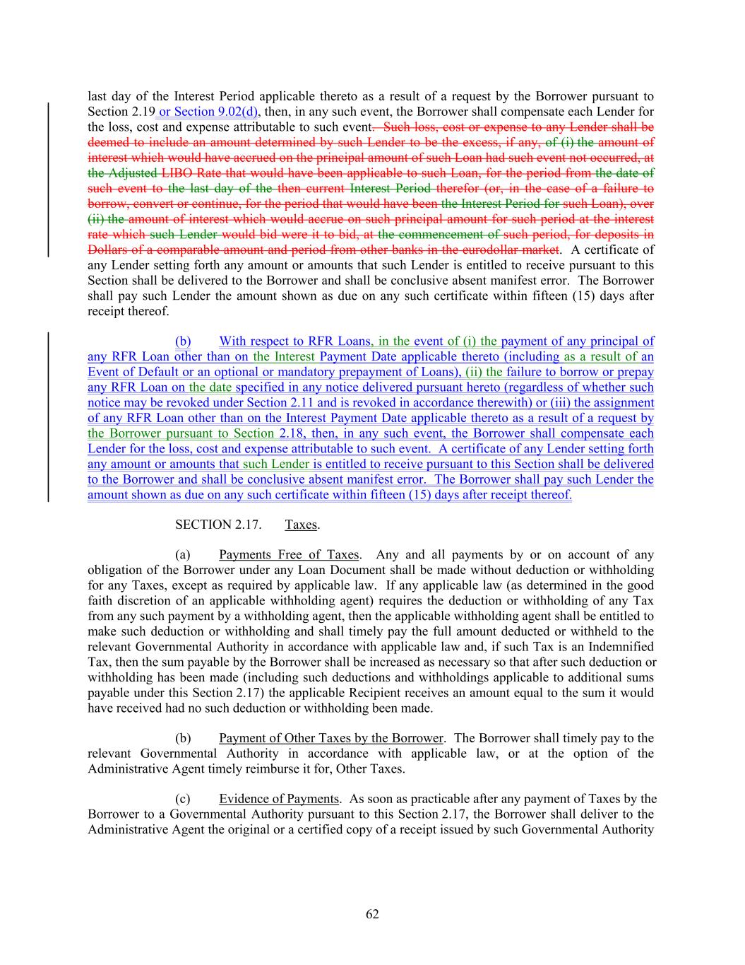 last day of the Interest Period applicable thereto as a result of a request by the Borrower pursuant to Section 2.19 or Section 9.02(d), then, in any such event, the Borrower shall compensate each Lender for the loss, cost and expense attributable to such event. Such loss, cost or expense to any Lender shall be deemed to include an amount determined by such Lender to be the excess, if any, of (i) the amount of interest which would have accrued on the principal amount of such Loan had such event not occurred, at the Adjusted LIBO Rate that would have been applicable to such Loan, for the period from the date of such event to the last day of the then current Interest Period therefor (or, in the case of a failure to borrow, convert or continue, for the period that would have been the Interest Period for such Loan), over (ii) the amount of interest which would accrue on such principal amount for such period at the interest rate which such Lender would bid were it to bid, at the commencement of such period, for deposits in Dollars of a comparable amount and period from other banks in the eurodollar market. A certificate of any Lender setting forth any amount or amounts that such Lender is entitled to receive pursuant to this Section shall be delivered to the Borrower and shall be conclusive absent manifest error. The Borrower shall pay such Lender the amount shown as due on any such certificate within fifteen (15) days after receipt thereof. (b) With respect to RFR Loans, in the event of (i) the payment of any principal of any RFR Loan other than on the Interest Payment Date applicable thereto (including as a result of an Event of Default or an optional or mandatory prepayment of Loans), (ii) the failure to borrow or prepay any RFR Loan on the date specified in any notice delivered pursuant hereto (regardless of whether such notice may be revoked under Section 2.11 and is revoked in accordance therewith) or (iii) the assignment of any RFR Loan other than on the Interest Payment Date applicable thereto as a result of a request by the Borrower pursuant to Section 2.18, then, in any such event, the Borrower shall compensate each Lender for the loss, cost and expense attributable to such event. A certificate of any Lender setting forth any amount or amounts that such Lender is entitled to receive pursuant to this Section shall be delivered to the Borrower and shall be conclusive absent manifest error. The Borrower shall pay such Lender the amount shown as due on any such certificate within fifteen (15) days after receipt thereof. SECTION 2.17. Taxes. (a) Payments Free of Taxes. Any and all payments by or on account of any obligation of the Borrower under any Loan Document shall be made without deduction or withholding for any Taxes, except as required by applicable law. If any applicable law (as determined in the good faith discretion of an applicable withholding agent) requires the deduction or withholding of any Tax from any such payment by a withholding agent, then the applicable withholding agent shall be entitled to make such deduction or withholding and shall timely pay the full amount deducted or withheld to the relevant Governmental Authority in accordance with applicable law and, if such Tax is an Indemnified Tax, then the sum payable by the Borrower shall be increased as necessary so that after such deduction or withholding has been made (including such deductions and withholdings applicable to additional sums payable under this Section 2.17) the applicable Recipient receives an amount equal to the sum it would have received had no such deduction or withholding been made. (b) Payment of Other Taxes by the Borrower. The Borrower shall timely pay to the relevant Governmental Authority in accordance with applicable law, or at the option of the Administrative Agent timely reimburse it for, Other Taxes. (c) Evidence of Payments. As soon as practicable after any payment of Taxes by the Borrower to a Governmental Authority pursuant to this Section 2.17, the Borrower shall deliver to the Administrative Agent the original or a certified copy of a receipt issued by such Governmental Authority 62
