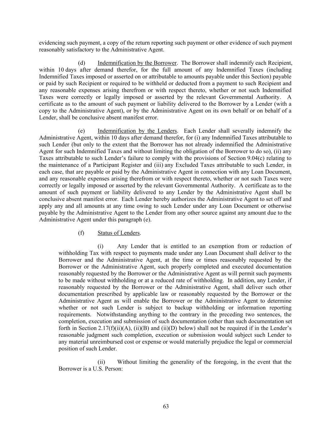 evidencing such payment, a copy of the return reporting such payment or other evidence of such payment reasonably satisfactory to the Administrative Agent. (d) Indemnification by the Borrower. The Borrower shall indemnify each Recipient, within 10 days after demand therefor, for the full amount of any Indemnified Taxes (including Indemnified Taxes imposed or asserted on or attributable to amounts payable under this Section) payable or paid by such Recipient or required to be withheld or deducted from a payment to such Recipient and any reasonable expenses arising therefrom or with respect thereto, whether or not such Indemnified Taxes were correctly or legally imposed or asserted by the relevant Governmental Authority. A certificate as to the amount of such payment or liability delivered to the Borrower by a Lender (with a copy to the Administrative Agent), or by the Administrative Agent on its own behalf or on behalf of a Lender, shall be conclusive absent manifest error. (e) Indemnification by the Lenders. Each Lender shall severally indemnify the Administrative Agent, within 10 days after demand therefor, for (i) any Indemnified Taxes attributable to such Lender (but only to the extent that the Borrower has not already indemnified the Administrative Agent for such Indemnified Taxes and without limiting the obligation of the Borrower to do so), (ii) any Taxes attributable to such Lender’s failure to comply with the provisions of Section 9.04(c) relating to the maintenance of a Participant Register and (iii) any Excluded Taxes attributable to such Lender, in each case, that are payable or paid by the Administrative Agent in connection with any Loan Document, and any reasonable expenses arising therefrom or with respect thereto, whether or not such Taxes were correctly or legally imposed or asserted by the relevant Governmental Authority. A certificate as to the amount of such payment or liability delivered to any Lender by the Administrative Agent shall be conclusive absent manifest error. Each Lender hereby authorizes the Administrative Agent to set off and apply any and all amounts at any time owing to such Lender under any Loan Document or otherwise payable by the Administrative Agent to the Lender from any other source against any amount due to the Administrative Agent under this paragraph (e). (f) Status of Lenders. (i) Any Lender that is entitled to an exemption from or reduction of withholding Tax with respect to payments made under any Loan Document shall deliver to the Borrower and the Administrative Agent, at the time or times reasonably requested by the Borrower or the Administrative Agent, such properly completed and executed documentation reasonably requested by the Borrower or the Administrative Agent as will permit such payments to be made without withholding or at a reduced rate of withholding. In addition, any Lender, if reasonably requested by the Borrower or the Administrative Agent, shall deliver such other documentation prescribed by applicable law or reasonably requested by the Borrower or the Administrative Agent as will enable the Borrower or the Administrative Agent to determine whether or not such Lender is subject to backup withholding or information reporting requirements. Notwithstanding anything to the contrary in the preceding two sentences, the completion, execution and submission of such documentation (other than such documentation set forth in Section 2.17(f)(ii)(A), (ii)(B) and (ii)(D) below) shall not be required if in the Lender’s reasonable judgment such completion, execution or submission would subject such Lender to any material unreimbursed cost or expense or would materially prejudice the legal or commercial position of such Lender. (ii) Without limiting the generality of the foregoing, in the event that the Borrower is a U.S. Person: 63