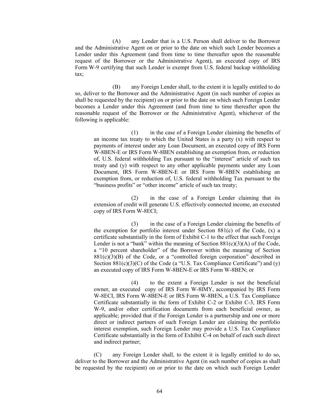 (A) any Lender that is a U.S. Person shall deliver to the Borrower and the Administrative Agent on or prior to the date on which such Lender becomes a Lender under this Agreement (and from time to time thereafter upon the reasonable request of the Borrower or the Administrative Agent), an executed copy of IRS Form W-9 certifying that such Lender is exempt from U.S. federal backup withholding tax; (B) any Foreign Lender shall, to the extent it is legally entitled to do so, deliver to the Borrower and the Administrative Agent (in such number of copies as shall be requested by the recipient) on or prior to the date on which such Foreign Lender becomes a Lender under this Agreement (and from time to time thereafter upon the reasonable request of the Borrower or the Administrative Agent), whichever of the following is applicable: (1) in the case of a Foreign Lender claiming the benefits of an income tax treaty to which the United States is a party (x) with respect to payments of interest under any Loan Document, an executed copy of IRS Form W-8BEN-E or IRS Form W-8BEN establishing an exemption from, or reduction of, U.S. federal withholding Tax pursuant to the “interest” article of such tax treaty and (y) with respect to any other applicable payments under any Loan Document, IRS Form W-8BEN-E or IRS Form W-8BEN establishing an exemption from, or reduction of, U.S. federal withholding Tax pursuant to the “business profits” or “other income” article of such tax treaty; (2) in the case of a Foreign Lender claiming that its extension of credit will generate U.S. effectively connected income, an executed copy of IRS Form W-8ECI; (3) in the case of a Foreign Lender claiming the benefits of the exemption for portfolio interest under Section 881(c) of the Code, (x) a certificate substantially in the form of Exhibit C-1 to the effect that such Foreign Lender is not a “bank” within the meaning of Section 881(c)(3)(A) of the Code, a “10 percent shareholder” of the Borrower within the meaning of Section 881(c)(3)(B) of the Code, or a “controlled foreign corporation” described in Section 881(c)(3)(C) of the Code (a “U.S. Tax Compliance Certificate”) and (y) an executed copy of IRS Form W-8BEN-E or IRS Form W-8BEN; or (4) to the extent a Foreign Lender is not the beneficial owner, an executed copy of IRS Form W-8IMY, accompanied by IRS Form W-8ECI, IRS Form W-8BEN-E or IRS Form W-8BEN, a U.S. Tax Compliance Certificate substantially in the form of Exhibit C-2 or Exhibit C-3, IRS Form W-9, and/or other certification documents from each beneficial owner, as applicable; provided that if the Foreign Lender is a partnership and one or more direct or indirect partners of such Foreign Lender are claiming the portfolio interest exemption, such Foreign Lender may provide a U.S. Tax Compliance Certificate substantially in the form of Exhibit C-4 on behalf of each such direct and indirect partner; (C) any Foreign Lender shall, to the extent it is legally entitled to do so, deliver to the Borrower and the Administrative Agent (in such number of copies as shall be requested by the recipient) on or prior to the date on which such Foreign Lender 64