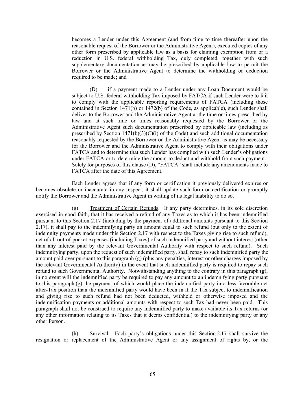 becomes a Lender under this Agreement (and from time to time thereafter upon the reasonable request of the Borrower or the Administrative Agent), executed copies of any other form prescribed by applicable law as a basis for claiming exemption from or a reduction in U.S. federal withholding Tax, duly completed, together with such supplementary documentation as may be prescribed by applicable law to permit the Borrower or the Administrative Agent to determine the withholding or deduction required to be made; and (D) if a payment made to a Lender under any Loan Document would be subject to U.S. federal withholding Tax imposed by FATCA if such Lender were to fail to comply with the applicable reporting requirements of FATCA (including those contained in Section 1471(b) or 1472(b) of the Code, as applicable), such Lender shall deliver to the Borrower and the Administrative Agent at the time or times prescribed by law and at such time or times reasonably requested by the Borrower or the Administrative Agent such documentation prescribed by applicable law (including as prescribed by Section 1471(b)(3)(C)(i) of the Code) and such additional documentation reasonably requested by the Borrower or the Administrative Agent as may be necessary for the Borrower and the Administrative Agent to comply with their obligations under FATCA and to determine that such Lender has complied with such Lender’s obligations under FATCA or to determine the amount to deduct and withhold from such payment. Solely for purposes of this clause (D), “FATCA” shall include any amendments made to FATCA after the date of this Agreement. Each Lender agrees that if any form or certification it previously delivered expires or becomes obsolete or inaccurate in any respect, it shall update such form or certification or promptly notify the Borrower and the Administrative Agent in writing of its legal inability to do so. (g) Treatment of Certain Refunds. If any party determines, in its sole discretion exercised in good faith, that it has received a refund of any Taxes as to which it has been indemnified pursuant to this Section 2.17 (including by the payment of additional amounts pursuant to this Section 2.17), it shall pay to the indemnifying party an amount equal to such refund (but only to the extent of indemnity payments made under this Section 2.17 with respect to the Taxes giving rise to such refund), net of all out-of-pocket expenses (including Taxes) of such indemnified party and without interest (other than any interest paid by the relevant Governmental Authority with respect to such refund). Such indemnifying party, upon the request of such indemnified party, shall repay to such indemnified party the amount paid over pursuant to this paragraph (g) (plus any penalties, interest or other charges imposed by the relevant Governmental Authority) in the event that such indemnified party is required to repay such refund to such Governmental Authority. Notwithstanding anything to the contrary in this paragraph (g), in no event will the indemnified party be required to pay any amount to an indemnifying party pursuant to this paragraph (g) the payment of which would place the indemnified party in a less favorable net after-Tax position than the indemnified party would have been in if the Tax subject to indemnification and giving rise to such refund had not been deducted, withheld or otherwise imposed and the indemnification payments or additional amounts with respect to such Tax had never been paid. This paragraph shall not be construed to require any indemnified party to make available its Tax returns (or any other information relating to its Taxes that it deems confidential) to the indemnifying party or any other Person. (h) Survival. Each party’s obligations under this Section 2.17 shall survive the resignation or replacement of the Administrative Agent or any assignment of rights by, or the 65