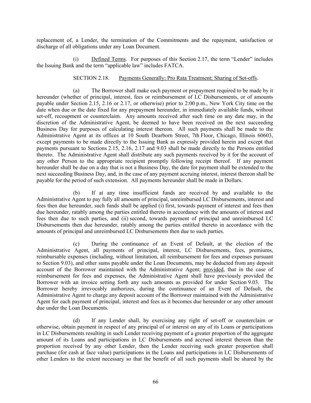 replacement of, a Lender, the termination of the Commitments and the repayment, satisfaction or discharge of all obligations under any Loan Document. (i) Defined Terms. For purposes of this Section 2.17, the term “Lender” includes the Issuing Bank and the term “applicable law” includes FATCA. SECTION 2.18. Payments Generally; Pro Rata Treatment; Sharing of Set-offs. (a) The Borrower shall make each payment or prepayment required to be made by it hereunder (whether of principal, interest, fees or reimbursement of LC Disbursements, or of amounts payable under Section 2.15, 2.16 or 2.17, or otherwise) prior to 2:00 p.m., New York City time on the date when due or the date fixed for any prepayment hereunder, in immediately available funds, without set-off, recoupment or counterclaim. Any amounts received after such time on any date may, in the discretion of the Administrative Agent, be deemed to have been received on the next succeeding Business Day for purposes of calculating interest thereon. All such payments shall be made to the Administrative Agent at its offices at 10 South Dearborn Street, 7th Floor, Chicago, Illinois 60603, except payments to be made directly to the Issuing Bank as expressly provided herein and except that payments pursuant to Sections 2.15, 2.16, 2.17 and 9.03 shall be made directly to the Persons entitled thereto. The Administrative Agent shall distribute any such payments received by it for the account of any other Person to the appropriate recipient promptly following receipt thereof. If any payment hereunder shall be due on a day that is not a Business Day, the date for payment shall be extended to the next succeeding Business Day, and, in the case of any payment accruing interest, interest thereon shall be payable for the period of such extension. All payments hereunder shall be made in Dollars. (b) If at any time insufficient funds are received by and available to the Administrative Agent to pay fully all amounts of principal, unreimbursed LC Disbursements, interest and fees then due hereunder, such funds shall be applied (i) first, towards payment of interest and fees then due hereunder, ratably among the parties entitled thereto in accordance with the amounts of interest and fees then due to such parties, and (ii) second, towards payment of principal and unreimbursed LC Disbursements then due hereunder, ratably among the parties entitled thereto in accordance with the amounts of principal and unreimbursed LC Disbursements then due to such parties. (c) During the continuance of an Event of Default, at the election of the Administrative Agent, all payments of principal, interest, LC Disbursements, fees, premiums, reimbursable expenses (including, without limitation, all reimbursement for fees and expenses pursuant to Section 9.03), and other sums payable under the Loan Documents, may be deducted from any deposit account of the Borrower maintained with the Administrative Agent; provided, that in the case of reimbursement for fees and expenses, the Administrative Agent shall have previously provided the Borrower with an invoice setting forth any such amounts as provided for under Section 9.03. The Borrower hereby irrevocably authorizes, during the continuance of an Event of Default, the Administrative Agent to charge any deposit account of the Borrower maintained with the Administrative Agent for each payment of principal, interest and fees as it becomes due hereunder or any other amount due under the Loan Documents. (d) If any Lender shall, by exercising any right of set-off or counterclaim or otherwise, obtain payment in respect of any principal of or interest on any of its Loans or participations in LC Disbursements resulting in such Lender receiving payment of a greater proportion of the aggregate amount of its Loans and participations in LC Disbursements and accrued interest thereon than the proportion received by any other Lender, then the Lender receiving such greater proportion shall purchase (for cash at face value) participations in the Loans and participations in LC Disbursements of other Lenders to the extent necessary so that the benefit of all such payments shall be shared by the 66