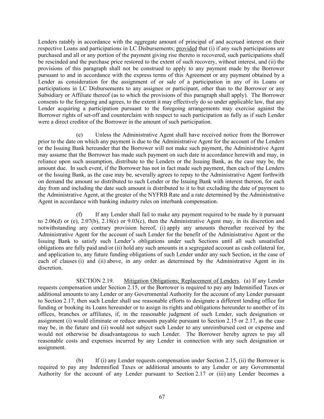Lenders ratably in accordance with the aggregate amount of principal of and accrued interest on their respective Loans and participations in LC Disbursements; provided that (i) if any such participations are purchased and all or any portion of the payment giving rise thereto is recovered, such participations shall be rescinded and the purchase price restored to the extent of such recovery, without interest, and (ii) the provisions of this paragraph shall not be construed to apply to any payment made by the Borrower pursuant to and in accordance with the express terms of this Agreement or any payment obtained by a Lender as consideration for the assignment of or sale of a participation in any of its Loans or participations in LC Disbursements to any assignee or participant, other than to the Borrower or any Subsidiary or Affiliate thereof (as to which the provisions of this paragraph shall apply). The Borrower consents to the foregoing and agrees, to the extent it may effectively do so under applicable law, that any Lender acquiring a participation pursuant to the foregoing arrangements may exercise against the Borrower rights of set-off and counterclaim with respect to such participation as fully as if such Lender were a direct creditor of the Borrower in the amount of such participation. (e) Unless the Administrative Agent shall have received notice from the Borrower prior to the date on which any payment is due to the Administrative Agent for the account of the Lenders or the Issuing Bank hereunder that the Borrower will not make such payment, the Administrative Agent may assume that the Borrower has made such payment on such date in accordance herewith and may, in reliance upon such assumption, distribute to the Lenders or the Issuing Bank, as the case may be, the amount due. In such event, if the Borrower has not in fact made such payment, then each of the Lenders or the Issuing Bank, as the case may be, severally agrees to repay to the Administrative Agent forthwith on demand the amount so distributed to such Lender or the Issuing Bank with interest thereon, for each day from and including the date such amount is distributed to it to but excluding the date of payment to the Administrative Agent, at the greater of the NYFRB Rate and a rate determined by the Administrative Agent in accordance with banking industry rules on interbank compensation. (f) If any Lender shall fail to make any payment required to be made by it pursuant to 2.06(d) or (e), 2.07(b), 2.18(e) or 9.03(c), then the Administrative Agent may, in its discretion and notwithstanding any contrary provision hereof, (i) apply any amounts thereafter received by the Administrative Agent for the account of such Lender for the benefit of the Administrative Agent or the Issuing Bank to satisfy such Lender’s obligations under such Sections until all such unsatisfied obligations are fully paid and/or (ii) hold any such amounts in a segregated account as cash collateral for, and application to, any future funding obligations of such Lender under any such Section, in the case of each of clauses (i) and (ii) above, in any order as determined by the Administrative Agent in its discretion. SECTION 2.19. Mitigation Obligations; Replacement of Lenders. (a) If any Lender requests compensation under Section 2.15, or the Borrower is required to pay any Indemnified Taxes or additional amounts to any Lender or any Governmental Authority for the account of any Lender pursuant to Section 2.17, then such Lender shall use reasonable efforts to designate a different lending office for funding or booking its Loans hereunder or to assign its rights and obligations hereunder to another of its offices, branches or affiliates, if, in the reasonable judgment of such Lender, such designation or assignment (i) would eliminate or reduce amounts payable pursuant to Section 2.15 or 2.17, as the case may be, in the future and (ii) would not subject such Lender to any unreimbursed cost or expense and would not otherwise be disadvantageous to such Lender. The Borrower hereby agrees to pay all reasonable costs and expenses incurred by any Lender in connection with any such designation or assignment. (b) If (i) any Lender requests compensation under Section 2.15, (ii) the Borrower is required to pay any Indemnified Taxes or additional amounts to any Lender or any Governmental Authority for the account of any Lender pursuant to Section 2.17 or (iii) any Lender becomes a 67