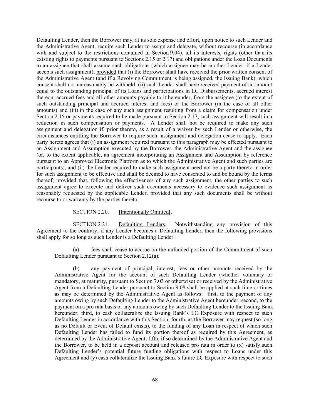 Defaulting Lender, then the Borrower may, at its sole expense and effort, upon notice to such Lender and the Administrative Agent, require such Lender to assign and delegate, without recourse (in accordance with and subject to the restrictions contained in Section 9.04), all its interests, rights (other than its existing rights to payments pursuant to Sections 2.15 or 2.17) and obligations under the Loan Documents to an assignee that shall assume such obligations (which assignee may be another Lender, if a Lender accepts such assignment); provided that (i) the Borrower shall have received the prior written consent of the Administrative Agent (and if a Revolving Commitment is being assigned, the Issuing Bank), which consent shall not unreasonably be withheld, (ii) such Lender shall have received payment of an amount equal to the outstanding principal of its Loans and participations in LC Disbursements, accrued interest thereon, accrued fees and all other amounts payable to it hereunder, from the assignee (to the extent of such outstanding principal and accrued interest and fees) or the Borrower (in the case of all other amounts) and (iii) in the case of any such assignment resulting from a claim for compensation under Section 2.15 or payments required to be made pursuant to Section 2.17, such assignment will result in a reduction in such compensation or payments. A Lender shall not be required to make any such assignment and delegation if, prior thereto, as a result of a waiver by such Lender or otherwise, the circumstances entitling the Borrower to require such assignment and delegation cease to apply. Each party hereto agrees that (i) an assignment required pursuant to this paragraph may be effected pursuant to an Assignment and Assumption executed by the Borrower, the Administrative Agent and the assignee (or, to the extent applicable, an agreement incorporating an Assignment and Assumption by reference pursuant to an Approved Electronic Platform as to which the Administrative Agent and such parties are participants), and (ii) the Lender required to make such assignment need not be a party thereto in order for such assignment to be effective and shall be deemed to have consented to and be bound by the terms thereof; provided that, following the effectiveness of any such assignment, the other parties to such assignment agree to execute and deliver such documents necessary to evidence such assignment as reasonably requested by the applicable Lender, provided that any such documents shall be without recourse to or warranty by the parties thereto. SECTION 2.20. [Intentionally Omitted]. SECTION 2.21. Defaulting Lenders. Notwithstanding any provision of this Agreement to the contrary, if any Lender becomes a Defaulting Lender, then the following provisions shall apply for so long as such Lender is a Defaulting Lender: (a) fees shall cease to accrue on the unfunded portion of the Commitment of such Defaulting Lender pursuant to Section 2.12(a); (b) any payment of principal, interest, fees or other amounts received by the Administrative Agent for the account of such Defaulting Lender (whether voluntary or mandatory, at maturity, pursuant to Section 7.03 or otherwise) or received by the Administrative Agent from a Defaulting Lender pursuant to Section 9.08 shall be applied at such time or times as may be determined by the Administrative Agent as follows: first, to the payment of any amounts owing by such Defaulting Lender to the Administrative Agent hereunder; second, to the payment on a pro rata basis of any amounts owing by such Defaulting Lender to the Issuing Bank hereunder; third, to cash collateralize the Issuing Bank’s LC Exposure with respect to such Defaulting Lender in accordance with this Section; fourth, as the Borrower may request (so long as no Default or Event of Default exists), to the funding of any Loan in respect of which such Defaulting Lender has failed to fund its portion thereof as required by this Agreement, as determined by the Administrative Agent; fifth, if so determined by the Administrative Agent and the Borrower, to be held in a deposit account and released pro rata in order to (x) satisfy such Defaulting Lender’s potential future funding obligations with respect to Loans under this Agreement and (y) cash collateralize the Issuing Bank’s future LC Exposure with respect to such 68