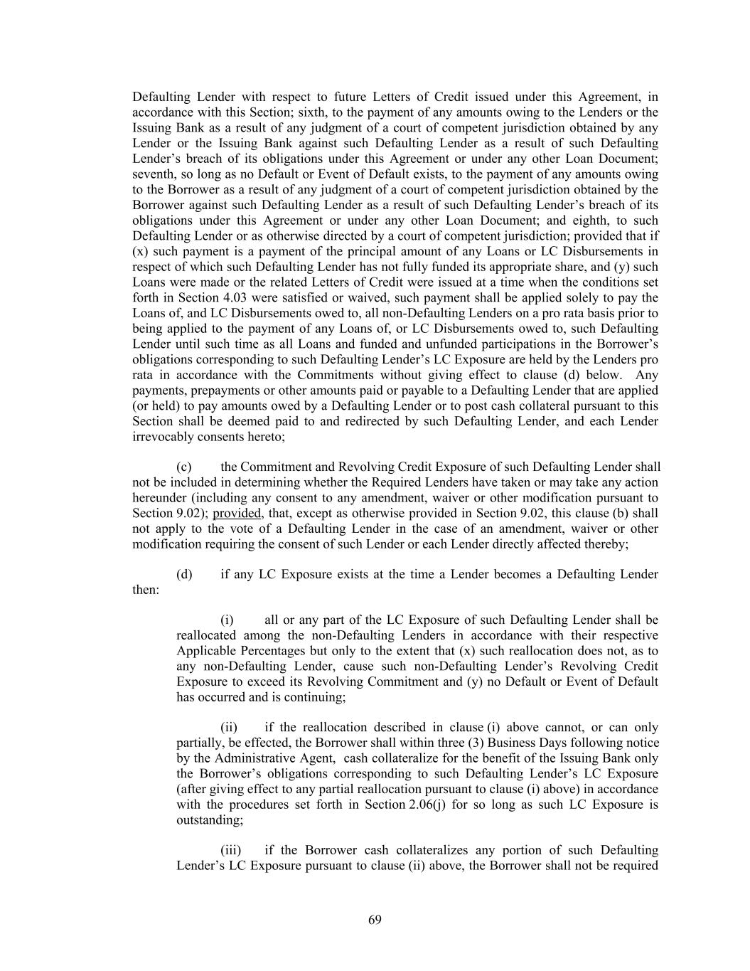 Defaulting Lender with respect to future Letters of Credit issued under this Agreement, in accordance with this Section; sixth, to the payment of any amounts owing to the Lenders or the Issuing Bank as a result of any judgment of a court of competent jurisdiction obtained by any Lender or the Issuing Bank against such Defaulting Lender as a result of such Defaulting Lender’s breach of its obligations under this Agreement or under any other Loan Document; seventh, so long as no Default or Event of Default exists, to the payment of any amounts owing to the Borrower as a result of any judgment of a court of competent jurisdiction obtained by the Borrower against such Defaulting Lender as a result of such Defaulting Lender’s breach of its obligations under this Agreement or under any other Loan Document; and eighth, to such Defaulting Lender or as otherwise directed by a court of competent jurisdiction; provided that if (x) such payment is a payment of the principal amount of any Loans or LC Disbursements in respect of which such Defaulting Lender has not fully funded its appropriate share, and (y) such Loans were made or the related Letters of Credit were issued at a time when the conditions set forth in Section 4.03 were satisfied or waived, such payment shall be applied solely to pay the Loans of, and LC Disbursements owed to, all non-Defaulting Lenders on a pro rata basis prior to being applied to the payment of any Loans of, or LC Disbursements owed to, such Defaulting Lender until such time as all Loans and funded and unfunded participations in the Borrower’s obligations corresponding to such Defaulting Lender’s LC Exposure are held by the Lenders pro rata in accordance with the Commitments without giving effect to clause (d) below. Any payments, prepayments or other amounts paid or payable to a Defaulting Lender that are applied (or held) to pay amounts owed by a Defaulting Lender or to post cash collateral pursuant to this Section shall be deemed paid to and redirected by such Defaulting Lender, and each Lender irrevocably consents hereto; (c) the Commitment and Revolving Credit Exposure of such Defaulting Lender shall not be included in determining whether the Required Lenders have taken or may take any action hereunder (including any consent to any amendment, waiver or other modification pursuant to Section 9.02); provided, that, except as otherwise provided in Section 9.02, this clause (b) shall not apply to the vote of a Defaulting Lender in the case of an amendment, waiver or other modification requiring the consent of such Lender or each Lender directly affected thereby; (d) if any LC Exposure exists at the time a Lender becomes a Defaulting Lender then: (i) all or any part of the LC Exposure of such Defaulting Lender shall be reallocated among the non-Defaulting Lenders in accordance with their respective Applicable Percentages but only to the extent that (x) such reallocation does not, as to any non-Defaulting Lender, cause such non-Defaulting Lender’s Revolving Credit Exposure to exceed its Revolving Commitment and (y) no Default or Event of Default has occurred and is continuing; (ii) if the reallocation described in clause (i) above cannot, or can only partially, be effected, the Borrower shall within three (3) Business Days following notice by the Administrative Agent, cash collateralize for the benefit of the Issuing Bank only the Borrower’s obligations corresponding to such Defaulting Lender’s LC Exposure (after giving effect to any partial reallocation pursuant to clause (i) above) in accordance with the procedures set forth in Section 2.06(j) for so long as such LC Exposure is outstanding; (iii) if the Borrower cash collateralizes any portion of such Defaulting Lender’s LC Exposure pursuant to clause (ii) above, the Borrower shall not be required 69