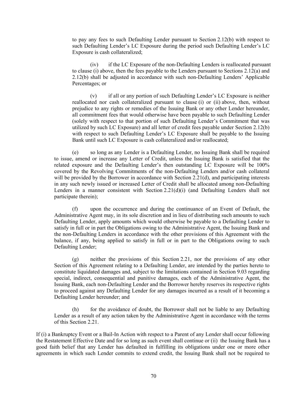 to pay any fees to such Defaulting Lender pursuant to Section 2.12(b) with respect to such Defaulting Lender’s LC Exposure during the period such Defaulting Lender’s LC Exposure is cash collateralized; (iv) if the LC Exposure of the non-Defaulting Lenders is reallocated pursuant to clause (i) above, then the fees payable to the Lenders pursuant to Sections 2.12(a) and 2.12(b) shall be adjusted in accordance with such non-Defaulting Lenders’ Applicable Percentages; or (v) if all or any portion of such Defaulting Lender’s LC Exposure is neither reallocated nor cash collateralized pursuant to clause (i) or (ii) above, then, without prejudice to any rights or remedies of the Issuing Bank or any other Lender hereunder, all commitment fees that would otherwise have been payable to such Defaulting Lender (solely with respect to that portion of such Defaulting Lender’s Commitment that was utilized by such LC Exposure) and all letter of credit fees payable under Section 2.12(b) with respect to such Defaulting Lender’s LC Exposure shall be payable to the Issuing Bank until such LC Exposure is cash collateralized and/or reallocated; (e) so long as any Lender is a Defaulting Lender, no Issuing Bank shall be required to issue, amend or increase any Letter of Credit, unless the Issuing Bank is satisfied that the related exposure and the Defaulting Lender’s then outstanding LC Exposure will be 100% covered by the Revolving Commitments of the non-Defaulting Lenders and/or cash collateral will be provided by the Borrower in accordance with Section 2.21(d), and participating interests in any such newly issued or increased Letter of Credit shall be allocated among non-Defaulting Lenders in a manner consistent with Section 2.21(d)(i) (and Defaulting Lenders shall not participate therein); (f) upon the occurrence and during the continuance of an Event of Default, the Administrative Agent may, in its sole discretion and in lieu of distributing such amounts to such Defaulting Lender, apply amounts which would otherwise be payable to a Defaulting Lender to satisfy in full or in part the Obligations owing to the Administrative Agent, the Issuing Bank and the non-Defaulting Lenders in accordance with the other provisions of this Agreement with the balance, if any, being applied to satisfy in full or in part to the Obligations owing to such Defaulting Lender; (g) neither the provisions of this Section 2.21, nor the provisions of any other Section of this Agreement relating to a Defaulting Lender, are intended by the parties hereto to constitute liquidated damages and, subject to the limitations contained in Section 9.03 regarding special, indirect, consequential and punitive damages, each of the Administrative Agent, the Issuing Bank, each non-Defaulting Lender and the Borrower hereby reserves its respective rights to proceed against any Defaulting Lender for any damages incurred as a result of it becoming a Defaulting Lender hereunder; and (h) for the avoidance of doubt, the Borrower shall not be liable to any Defaulting Lender as a result of any action taken by the Administrative Agent in accordance with the terms of this Section 2.21. If (i) a Bankruptcy Event or a Bail-In Action with respect to a Parent of any Lender shall occur following the Restatement Effective Date and for so long as such event shall continue or (ii) the Issuing Bank has a good faith belief that any Lender has defaulted in fulfilling its obligations under one or more other agreements in which such Lender commits to extend credit, the Issuing Bank shall not be required to 70
