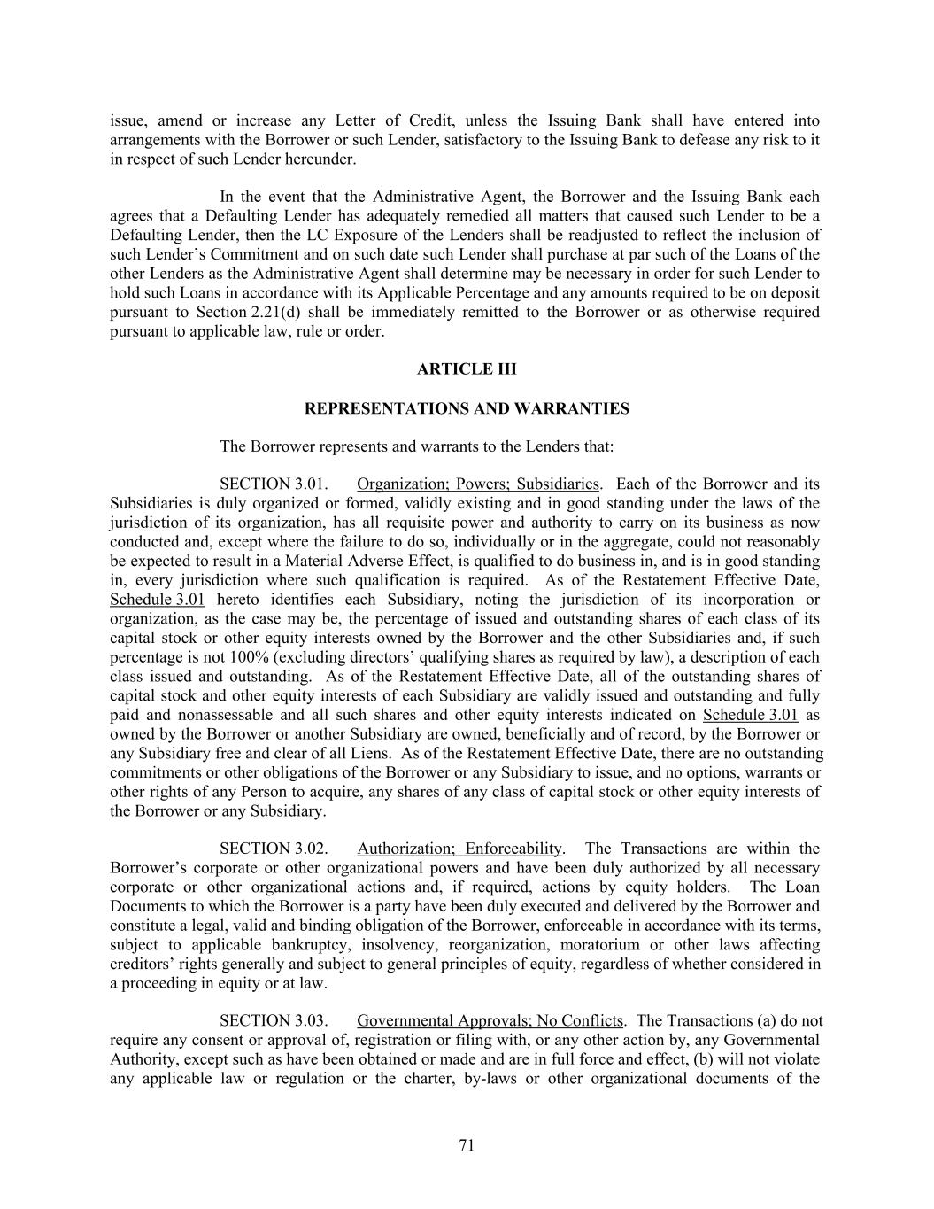 issue, amend or increase any Letter of Credit, unless the Issuing Bank shall have entered into arrangements with the Borrower or such Lender, satisfactory to the Issuing Bank to defease any risk to it in respect of such Lender hereunder. In the event that the Administrative Agent, the Borrower and the Issuing Bank each agrees that a Defaulting Lender has adequately remedied all matters that caused such Lender to be a Defaulting Lender, then the LC Exposure of the Lenders shall be readjusted to reflect the inclusion of such Lender’s Commitment and on such date such Lender shall purchase at par such of the Loans of the other Lenders as the Administrative Agent shall determine may be necessary in order for such Lender to hold such Loans in accordance with its Applicable Percentage and any amounts required to be on deposit pursuant to Section 2.21(d) shall be immediately remitted to the Borrower or as otherwise required pursuant to applicable law, rule or order. ARTICLE III REPRESENTATIONS AND WARRANTIES The Borrower represents and warrants to the Lenders that: SECTION 3.01. Organization; Powers; Subsidiaries. Each of the Borrower and its Subsidiaries is duly organized or formed, validly existing and in good standing under the laws of the jurisdiction of its organization, has all requisite power and authority to carry on its business as now conducted and, except where the failure to do so, individually or in the aggregate, could not reasonably be expected to result in a Material Adverse Effect, is qualified to do business in, and is in good standing in, every jurisdiction where such qualification is required. As of the Restatement Effective Date, Schedule 3.01 hereto identifies each Subsidiary, noting the jurisdiction of its incorporation or organization, as the case may be, the percentage of issued and outstanding shares of each class of its capital stock or other equity interests owned by the Borrower and the other Subsidiaries and, if such percentage is not 100% (excluding directors’ qualifying shares as required by law), a description of each class issued and outstanding. As of the Restatement Effective Date, all of the outstanding shares of capital stock and other equity interests of each Subsidiary are validly issued and outstanding and fully paid and nonassessable and all such shares and other equity interests indicated on Schedule 3.01 as owned by the Borrower or another Subsidiary are owned, beneficially and of record, by the Borrower or any Subsidiary free and clear of all Liens. As of the Restatement Effective Date, there are no outstanding commitments or other obligations of the Borrower or any Subsidiary to issue, and no options, warrants or other rights of any Person to acquire, any shares of any class of capital stock or other equity interests of the Borrower or any Subsidiary. SECTION 3.02. Authorization; Enforceability. The Transactions are within the Borrower’s corporate or other organizational powers and have been duly authorized by all necessary corporate or other organizational actions and, if required, actions by equity holders. The Loan Documents to which the Borrower is a party have been duly executed and delivered by the Borrower and constitute a legal, valid and binding obligation of the Borrower, enforceable in accordance with its terms, subject to applicable bankruptcy, insolvency, reorganization, moratorium or other laws affecting creditors’ rights generally and subject to general principles of equity, regardless of whether considered in a proceeding in equity or at law. SECTION 3.03. Governmental Approvals; No Conflicts. The Transactions (a) do not require any consent or approval of, registration or filing with, or any other action by, any Governmental Authority, except such as have been obtained or made and are in full force and effect, (b) will not violate any applicable law or regulation or the charter, by-laws or other organizational documents of the 71