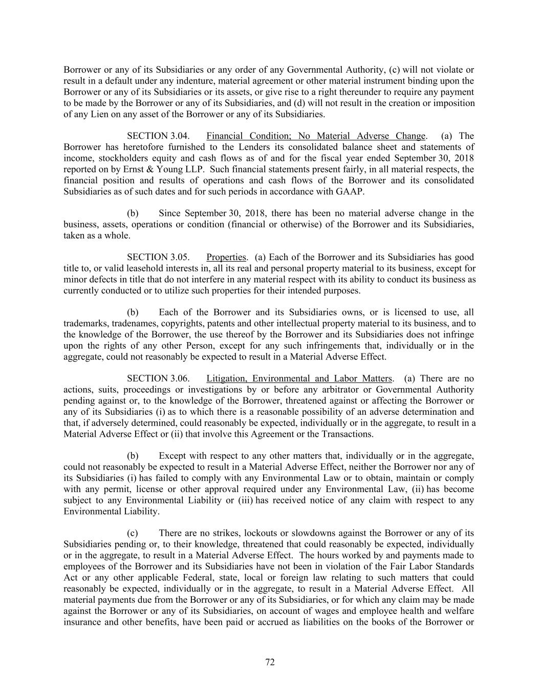 Borrower or any of its Subsidiaries or any order of any Governmental Authority, (c) will not violate or result in a default under any indenture, material agreement or other material instrument binding upon the Borrower or any of its Subsidiaries or its assets, or give rise to a right thereunder to require any payment to be made by the Borrower or any of its Subsidiaries, and (d) will not result in the creation or imposition of any Lien on any asset of the Borrower or any of its Subsidiaries. SECTION 3.04. Financial Condition; No Material Adverse Change. (a) The Borrower has heretofore furnished to the Lenders its consolidated balance sheet and statements of income, stockholders equity and cash flows as of and for the fiscal year ended September 30, 2018 reported on by Ernst & Young LLP. Such financial statements present fairly, in all material respects, the financial position and results of operations and cash flows of the Borrower and its consolidated Subsidiaries as of such dates and for such periods in accordance with GAAP. (b) Since September 30, 2018, there has been no material adverse change in the business, assets, operations or condition (financial or otherwise) of the Borrower and its Subsidiaries, taken as a whole. SECTION 3.05. Properties. (a) Each of the Borrower and its Subsidiaries has good title to, or valid leasehold interests in, all its real and personal property material to its business, except for minor defects in title that do not interfere in any material respect with its ability to conduct its business as currently conducted or to utilize such properties for their intended purposes. (b) Each of the Borrower and its Subsidiaries owns, or is licensed to use, all trademarks, tradenames, copyrights, patents and other intellectual property material to its business, and to the knowledge of the Borrower, the use thereof by the Borrower and its Subsidiaries does not infringe upon the rights of any other Person, except for any such infringements that, individually or in the aggregate, could not reasonably be expected to result in a Material Adverse Effect. SECTION 3.06. Litigation, Environmental and Labor Matters. (a) There are no actions, suits, proceedings or investigations by or before any arbitrator or Governmental Authority pending against or, to the knowledge of the Borrower, threatened against or affecting the Borrower or any of its Subsidiaries (i) as to which there is a reasonable possibility of an adverse determination and that, if adversely determined, could reasonably be expected, individually or in the aggregate, to result in a Material Adverse Effect or (ii) that involve this Agreement or the Transactions. (b) Except with respect to any other matters that, individually or in the aggregate, could not reasonably be expected to result in a Material Adverse Effect, neither the Borrower nor any of its Subsidiaries (i) has failed to comply with any Environmental Law or to obtain, maintain or comply with any permit, license or other approval required under any Environmental Law, (ii) has become subject to any Environmental Liability or (iii) has received notice of any claim with respect to any Environmental Liability. (c) There are no strikes, lockouts or slowdowns against the Borrower or any of its Subsidiaries pending or, to their knowledge, threatened that could reasonably be expected, individually or in the aggregate, to result in a Material Adverse Effect. The hours worked by and payments made to employees of the Borrower and its Subsidiaries have not been in violation of the Fair Labor Standards Act or any other applicable Federal, state, local or foreign law relating to such matters that could reasonably be expected, individually or in the aggregate, to result in a Material Adverse Effect. All material payments due from the Borrower or any of its Subsidiaries, or for which any claim may be made against the Borrower or any of its Subsidiaries, on account of wages and employee health and welfare insurance and other benefits, have been paid or accrued as liabilities on the books of the Borrower or 72