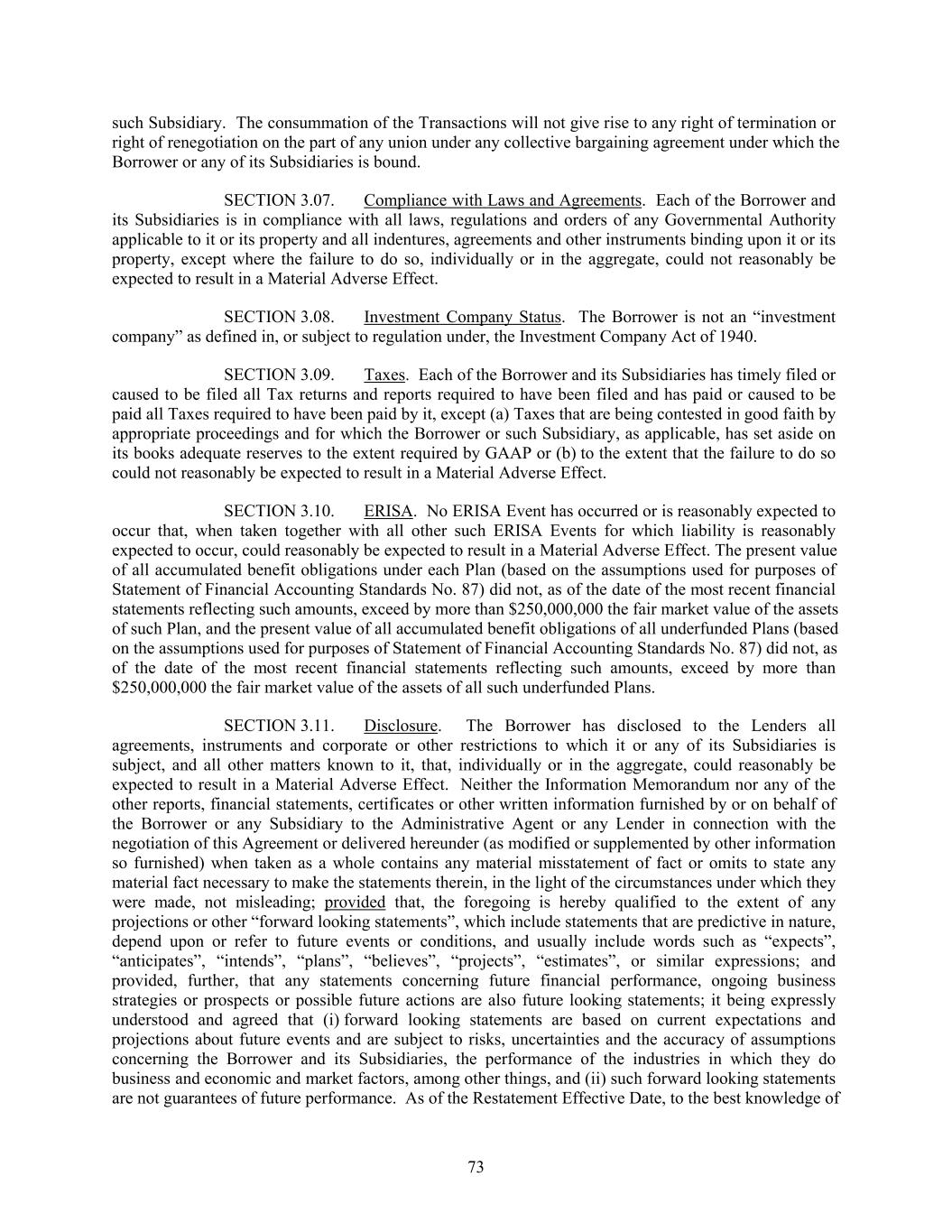 such Subsidiary. The consummation of the Transactions will not give rise to any right of termination or right of renegotiation on the part of any union under any collective bargaining agreement under which the Borrower or any of its Subsidiaries is bound. SECTION 3.07. Compliance with Laws and Agreements. Each of the Borrower and its Subsidiaries is in compliance with all laws, regulations and orders of any Governmental Authority applicable to it or its property and all indentures, agreements and other instruments binding upon it or its property, except where the failure to do so, individually or in the aggregate, could not reasonably be expected to result in a Material Adverse Effect. SECTION 3.08. Investment Company Status. The Borrower is not an “investment company” as defined in, or subject to regulation under, the Investment Company Act of 1940. SECTION 3.09. Taxes. Each of the Borrower and its Subsidiaries has timely filed or caused to be filed all Tax returns and reports required to have been filed and has paid or caused to be paid all Taxes required to have been paid by it, except (a) Taxes that are being contested in good faith by appropriate proceedings and for which the Borrower or such Subsidiary, as applicable, has set aside on its books adequate reserves to the extent required by GAAP or (b) to the extent that the failure to do so could not reasonably be expected to result in a Material Adverse Effect. SECTION 3.10. ERISA. No ERISA Event has occurred or is reasonably expected to occur that, when taken together with all other such ERISA Events for which liability is reasonably expected to occur, could reasonably be expected to result in a Material Adverse Effect. The present value of all accumulated benefit obligations under each Plan (based on the assumptions used for purposes of Statement of Financial Accounting Standards No. 87) did not, as of the date of the most recent financial statements reflecting such amounts, exceed by more than $250,000,000 the fair market value of the assets of such Plan, and the present value of all accumulated benefit obligations of all underfunded Plans (based on the assumptions used for purposes of Statement of Financial Accounting Standards No. 87) did not, as of the date of the most recent financial statements reflecting such amounts, exceed by more than $250,000,000 the fair market value of the assets of all such underfunded Plans. SECTION 3.11. Disclosure. The Borrower has disclosed to the Lenders all agreements, instruments and corporate or other restrictions to which it or any of its Subsidiaries is subject, and all other matters known to it, that, individually or in the aggregate, could reasonably be expected to result in a Material Adverse Effect. Neither the Information Memorandum nor any of the other reports, financial statements, certificates or other written information furnished by or on behalf of the Borrower or any Subsidiary to the Administrative Agent or any Lender in connection with the negotiation of this Agreement or delivered hereunder (as modified or supplemented by other information so furnished) when taken as a whole contains any material misstatement of fact or omits to state any material fact necessary to make the statements therein, in the light of the circumstances under which they were made, not misleading; provided that, the foregoing is hereby qualified to the extent of any projections or other “forward looking statements”, which include statements that are predictive in nature, depend upon or refer to future events or conditions, and usually include words such as “expects”, “anticipates”, “intends”, “plans”, “believes”, “projects”, “estimates”, or similar expressions; and provided, further, that any statements concerning future financial performance, ongoing business strategies or prospects or possible future actions are also future looking statements; it being expressly understood and agreed that (i) forward looking statements are based on current expectations and projections about future events and are subject to risks, uncertainties and the accuracy of assumptions concerning the Borrower and its Subsidiaries, the performance of the industries in which they do business and economic and market factors, among other things, and (ii) such forward looking statements are not guarantees of future performance. As of the Restatement Effective Date, to the best knowledge of 73