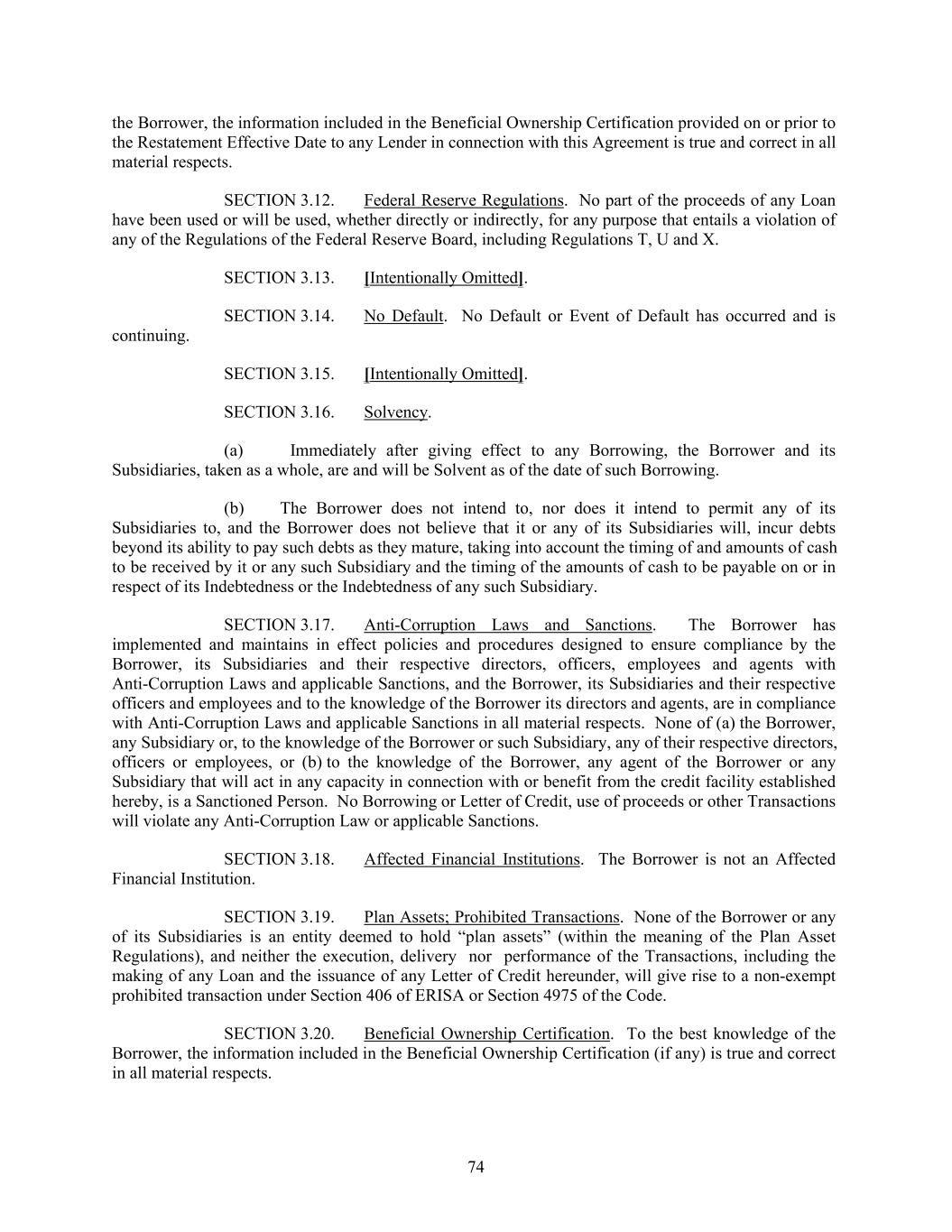the Borrower, the information included in the Beneficial Ownership Certification provided on or prior to the Restatement Effective Date to any Lender in connection with this Agreement is true and correct in all material respects. SECTION 3.12. Federal Reserve Regulations. No part of the proceeds of any Loan have been used or will be used, whether directly or indirectly, for any purpose that entails a violation of any of the Regulations of the Federal Reserve Board, including Regulations T, U and X. SECTION 3.13. [Intentionally Omitted]. SECTION 3.14. No Default. No Default or Event of Default has occurred and is continuing. SECTION 3.15. [Intentionally Omitted]. SECTION 3.16. Solvency. (a) Immediately after giving effect to any Borrowing, the Borrower and its Subsidiaries, taken as a whole, are and will be Solvent as of the date of such Borrowing. (b) The Borrower does not intend to, nor does it intend to permit any of its Subsidiaries to, and the Borrower does not believe that it or any of its Subsidiaries will, incur debts beyond its ability to pay such debts as they mature, taking into account the timing of and amounts of cash to be received by it or any such Subsidiary and the timing of the amounts of cash to be payable on or in respect of its Indebtedness or the Indebtedness of any such Subsidiary. SECTION 3.17. Anti-Corruption Laws and Sanctions. The Borrower has implemented and maintains in effect policies and procedures designed to ensure compliance by the Borrower, its Subsidiaries and their respective directors, officers, employees and agents with Anti-Corruption Laws and applicable Sanctions, and the Borrower, its Subsidiaries and their respective officers and employees and to the knowledge of the Borrower its directors and agents, are in compliance with Anti-Corruption Laws and applicable Sanctions in all material respects. None of (a) the Borrower, any Subsidiary or, to the knowledge of the Borrower or such Subsidiary, any of their respective directors, officers or employees, or (b) to the knowledge of the Borrower, any agent of the Borrower or any Subsidiary that will act in any capacity in connection with or benefit from the credit facility established hereby, is a Sanctioned Person. No Borrowing or Letter of Credit, use of proceeds or other Transactions will violate any Anti-Corruption Law or applicable Sanctions. SECTION 3.18. Affected Financial Institutions. The Borrower is not an Affected Financial Institution. SECTION 3.19. Plan Assets; Prohibited Transactions. None of the Borrower or any of its Subsidiaries is an entity deemed to hold “plan assets” (within the meaning of the Plan Asset Regulations), and neither the execution, delivery nor performance of the Transactions, including the making of any Loan and the issuance of any Letter of Credit hereunder, will give rise to a non-exempt prohibited transaction under Section 406 of ERISA or Section 4975 of the Code. SECTION 3.20. Beneficial Ownership Certification. To the best knowledge of the Borrower, the information included in the Beneficial Ownership Certification (if any) is true and correct in all material respects. 74
