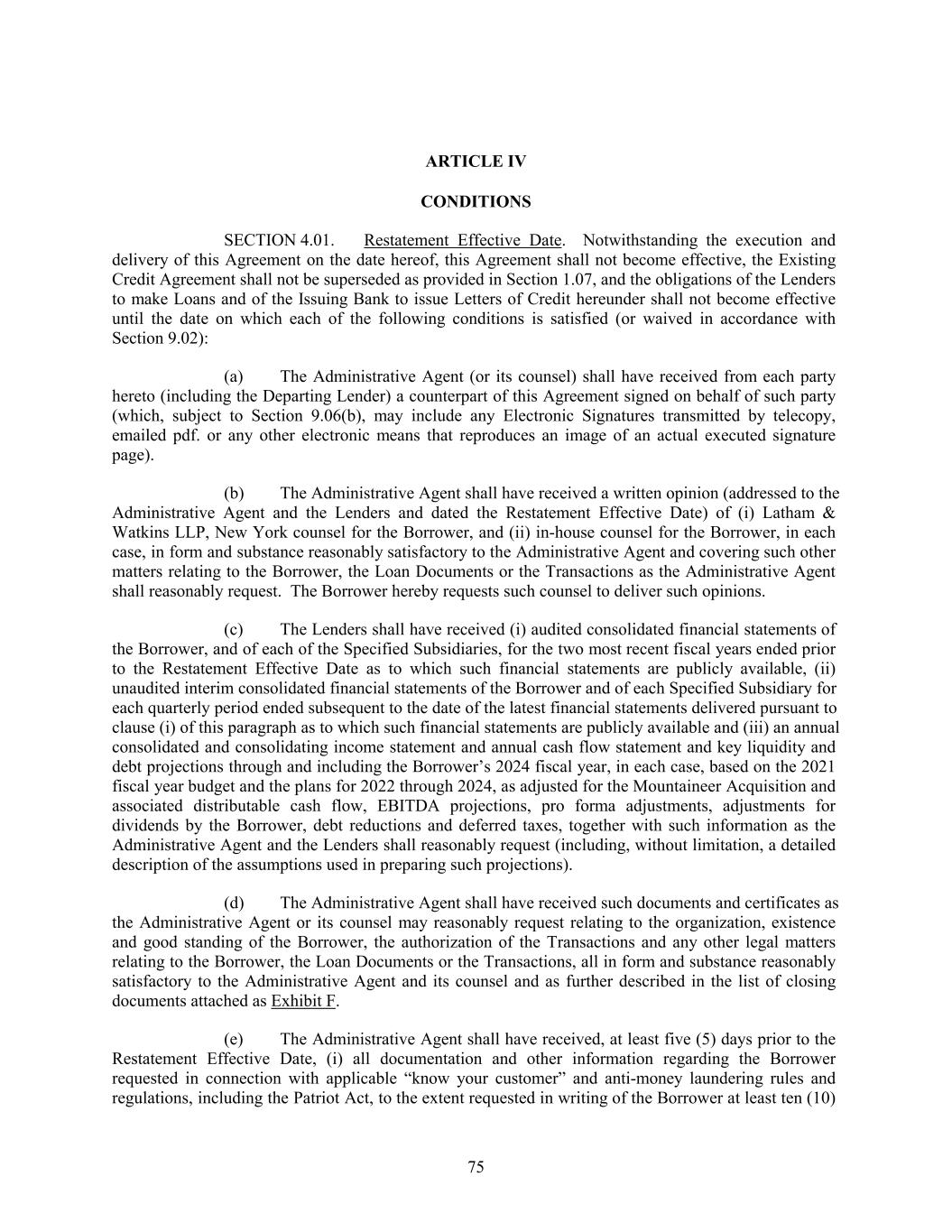 ARTICLE IV CONDITIONS SECTION 4.01. Restatement Effective Date. Notwithstanding the execution and delivery of this Agreement on the date hereof, this Agreement shall not become effective, the Existing Credit Agreement shall not be superseded as provided in Section 1.07, and the obligations of the Lenders to make Loans and of the Issuing Bank to issue Letters of Credit hereunder shall not become effective until the date on which each of the following conditions is satisfied (or waived in accordance with Section 9.02): (a) The Administrative Agent (or its counsel) shall have received from each party hereto (including the Departing Lender) a counterpart of this Agreement signed on behalf of such party (which, subject to Section 9.06(b), may include any Electronic Signatures transmitted by telecopy, emailed pdf. or any other electronic means that reproduces an image of an actual executed signature page). (b) The Administrative Agent shall have received a written opinion (addressed to the Administrative Agent and the Lenders and dated the Restatement Effective Date) of (i) Latham & Watkins LLP, New York counsel for the Borrower, and (ii) in-house counsel for the Borrower, in each case, in form and substance reasonably satisfactory to the Administrative Agent and covering such other matters relating to the Borrower, the Loan Documents or the Transactions as the Administrative Agent shall reasonably request. The Borrower hereby requests such counsel to deliver such opinions. (c) The Lenders shall have received (i) audited consolidated financial statements of the Borrower, and of each of the Specified Subsidiaries, for the two most recent fiscal years ended prior to the Restatement Effective Date as to which such financial statements are publicly available, (ii) unaudited interim consolidated financial statements of the Borrower and of each Specified Subsidiary for each quarterly period ended subsequent to the date of the latest financial statements delivered pursuant to clause (i) of this paragraph as to which such financial statements are publicly available and (iii) an annual consolidated and consolidating income statement and annual cash flow statement and key liquidity and debt projections through and including the Borrower’s 2024 fiscal year, in each case, based on the 2021 fiscal year budget and the plans for 2022 through 2024, as adjusted for the Mountaineer Acquisition and associated distributable cash flow, EBITDA projections, pro forma adjustments, adjustments for dividends by the Borrower, debt reductions and deferred taxes, together with such information as the Administrative Agent and the Lenders shall reasonably request (including, without limitation, a detailed description of the assumptions used in preparing such projections). (d) The Administrative Agent shall have received such documents and certificates as the Administrative Agent or its counsel may reasonably request relating to the organization, existence and good standing of the Borrower, the authorization of the Transactions and any other legal matters relating to the Borrower, the Loan Documents or the Transactions, all in form and substance reasonably satisfactory to the Administrative Agent and its counsel and as further described in the list of closing documents attached as Exhibit F. (e) The Administrative Agent shall have received, at least five (5) days prior to the Restatement Effective Date, (i) all documentation and other information regarding the Borrower requested in connection with applicable “know your customer” and anti-money laundering rules and regulations, including the Patriot Act, to the extent requested in writing of the Borrower at least ten (10) 75