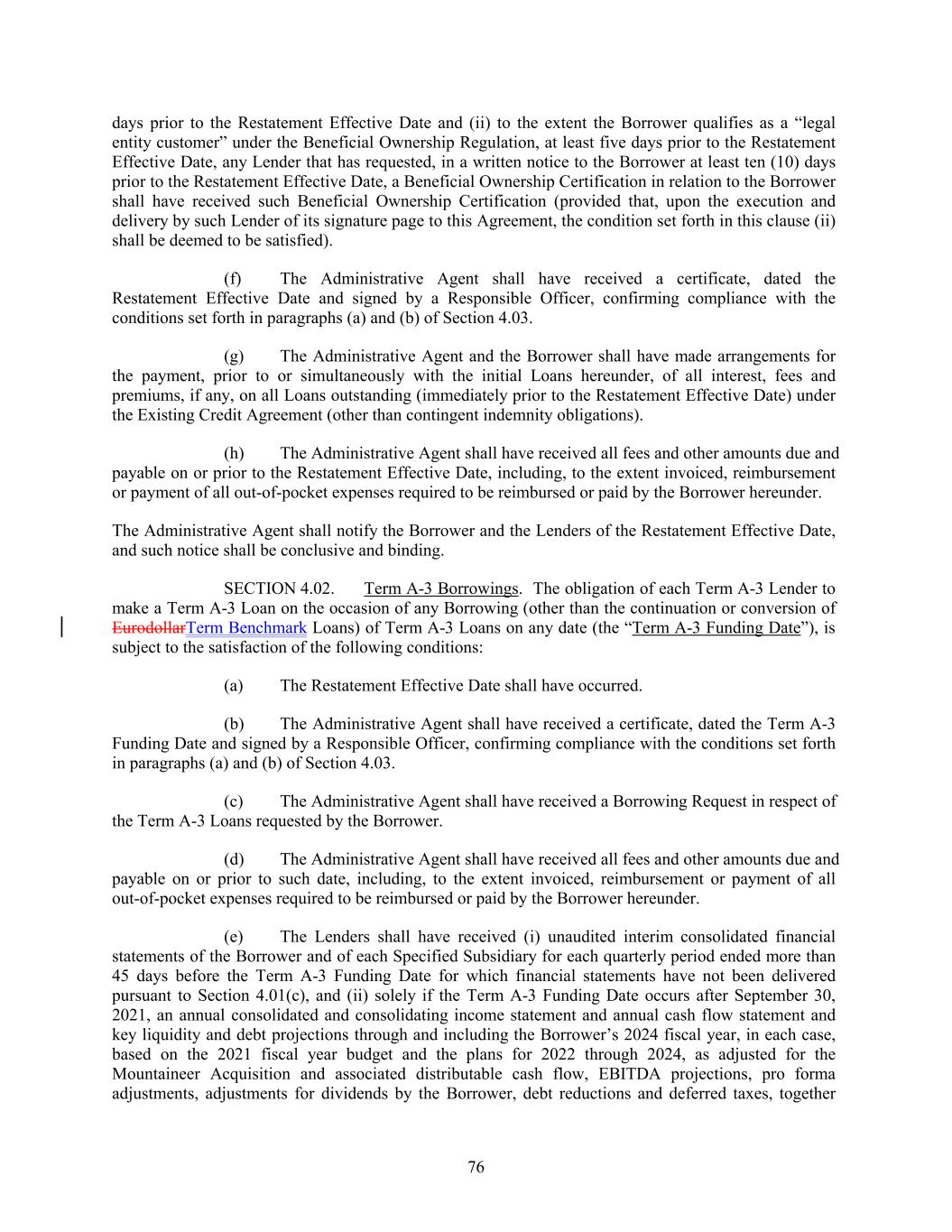 days prior to the Restatement Effective Date and (ii) to the extent the Borrower qualifies as a “legal entity customer” under the Beneficial Ownership Regulation, at least five days prior to the Restatement Effective Date, any Lender that has requested, in a written notice to the Borrower at least ten (10) days prior to the Restatement Effective Date, a Beneficial Ownership Certification in relation to the Borrower shall have received such Beneficial Ownership Certification (provided that, upon the execution and delivery by such Lender of its signature page to this Agreement, the condition set forth in this clause (ii) shall be deemed to be satisfied). (f) The Administrative Agent shall have received a certificate, dated the Restatement Effective Date and signed by a Responsible Officer, confirming compliance with the conditions set forth in paragraphs (a) and (b) of Section 4.03. (g) The Administrative Agent and the Borrower shall have made arrangements for the payment, prior to or simultaneously with the initial Loans hereunder, of all interest, fees and premiums, if any, on all Loans outstanding (immediately prior to the Restatement Effective Date) under the Existing Credit Agreement (other than contingent indemnity obligations). (h) The Administrative Agent shall have received all fees and other amounts due and payable on or prior to the Restatement Effective Date, including, to the extent invoiced, reimbursement or payment of all out-of-pocket expenses required to be reimbursed or paid by the Borrower hereunder. The Administrative Agent shall notify the Borrower and the Lenders of the Restatement Effective Date, and such notice shall be conclusive and binding. SECTION 4.02. Term A-3 Borrowings. The obligation of each Term A-3 Lender to make a Term A-3 Loan on the occasion of any Borrowing (other than the continuation or conversion of EurodollarTerm Benchmark Loans) of Term A-3 Loans on any date (the “Term A-3 Funding Date”), is subject to the satisfaction of the following conditions: (a) The Restatement Effective Date shall have occurred. (b) The Administrative Agent shall have received a certificate, dated the Term A-3 Funding Date and signed by a Responsible Officer, confirming compliance with the conditions set forth in paragraphs (a) and (b) of Section 4.03. (c) The Administrative Agent shall have received a Borrowing Request in respect of the Term A-3 Loans requested by the Borrower. (d) The Administrative Agent shall have received all fees and other amounts due and payable on or prior to such date, including, to the extent invoiced, reimbursement or payment of all out-of-pocket expenses required to be reimbursed or paid by the Borrower hereunder. (e) The Lenders shall have received (i) unaudited interim consolidated financial statements of the Borrower and of each Specified Subsidiary for each quarterly period ended more than 45 days before the Term A-3 Funding Date for which financial statements have not been delivered pursuant to Section 4.01(c), and (ii) solely if the Term A-3 Funding Date occurs after September 30, 2021, an annual consolidated and consolidating income statement and annual cash flow statement and key liquidity and debt projections through and including the Borrower’s 2024 fiscal year, in each case, based on the 2021 fiscal year budget and the plans for 2022 through 2024, as adjusted for the Mountaineer Acquisition and associated distributable cash flow, EBITDA projections, pro forma adjustments, adjustments for dividends by the Borrower, debt reductions and deferred taxes, together 76