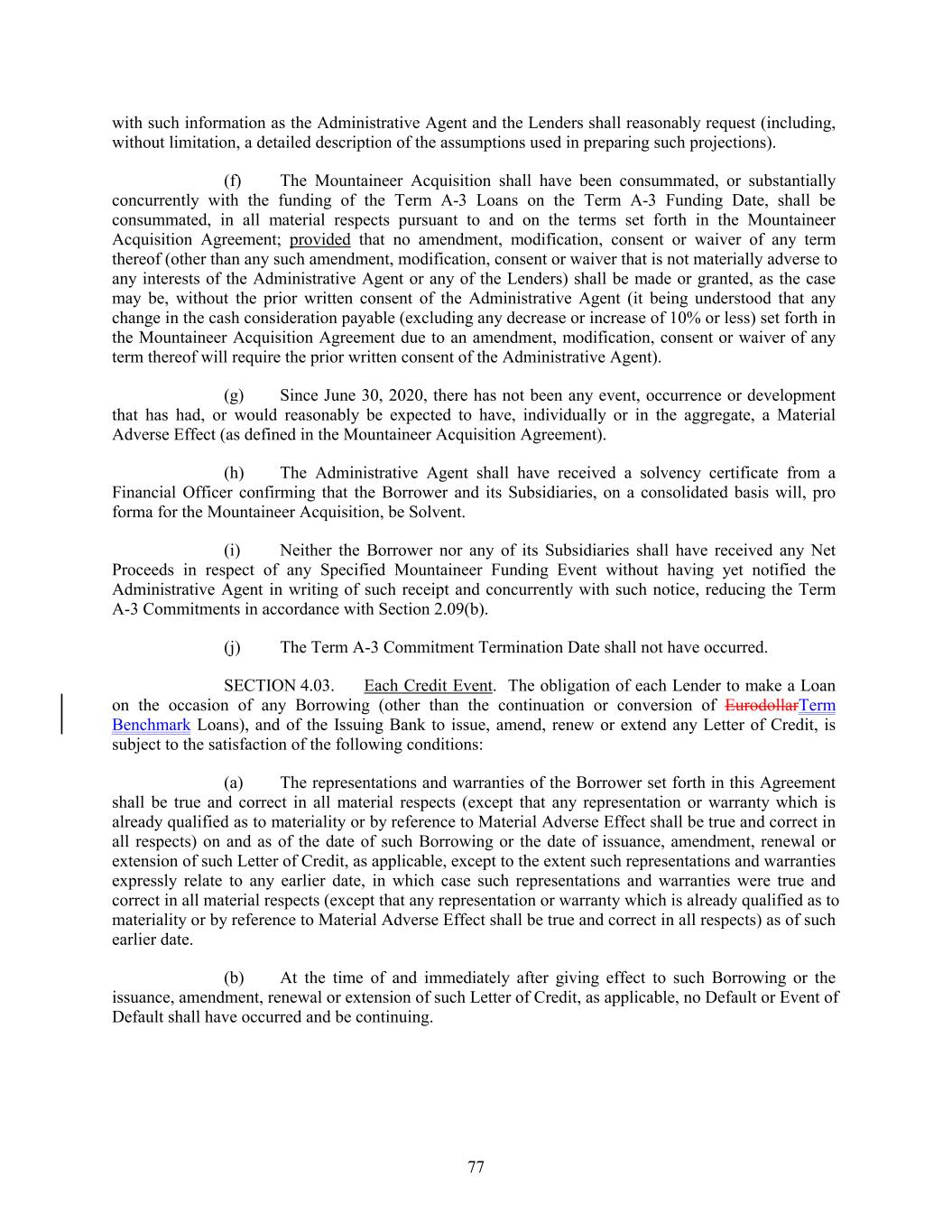 with such information as the Administrative Agent and the Lenders shall reasonably request (including, without limitation, a detailed description of the assumptions used in preparing such projections). (f) The Mountaineer Acquisition shall have been consummated, or substantially concurrently with the funding of the Term A-3 Loans on the Term A-3 Funding Date, shall be consummated, in all material respects pursuant to and on the terms set forth in the Mountaineer Acquisition Agreement; provided that no amendment, modification, consent or waiver of any term thereof (other than any such amendment, modification, consent or waiver that is not materially adverse to any interests of the Administrative Agent or any of the Lenders) shall be made or granted, as the case may be, without the prior written consent of the Administrative Agent (it being understood that any change in the cash consideration payable (excluding any decrease or increase of 10% or less) set forth in the Mountaineer Acquisition Agreement due to an amendment, modification, consent or waiver of any term thereof will require the prior written consent of the Administrative Agent). (g) Since June 30, 2020, there has not been any event, occurrence or development that has had, or would reasonably be expected to have, individually or in the aggregate, a Material Adverse Effect (as defined in the Mountaineer Acquisition Agreement). (h) The Administrative Agent shall have received a solvency certificate from a Financial Officer confirming that the Borrower and its Subsidiaries, on a consolidated basis will, pro forma for the Mountaineer Acquisition, be Solvent. (i) Neither the Borrower nor any of its Subsidiaries shall have received any Net Proceeds in respect of any Specified Mountaineer Funding Event without having yet notified the Administrative Agent in writing of such receipt and concurrently with such notice, reducing the Term A-3 Commitments in accordance with Section 2.09(b). (j) The Term A-3 Commitment Termination Date shall not have occurred. SECTION 4.03. Each Credit Event. The obligation of each Lender to make a Loan on the occasion of any Borrowing (other than the continuation or conversion of EurodollarTerm Benchmark Loans), and of the Issuing Bank to issue, amend, renew or extend any Letter of Credit, is subject to the satisfaction of the following conditions: (a) The representations and warranties of the Borrower set forth in this Agreement shall be true and correct in all material respects (except that any representation or warranty which is already qualified as to materiality or by reference to Material Adverse Effect shall be true and correct in all respects) on and as of the date of such Borrowing or the date of issuance, amendment, renewal or extension of such Letter of Credit, as applicable, except to the extent such representations and warranties expressly relate to any earlier date, in which case such representations and warranties were true and correct in all material respects (except that any representation or warranty which is already qualified as to materiality or by reference to Material Adverse Effect shall be true and correct in all respects) as of such earlier date. (b) At the time of and immediately after giving effect to such Borrowing or the issuance, amendment, renewal or extension of such Letter of Credit, as applicable, no Default or Event of Default shall have occurred and be continuing. 77