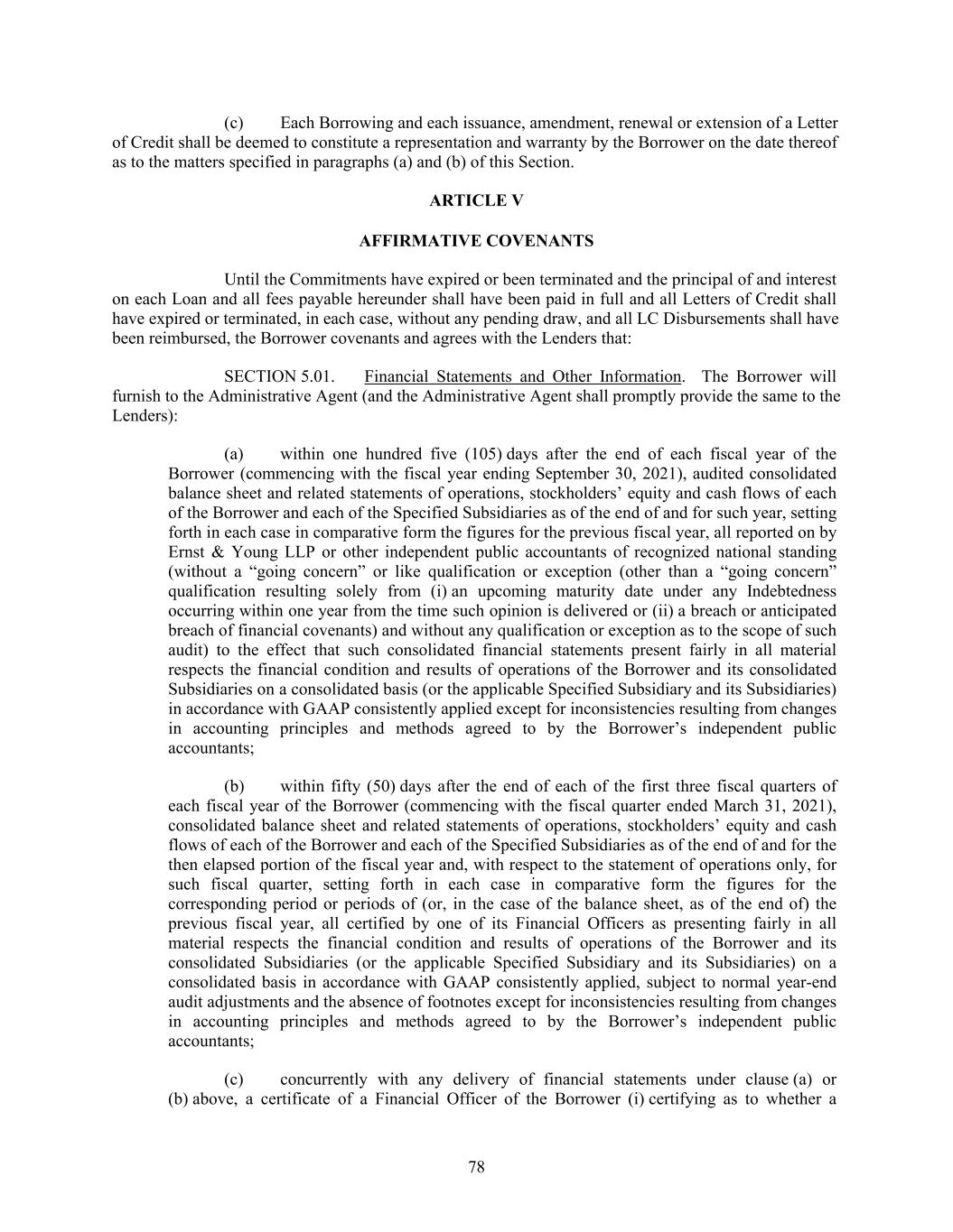 (c) Each Borrowing and each issuance, amendment, renewal or extension of a Letter of Credit shall be deemed to constitute a representation and warranty by the Borrower on the date thereof as to the matters specified in paragraphs (a) and (b) of this Section. ARTICLE V AFFIRMATIVE COVENANTS Until the Commitments have expired or been terminated and the principal of and interest on each Loan and all fees payable hereunder shall have been paid in full and all Letters of Credit shall have expired or terminated, in each case, without any pending draw, and all LC Disbursements shall have been reimbursed, the Borrower covenants and agrees with the Lenders that: SECTION 5.01. Financial Statements and Other Information. The Borrower will furnish to the Administrative Agent (and the Administrative Agent shall promptly provide the same to the Lenders): (a) within one hundred five (105) days after the end of each fiscal year of the Borrower (commencing with the fiscal year ending September 30, 2021), audited consolidated balance sheet and related statements of operations, stockholders’ equity and cash flows of each of the Borrower and each of the Specified Subsidiaries as of the end of and for such year, setting forth in each case in comparative form the figures for the previous fiscal year, all reported on by Ernst & Young LLP or other independent public accountants of recognized national standing (without a “going concern” or like qualification or exception (other than a “going concern” qualification resulting solely from (i) an upcoming maturity date under any Indebtedness occurring within one year from the time such opinion is delivered or (ii) a breach or anticipated breach of financial covenants) and without any qualification or exception as to the scope of such audit) to the effect that such consolidated financial statements present fairly in all material respects the financial condition and results of operations of the Borrower and its consolidated Subsidiaries on a consolidated basis (or the applicable Specified Subsidiary and its Subsidiaries) in accordance with GAAP consistently applied except for inconsistencies resulting from changes in accounting principles and methods agreed to by the Borrower’s independent public accountants; (b) within fifty (50) days after the end of each of the first three fiscal quarters of each fiscal year of the Borrower (commencing with the fiscal quarter ended March 31, 2021), consolidated balance sheet and related statements of operations, stockholders’ equity and cash flows of each of the Borrower and each of the Specified Subsidiaries as of the end of and for the then elapsed portion of the fiscal year and, with respect to the statement of operations only, for such fiscal quarter, setting forth in each case in comparative form the figures for the corresponding period or periods of (or, in the case of the balance sheet, as of the end of) the previous fiscal year, all certified by one of its Financial Officers as presenting fairly in all material respects the financial condition and results of operations of the Borrower and its consolidated Subsidiaries (or the applicable Specified Subsidiary and its Subsidiaries) on a consolidated basis in accordance with GAAP consistently applied, subject to normal year-end audit adjustments and the absence of footnotes except for inconsistencies resulting from changes in accounting principles and methods agreed to by the Borrower’s independent public accountants; (c) concurrently with any delivery of financial statements under clause (a) or (b) above, a certificate of a Financial Officer of the Borrower (i) certifying as to whether a 78