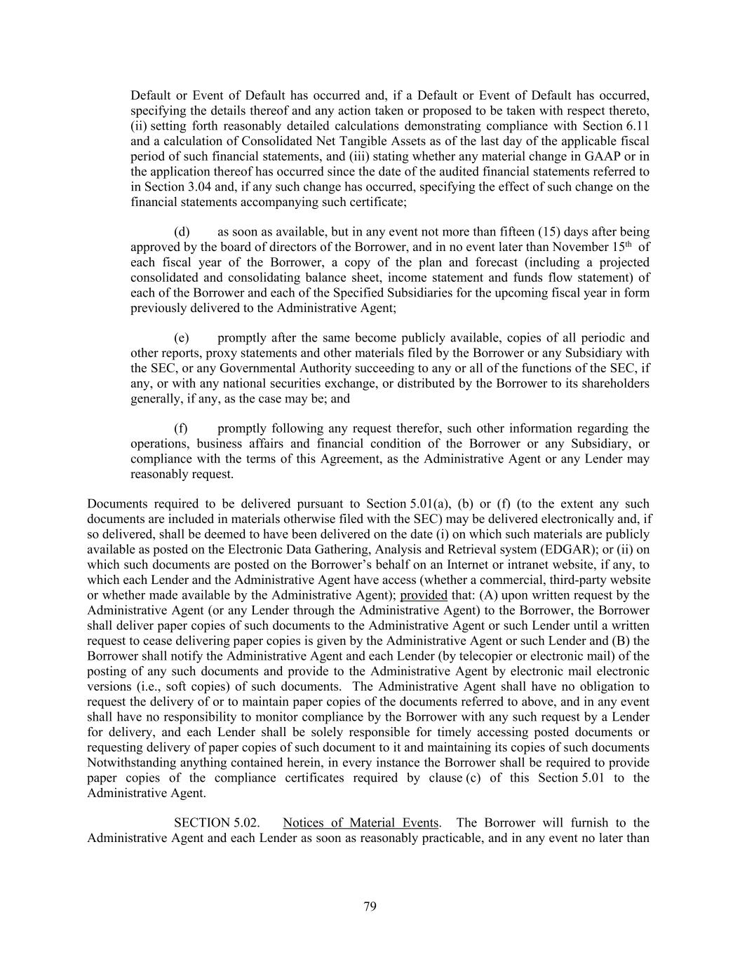 Default or Event of Default has occurred and, if a Default or Event of Default has occurred, specifying the details thereof and any action taken or proposed to be taken with respect thereto, (ii) setting forth reasonably detailed calculations demonstrating compliance with Section 6.11 and a calculation of Consolidated Net Tangible Assets as of the last day of the applicable fiscal period of such financial statements, and (iii) stating whether any material change in GAAP or in the application thereof has occurred since the date of the audited financial statements referred to in Section 3.04 and, if any such change has occurred, specifying the effect of such change on the financial statements accompanying such certificate; (d) as soon as available, but in any event not more than fifteen (15) days after being approved by the board of directors of the Borrower, and in no event later than November 15th of each fiscal year of the Borrower, a copy of the plan and forecast (including a projected consolidated and consolidating balance sheet, income statement and funds flow statement) of each of the Borrower and each of the Specified Subsidiaries for the upcoming fiscal year in form previously delivered to the Administrative Agent; (e) promptly after the same become publicly available, copies of all periodic and other reports, proxy statements and other materials filed by the Borrower or any Subsidiary with the SEC, or any Governmental Authority succeeding to any or all of the functions of the SEC, if any, or with any national securities exchange, or distributed by the Borrower to its shareholders generally, if any, as the case may be; and (f) promptly following any request therefor, such other information regarding the operations, business affairs and financial condition of the Borrower or any Subsidiary, or compliance with the terms of this Agreement, as the Administrative Agent or any Lender may reasonably request. Documents required to be delivered pursuant to Section 5.01(a), (b) or (f) (to the extent any such documents are included in materials otherwise filed with the SEC) may be delivered electronically and, if so delivered, shall be deemed to have been delivered on the date (i) on which such materials are publicly available as posted on the Electronic Data Gathering, Analysis and Retrieval system (EDGAR); or (ii) on which such documents are posted on the Borrower’s behalf on an Internet or intranet website, if any, to which each Lender and the Administrative Agent have access (whether a commercial, third-party website or whether made available by the Administrative Agent); provided that: (A) upon written request by the Administrative Agent (or any Lender through the Administrative Agent) to the Borrower, the Borrower shall deliver paper copies of such documents to the Administrative Agent or such Lender until a written request to cease delivering paper copies is given by the Administrative Agent or such Lender and (B) the Borrower shall notify the Administrative Agent and each Lender (by telecopier or electronic mail) of the posting of any such documents and provide to the Administrative Agent by electronic mail electronic versions (i.e., soft copies) of such documents. The Administrative Agent shall have no obligation to request the delivery of or to maintain paper copies of the documents referred to above, and in any event shall have no responsibility to monitor compliance by the Borrower with any such request by a Lender for delivery, and each Lender shall be solely responsible for timely accessing posted documents or requesting delivery of paper copies of such document to it and maintaining its copies of such documents Notwithstanding anything contained herein, in every instance the Borrower shall be required to provide paper copies of the compliance certificates required by clause (c) of this Section 5.01 to the Administrative Agent. SECTION 5.02. Notices of Material Events. The Borrower will furnish to the Administrative Agent and each Lender as soon as reasonably practicable, and in any event no later than 79