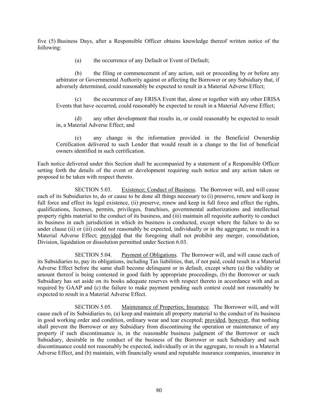 five (5) Business Days, after a Responsible Officer obtains knowledge thereof written notice of the following: (a) the occurrence of any Default or Event of Default; (b) the filing or commencement of any action, suit or proceeding by or before any arbitrator or Governmental Authority against or affecting the Borrower or any Subsidiary that, if adversely determined, could reasonably be expected to result in a Material Adverse Effect; (c) the occurrence of any ERISA Event that, alone or together with any other ERISA Events that have occurred, could reasonably be expected to result in a Material Adverse Effect; (d) any other development that results in, or could reasonably be expected to result in, a Material Adverse Effect; and (e) any change in the information provided in the Beneficial Ownership Certification delivered to such Lender that would result in a change to the list of beneficial owners identified in such certification. Each notice delivered under this Section shall be accompanied by a statement of a Responsible Officer setting forth the details of the event or development requiring such notice and any action taken or proposed to be taken with respect thereto. SECTION 5.03. Existence; Conduct of Business. The Borrower will, and will cause each of its Subsidiaries to, do or cause to be done all things necessary to (i) preserve, renew and keep in full force and effect its legal existence, (ii) preserve, renew and keep in full force and effect the rights, qualifications, licenses, permits, privileges, franchises, governmental authorizations and intellectual property rights material to the conduct of its business, and (iii) maintain all requisite authority to conduct its business in each jurisdiction in which its business is conducted, except where the failure to do so under clause (ii) or (iii) could not reasonably be expected, individually or in the aggregate, to result in a Material Adverse Effect; provided that the foregoing shall not prohibit any merger, consolidation, Division, liquidation or dissolution permitted under Section 6.03. SECTION 5.04. Payment of Obligations. The Borrower will, and will cause each of its Subsidiaries to, pay its obligations, including Tax liabilities, that, if not paid, could result in a Material Adverse Effect before the same shall become delinquent or in default, except where (a) the validity or amount thereof is being contested in good faith by appropriate proceedings, (b) the Borrower or such Subsidiary has set aside on its books adequate reserves with respect thereto in accordance with and as required by GAAP and (c) the failure to make payment pending such contest could not reasonably be expected to result in a Material Adverse Effect. SECTION 5.05. Maintenance of Properties; Insurance. The Borrower will, and will cause each of its Subsidiaries to, (a) keep and maintain all property material to the conduct of its business in good working order and condition, ordinary wear and tear excepted; provided, however, that nothing shall prevent the Borrower or any Subsidiary from discontinuing the operation or maintenance of any property if such discontinuance is, in the reasonable business judgment of the Borrower or such Subsidiary, desirable in the conduct of the business of the Borrower or such Subsidiary and such discontinuance could not reasonably be expected, individually or in the aggregate, to result in a Material Adverse Effect, and (b) maintain, with financially sound and reputable insurance companies, insurance in 80