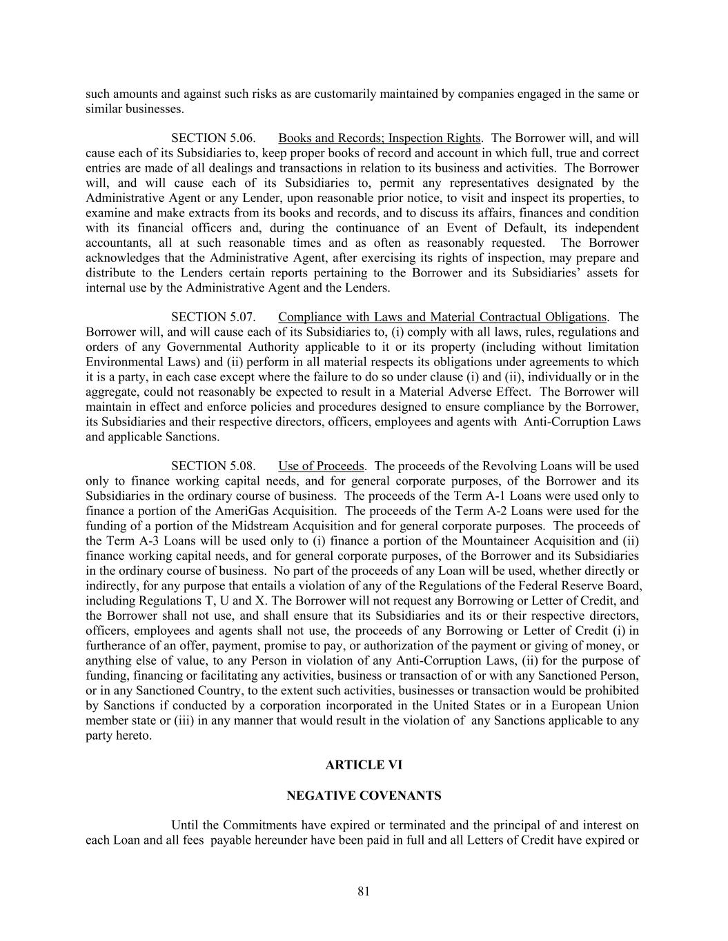 such amounts and against such risks as are customarily maintained by companies engaged in the same or similar businesses. SECTION 5.06. Books and Records; Inspection Rights. The Borrower will, and will cause each of its Subsidiaries to, keep proper books of record and account in which full, true and correct entries are made of all dealings and transactions in relation to its business and activities. The Borrower will, and will cause each of its Subsidiaries to, permit any representatives designated by the Administrative Agent or any Lender, upon reasonable prior notice, to visit and inspect its properties, to examine and make extracts from its books and records, and to discuss its affairs, finances and condition with its financial officers and, during the continuance of an Event of Default, its independent accountants, all at such reasonable times and as often as reasonably requested. The Borrower acknowledges that the Administrative Agent, after exercising its rights of inspection, may prepare and distribute to the Lenders certain reports pertaining to the Borrower and its Subsidiaries’ assets for internal use by the Administrative Agent and the Lenders. SECTION 5.07. Compliance with Laws and Material Contractual Obligations. The Borrower will, and will cause each of its Subsidiaries to, (i) comply with all laws, rules, regulations and orders of any Governmental Authority applicable to it or its property (including without limitation Environmental Laws) and (ii) perform in all material respects its obligations under agreements to which it is a party, in each case except where the failure to do so under clause (i) and (ii), individually or in the aggregate, could not reasonably be expected to result in a Material Adverse Effect. The Borrower will maintain in effect and enforce policies and procedures designed to ensure compliance by the Borrower, its Subsidiaries and their respective directors, officers, employees and agents with Anti-Corruption Laws and applicable Sanctions. SECTION 5.08. Use of Proceeds. The proceeds of the Revolving Loans will be used only to finance working capital needs, and for general corporate purposes, of the Borrower and its Subsidiaries in the ordinary course of business. The proceeds of the Term A-1 Loans were used only to finance a portion of the AmeriGas Acquisition. The proceeds of the Term A-2 Loans were used for the funding of a portion of the Midstream Acquisition and for general corporate purposes. The proceeds of the Term A-3 Loans will be used only to (i) finance a portion of the Mountaineer Acquisition and (ii) finance working capital needs, and for general corporate purposes, of the Borrower and its Subsidiaries in the ordinary course of business. No part of the proceeds of any Loan will be used, whether directly or indirectly, for any purpose that entails a violation of any of the Regulations of the Federal Reserve Board, including Regulations T, U and X. The Borrower will not request any Borrowing or Letter of Credit, and the Borrower shall not use, and shall ensure that its Subsidiaries and its or their respective directors, officers, employees and agents shall not use, the proceeds of any Borrowing or Letter of Credit (i) in furtherance of an offer, payment, promise to pay, or authorization of the payment or giving of money, or anything else of value, to any Person in violation of any Anti-Corruption Laws, (ii) for the purpose of funding, financing or facilitating any activities, business or transaction of or with any Sanctioned Person, or in any Sanctioned Country, to the extent such activities, businesses or transaction would be prohibited by Sanctions if conducted by a corporation incorporated in the United States or in a European Union member state or (iii) in any manner that would result in the violation of any Sanctions applicable to any party hereto. ARTICLE VI NEGATIVE COVENANTS Until the Commitments have expired or terminated and the principal of and interest on each Loan and all fees payable hereunder have been paid in full and all Letters of Credit have expired or 81