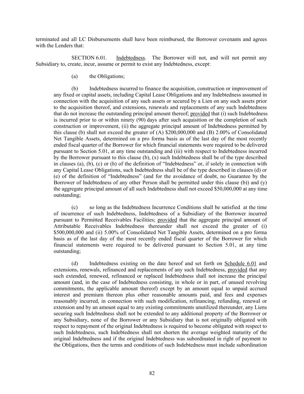 terminated and all LC Disbursements shall have been reimbursed, the Borrower covenants and agrees with the Lenders that: SECTION 6.01. Indebtedness. The Borrower will not, and will not permit any Subsidiary to, create, incur, assume or permit to exist any Indebtedness, except: (a) the Obligations; (b) Indebtedness incurred to finance the acquisition, construction or improvement of any fixed or capital assets, including Capital Lease Obligations and any Indebtedness assumed in connection with the acquisition of any such assets or secured by a Lien on any such assets prior to the acquisition thereof, and extensions, renewals and replacements of any such Indebtedness that do not increase the outstanding principal amount thereof; provided that (i) such Indebtedness is incurred prior to or within ninety (90) days after such acquisition or the completion of such construction or improvement, (ii) the aggregate principal amount of Indebtedness permitted by this clause (b) shall not exceed the greater of (A) $200,000,000 and (B) 2.00% of Consolidated Net Tangible Assets, determined on a pro forma basis as of the last day of the most recently ended fiscal quarter of the Borrower for which financial statements were required to be delivered pursuant to Section 5.01, at any time outstanding and (iii) with respect to Indebtedness incurred by the Borrower pursuant to this clause (b), (x) such Indebtedness shall be of the type described in clauses (a), (b), (c) or (h) of the definition of “Indebtedness” or, if solely in connection with any Capital Lease Obligations, such Indebtedness shall be of the type described in clauses (d) or (e) of the definition of “Indebtedness” (and for the avoidance of doubt, no Guarantee by the Borrower of Indebtedness of any other Person shall be permitted under this clause (b)) and (y) the aggregate principal amount of all such Indebtedness shall not exceed $50,000,000 at any time outstanding; (c) so long as the Indebtedness Incurrence Conditions shall be satisfied at the time of incurrence of such Indebtedness, Indebtedness of a Subsidiary of the Borrower incurred pursuant to Permitted Receivables Facilities; provided that the aggregate principal amount of Attributable Receivables Indebtedness thereunder shall not exceed the greater of (i) $500,000,000 and (ii) 5.00% of Consolidated Net Tangible Assets, determined on a pro forma basis as of the last day of the most recently ended fiscal quarter of the Borrower for which financial statements were required to be delivered pursuant to Section 5.01, at any time outstanding; (d) Indebtedness existing on the date hereof and set forth on Schedule 6.01 and extensions, renewals, refinanced and replacements of any such Indebtedness, provided that any such extended, renewed, refinanced or replaced Indebtedness shall not increase the principal amount (and, in the case of Indebtedness consisting, in whole or in part, of unused revolving commitments, the applicable amount thereof) except by an amount equal to unpaid accrued interest and premium thereon plus other reasonable amounts paid, and fees and expenses reasonably incurred, in connection with such modification, refinancing, refunding, renewal or extension and by an amount equal to any existing commitments unutilized thereunder, any Liens securing such Indebtedness shall not be extended to any additional property of the Borrower or any Subsidiary, none of the Borrower or any Subsidiary that is not originally obligated with respect to repayment of the original Indebtedness is required to become obligated with respect to such Indebtedness, such Indebtedness shall not shorten the average weighted maturity of the original Indebtedness and if the original Indebtedness was subordinated in right of payment to the Obligations, then the terms and conditions of such Indebtedness must include subordination 82
