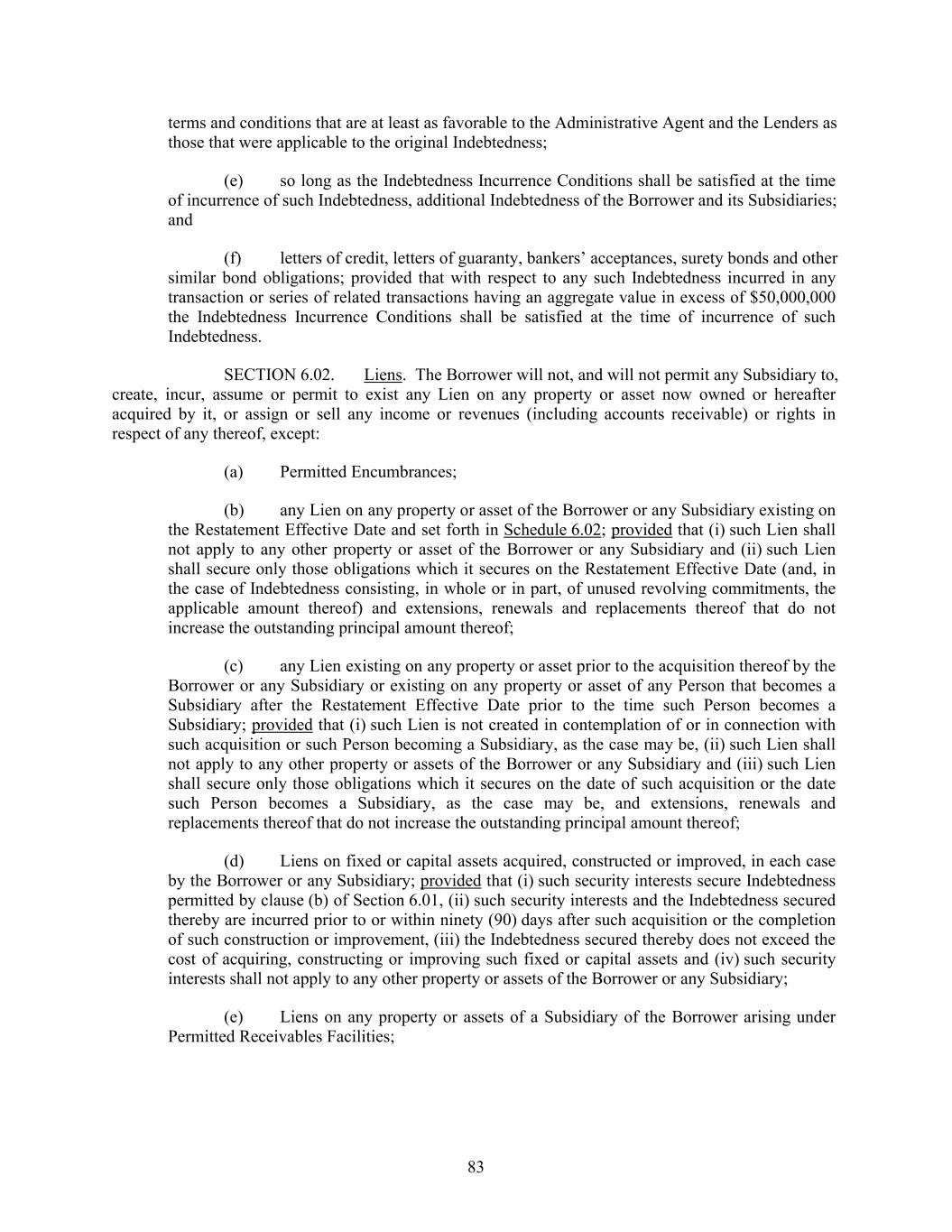 terms and conditions that are at least as favorable to the Administrative Agent and the Lenders as those that were applicable to the original Indebtedness; (e) so long as the Indebtedness Incurrence Conditions shall be satisfied at the time of incurrence of such Indebtedness, additional Indebtedness of the Borrower and its Subsidiaries; and (f) letters of credit, letters of guaranty, bankers’ acceptances, surety bonds and other similar bond obligations; provided that with respect to any such Indebtedness incurred in any transaction or series of related transactions having an aggregate value in excess of $50,000,000 the Indebtedness Incurrence Conditions shall be satisfied at the time of incurrence of such Indebtedness. SECTION 6.02. Liens. The Borrower will not, and will not permit any Subsidiary to, create, incur, assume or permit to exist any Lien on any property or asset now owned or hereafter acquired by it, or assign or sell any income or revenues (including accounts receivable) or rights in respect of any thereof, except: (a) Permitted Encumbrances; (b) any Lien on any property or asset of the Borrower or any Subsidiary existing on the Restatement Effective Date and set forth in Schedule 6.02; provided that (i) such Lien shall not apply to any other property or asset of the Borrower or any Subsidiary and (ii) such Lien shall secure only those obligations which it secures on the Restatement Effective Date (and, in the case of Indebtedness consisting, in whole or in part, of unused revolving commitments, the applicable amount thereof) and extensions, renewals and replacements thereof that do not increase the outstanding principal amount thereof; (c) any Lien existing on any property or asset prior to the acquisition thereof by the Borrower or any Subsidiary or existing on any property or asset of any Person that becomes a Subsidiary after the Restatement Effective Date prior to the time such Person becomes a Subsidiary; provided that (i) such Lien is not created in contemplation of or in connection with such acquisition or such Person becoming a Subsidiary, as the case may be, (ii) such Lien shall not apply to any other property or assets of the Borrower or any Subsidiary and (iii) such Lien shall secure only those obligations which it secures on the date of such acquisition or the date such Person becomes a Subsidiary, as the case may be, and extensions, renewals and replacements thereof that do not increase the outstanding principal amount thereof; (d) Liens on fixed or capital assets acquired, constructed or improved, in each case by the Borrower or any Subsidiary; provided that (i) such security interests secure Indebtedness permitted by clause (b) of Section 6.01, (ii) such security interests and the Indebtedness secured thereby are incurred prior to or within ninety (90) days after such acquisition or the completion of such construction or improvement, (iii) the Indebtedness secured thereby does not exceed the cost of acquiring, constructing or improving such fixed or capital assets and (iv) such security interests shall not apply to any other property or assets of the Borrower or any Subsidiary; (e) Liens on any property or assets of a Subsidiary of the Borrower arising under Permitted Receivables Facilities; 83
