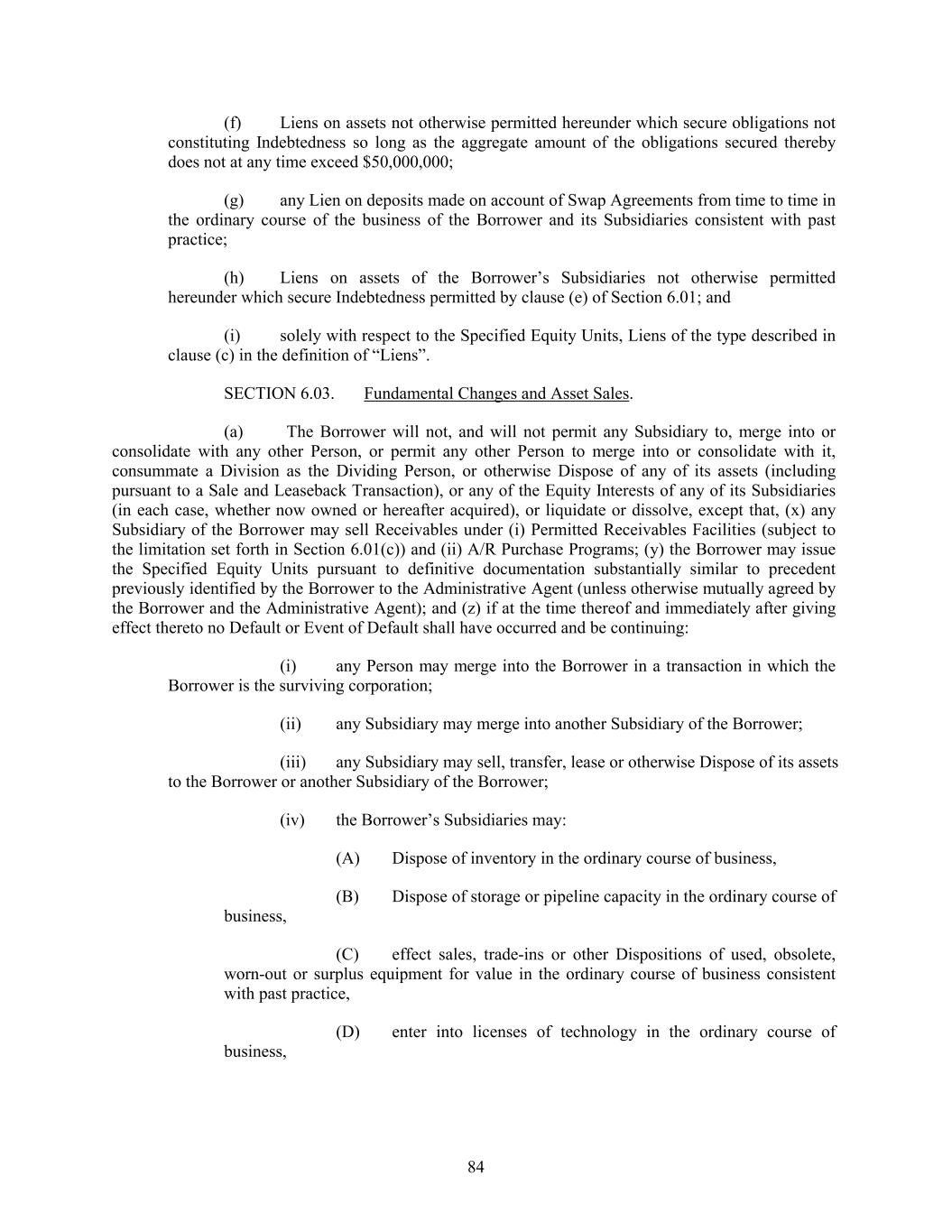 (f) Liens on assets not otherwise permitted hereunder which secure obligations not constituting Indebtedness so long as the aggregate amount of the obligations secured thereby does not at any time exceed $50,000,000; (g) any Lien on deposits made on account of Swap Agreements from time to time in the ordinary course of the business of the Borrower and its Subsidiaries consistent with past practice; (h) Liens on assets of the Borrower’s Subsidiaries not otherwise permitted hereunder which secure Indebtedness permitted by clause (e) of Section 6.01; and (i) solely with respect to the Specified Equity Units, Liens of the type described in clause (c) in the definition of “Liens”. SECTION 6.03. Fundamental Changes and Asset Sales. (a) The Borrower will not, and will not permit any Subsidiary to, merge into or consolidate with any other Person, or permit any other Person to merge into or consolidate with it, consummate a Division as the Dividing Person, or otherwise Dispose of any of its assets (including pursuant to a Sale and Leaseback Transaction), or any of the Equity Interests of any of its Subsidiaries (in each case, whether now owned or hereafter acquired), or liquidate or dissolve, except that, (x) any Subsidiary of the Borrower may sell Receivables under (i) Permitted Receivables Facilities (subject to the limitation set forth in Section 6.01(c)) and (ii) A/R Purchase Programs; (y) the Borrower may issue the Specified Equity Units pursuant to definitive documentation substantially similar to precedent previously identified by the Borrower to the Administrative Agent (unless otherwise mutually agreed by the Borrower and the Administrative Agent); and (z) if at the time thereof and immediately after giving effect thereto no Default or Event of Default shall have occurred and be continuing: (i) any Person may merge into the Borrower in a transaction in which the Borrower is the surviving corporation; (ii) any Subsidiary may merge into another Subsidiary of the Borrower; (iii) any Subsidiary may sell, transfer, lease or otherwise Dispose of its assets to the Borrower or another Subsidiary of the Borrower; (iv) the Borrower’s Subsidiaries may: (A) Dispose of inventory in the ordinary course of business, (B) Dispose of storage or pipeline capacity in the ordinary course of business, (C) effect sales, trade-ins or other Dispositions of used, obsolete, worn-out or surplus equipment for value in the ordinary course of business consistent with past practice, (D) enter into licenses of technology in the ordinary course of business, 84