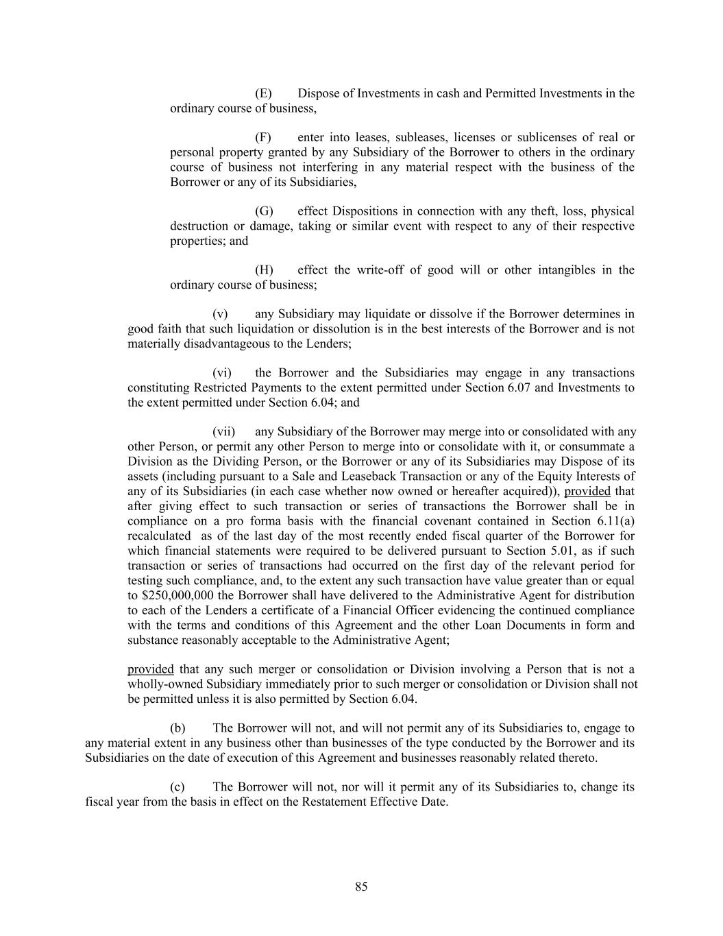 (E) Dispose of Investments in cash and Permitted Investments in the ordinary course of business, (F) enter into leases, subleases, licenses or sublicenses of real or personal property granted by any Subsidiary of the Borrower to others in the ordinary course of business not interfering in any material respect with the business of the Borrower or any of its Subsidiaries, (G) effect Dispositions in connection with any theft, loss, physical destruction or damage, taking or similar event with respect to any of their respective properties; and (H) effect the write-off of good will or other intangibles in the ordinary course of business; (v) any Subsidiary may liquidate or dissolve if the Borrower determines in good faith that such liquidation or dissolution is in the best interests of the Borrower and is not materially disadvantageous to the Lenders; (vi) the Borrower and the Subsidiaries may engage in any transactions constituting Restricted Payments to the extent permitted under Section 6.07 and Investments to the extent permitted under Section 6.04; and (vii) any Subsidiary of the Borrower may merge into or consolidated with any other Person, or permit any other Person to merge into or consolidate with it, or consummate a Division as the Dividing Person, or the Borrower or any of its Subsidiaries may Dispose of its assets (including pursuant to a Sale and Leaseback Transaction or any of the Equity Interests of any of its Subsidiaries (in each case whether now owned or hereafter acquired)), provided that after giving effect to such transaction or series of transactions the Borrower shall be in compliance on a pro forma basis with the financial covenant contained in Section 6.11(a) recalculated as of the last day of the most recently ended fiscal quarter of the Borrower for which financial statements were required to be delivered pursuant to Section 5.01, as if such transaction or series of transactions had occurred on the first day of the relevant period for testing such compliance, and, to the extent any such transaction have value greater than or equal to $250,000,000 the Borrower shall have delivered to the Administrative Agent for distribution to each of the Lenders a certificate of a Financial Officer evidencing the continued compliance with the terms and conditions of this Agreement and the other Loan Documents in form and substance reasonably acceptable to the Administrative Agent; provided that any such merger or consolidation or Division involving a Person that is not a wholly-owned Subsidiary immediately prior to such merger or consolidation or Division shall not be permitted unless it is also permitted by Section 6.04. (b) The Borrower will not, and will not permit any of its Subsidiaries to, engage to any material extent in any business other than businesses of the type conducted by the Borrower and its Subsidiaries on the date of execution of this Agreement and businesses reasonably related thereto. (c) The Borrower will not, nor will it permit any of its Subsidiaries to, change its fiscal year from the basis in effect on the Restatement Effective Date. 85