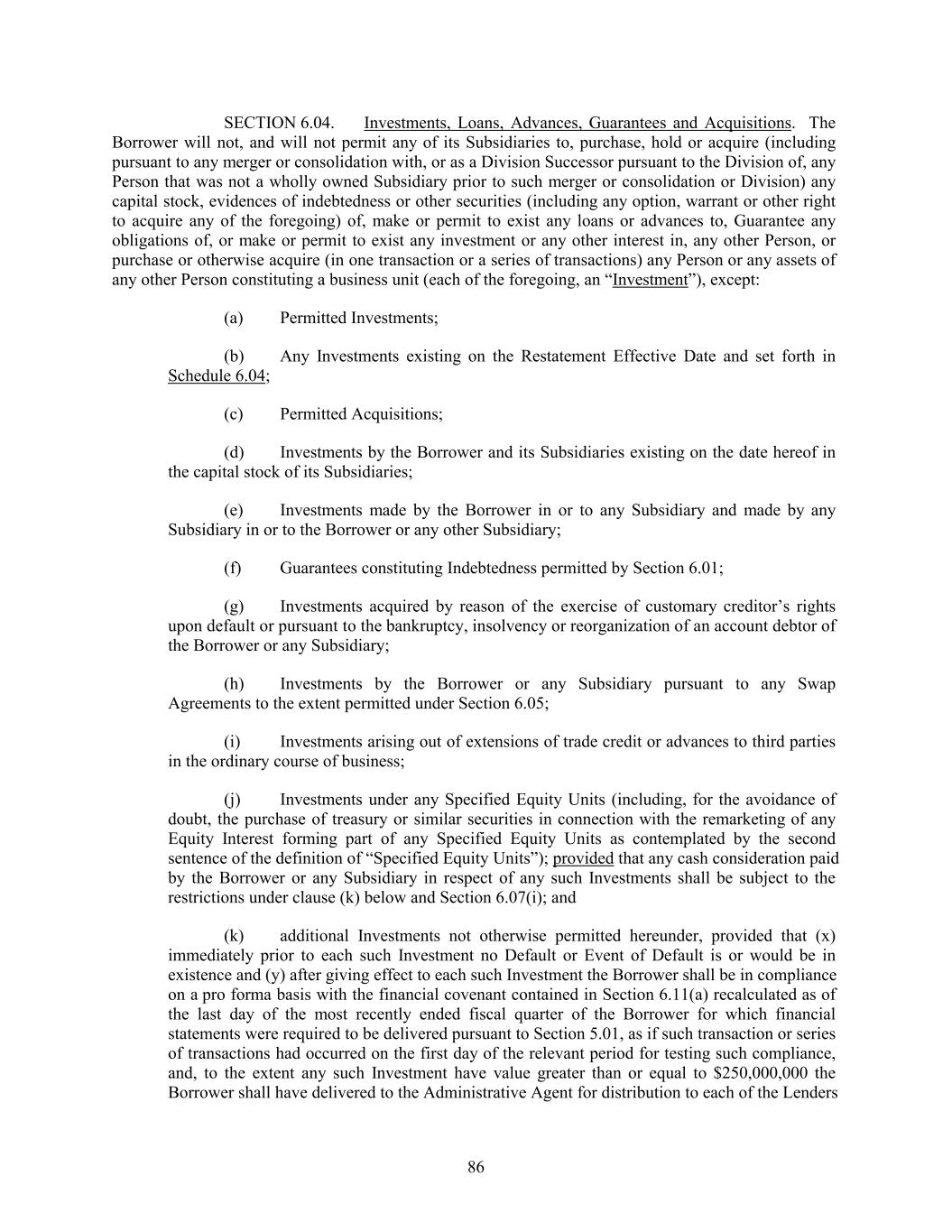 SECTION 6.04. Investments, Loans, Advances, Guarantees and Acquisitions. The Borrower will not, and will not permit any of its Subsidiaries to, purchase, hold or acquire (including pursuant to any merger or consolidation with, or as a Division Successor pursuant to the Division of, any Person that was not a wholly owned Subsidiary prior to such merger or consolidation or Division) any capital stock, evidences of indebtedness or other securities (including any option, warrant or other right to acquire any of the foregoing) of, make or permit to exist any loans or advances to, Guarantee any obligations of, or make or permit to exist any investment or any other interest in, any other Person, or purchase or otherwise acquire (in one transaction or a series of transactions) any Person or any assets of any other Person constituting a business unit (each of the foregoing, an “Investment”), except: (a) Permitted Investments; (b) Any Investments existing on the Restatement Effective Date and set forth in Schedule 6.04; (c) Permitted Acquisitions; (d) Investments by the Borrower and its Subsidiaries existing on the date hereof in the capital stock of its Subsidiaries; (e) Investments made by the Borrower in or to any Subsidiary and made by any Subsidiary in or to the Borrower or any other Subsidiary; (f) Guarantees constituting Indebtedness permitted by Section 6.01; (g) Investments acquired by reason of the exercise of customary creditor’s rights upon default or pursuant to the bankruptcy, insolvency or reorganization of an account debtor of the Borrower or any Subsidiary; (h) Investments by the Borrower or any Subsidiary pursuant to any Swap Agreements to the extent permitted under Section 6.05; (i) Investments arising out of extensions of trade credit or advances to third parties in the ordinary course of business; (j) Investments under any Specified Equity Units (including, for the avoidance of doubt, the purchase of treasury or similar securities in connection with the remarketing of any Equity Interest forming part of any Specified Equity Units as contemplated by the second sentence of the definition of “Specified Equity Units”); provided that any cash consideration paid by the Borrower or any Subsidiary in respect of any such Investments shall be subject to the restrictions under clause (k) below and Section 6.07(i); and (k) additional Investments not otherwise permitted hereunder, provided that (x) immediately prior to each such Investment no Default or Event of Default is or would be in existence and (y) after giving effect to each such Investment the Borrower shall be in compliance on a pro forma basis with the financial covenant contained in Section 6.11(a) recalculated as of the last day of the most recently ended fiscal quarter of the Borrower for which financial statements were required to be delivered pursuant to Section 5.01, as if such transaction or series of transactions had occurred on the first day of the relevant period for testing such compliance, and, to the extent any such Investment have value greater than or equal to $250,000,000 the Borrower shall have delivered to the Administrative Agent for distribution to each of the Lenders 86