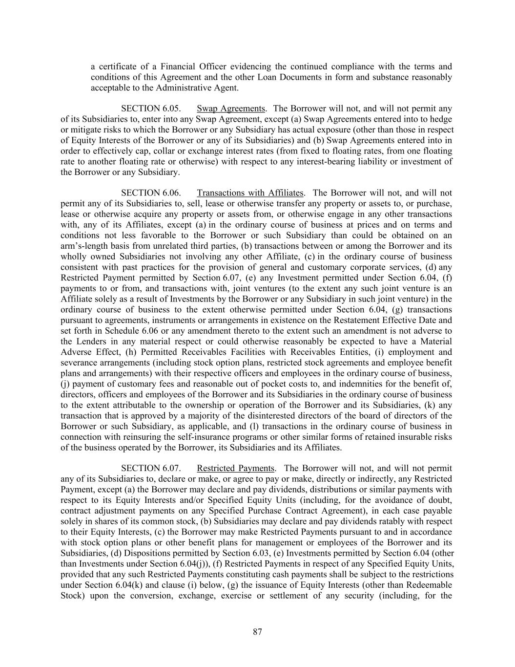 a certificate of a Financial Officer evidencing the continued compliance with the terms and conditions of this Agreement and the other Loan Documents in form and substance reasonably acceptable to the Administrative Agent. SECTION 6.05. Swap Agreements. The Borrower will not, and will not permit any of its Subsidiaries to, enter into any Swap Agreement, except (a) Swap Agreements entered into to hedge or mitigate risks to which the Borrower or any Subsidiary has actual exposure (other than those in respect of Equity Interests of the Borrower or any of its Subsidiaries) and (b) Swap Agreements entered into in order to effectively cap, collar or exchange interest rates (from fixed to floating rates, from one floating rate to another floating rate or otherwise) with respect to any interest-bearing liability or investment of the Borrower or any Subsidiary. SECTION 6.06. Transactions with Affiliates. The Borrower will not, and will not permit any of its Subsidiaries to, sell, lease or otherwise transfer any property or assets to, or purchase, lease or otherwise acquire any property or assets from, or otherwise engage in any other transactions with, any of its Affiliates, except (a) in the ordinary course of business at prices and on terms and conditions not less favorable to the Borrower or such Subsidiary than could be obtained on an arm’s-length basis from unrelated third parties, (b) transactions between or among the Borrower and its wholly owned Subsidiaries not involving any other Affiliate, (c) in the ordinary course of business consistent with past practices for the provision of general and customary corporate services, (d) any Restricted Payment permitted by Section 6.07, (e) any Investment permitted under Section 6.04, (f) payments to or from, and transactions with, joint ventures (to the extent any such joint venture is an Affiliate solely as a result of Investments by the Borrower or any Subsidiary in such joint venture) in the ordinary course of business to the extent otherwise permitted under Section 6.04, (g) transactions pursuant to agreements, instruments or arrangements in existence on the Restatement Effective Date and set forth in Schedule 6.06 or any amendment thereto to the extent such an amendment is not adverse to the Lenders in any material respect or could otherwise reasonably be expected to have a Material Adverse Effect, (h) Permitted Receivables Facilities with Receivables Entities, (i) employment and severance arrangements (including stock option plans, restricted stock agreements and employee benefit plans and arrangements) with their respective officers and employees in the ordinary course of business, (j) payment of customary fees and reasonable out of pocket costs to, and indemnities for the benefit of, directors, officers and employees of the Borrower and its Subsidiaries in the ordinary course of business to the extent attributable to the ownership or operation of the Borrower and its Subsidiaries, (k) any transaction that is approved by a majority of the disinterested directors of the board of directors of the Borrower or such Subsidiary, as applicable, and (l) transactions in the ordinary course of business in connection with reinsuring the self-insurance programs or other similar forms of retained insurable risks of the business operated by the Borrower, its Subsidiaries and its Affiliates. SECTION 6.07. Restricted Payments. The Borrower will not, and will not permit any of its Subsidiaries to, declare or make, or agree to pay or make, directly or indirectly, any Restricted Payment, except (a) the Borrower may declare and pay dividends, distributions or similar payments with respect to its Equity Interests and/or Specified Equity Units (including, for the avoidance of doubt, contract adjustment payments on any Specified Purchase Contract Agreement), in each case payable solely in shares of its common stock, (b) Subsidiaries may declare and pay dividends ratably with respect to their Equity Interests, (c) the Borrower may make Restricted Payments pursuant to and in accordance with stock option plans or other benefit plans for management or employees of the Borrower and its Subsidiaries, (d) Dispositions permitted by Section 6.03, (e) Investments permitted by Section 6.04 (other than Investments under Section 6.04(j)), (f) Restricted Payments in respect of any Specified Equity Units, provided that any such Restricted Payments constituting cash payments shall be subject to the restrictions under Section 6.04(k) and clause (i) below, (g) the issuance of Equity Interests (other than Redeemable Stock) upon the conversion, exchange, exercise or settlement of any security (including, for the 87