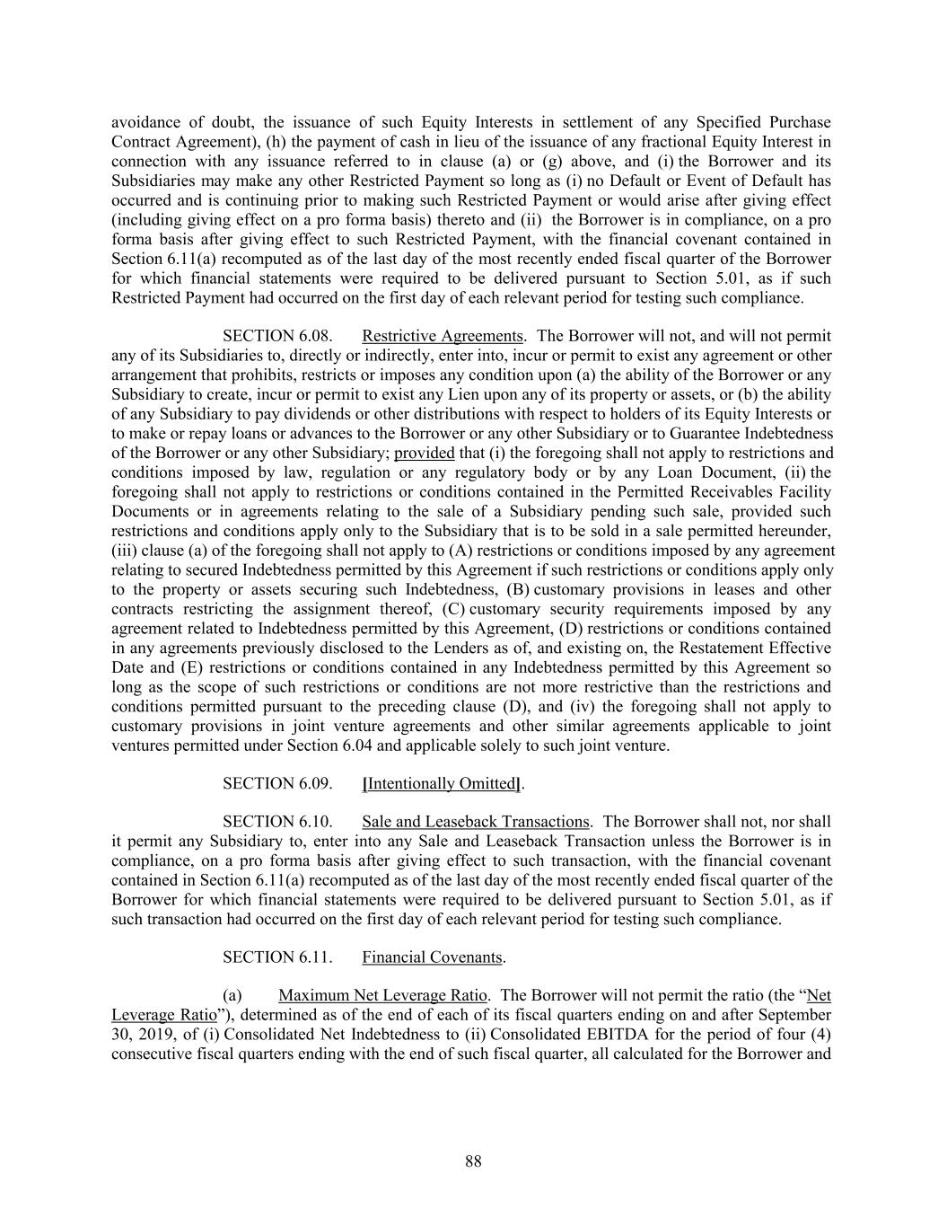avoidance of doubt, the issuance of such Equity Interests in settlement of any Specified Purchase Contract Agreement), (h) the payment of cash in lieu of the issuance of any fractional Equity Interest in connection with any issuance referred to in clause (a) or (g) above, and (i) the Borrower and its Subsidiaries may make any other Restricted Payment so long as (i) no Default or Event of Default has occurred and is continuing prior to making such Restricted Payment or would arise after giving effect (including giving effect on a pro forma basis) thereto and (ii) the Borrower is in compliance, on a pro forma basis after giving effect to such Restricted Payment, with the financial covenant contained in Section 6.11(a) recomputed as of the last day of the most recently ended fiscal quarter of the Borrower for which financial statements were required to be delivered pursuant to Section 5.01, as if such Restricted Payment had occurred on the first day of each relevant period for testing such compliance. SECTION 6.08. Restrictive Agreements. The Borrower will not, and will not permit any of its Subsidiaries to, directly or indirectly, enter into, incur or permit to exist any agreement or other arrangement that prohibits, restricts or imposes any condition upon (a) the ability of the Borrower or any Subsidiary to create, incur or permit to exist any Lien upon any of its property or assets, or (b) the ability of any Subsidiary to pay dividends or other distributions with respect to holders of its Equity Interests or to make or repay loans or advances to the Borrower or any other Subsidiary or to Guarantee Indebtedness of the Borrower or any other Subsidiary; provided that (i) the foregoing shall not apply to restrictions and conditions imposed by law, regulation or any regulatory body or by any Loan Document, (ii) the foregoing shall not apply to restrictions or conditions contained in the Permitted Receivables Facility Documents or in agreements relating to the sale of a Subsidiary pending such sale, provided such restrictions and conditions apply only to the Subsidiary that is to be sold in a sale permitted hereunder, (iii) clause (a) of the foregoing shall not apply to (A) restrictions or conditions imposed by any agreement relating to secured Indebtedness permitted by this Agreement if such restrictions or conditions apply only to the property or assets securing such Indebtedness, (B) customary provisions in leases and other contracts restricting the assignment thereof, (C) customary security requirements imposed by any agreement related to Indebtedness permitted by this Agreement, (D) restrictions or conditions contained in any agreements previously disclosed to the Lenders as of, and existing on, the Restatement Effective Date and (E) restrictions or conditions contained in any Indebtedness permitted by this Agreement so long as the scope of such restrictions or conditions are not more restrictive than the restrictions and conditions permitted pursuant to the preceding clause (D), and (iv) the foregoing shall not apply to customary provisions in joint venture agreements and other similar agreements applicable to joint ventures permitted under Section 6.04 and applicable solely to such joint venture. SECTION 6.09. [Intentionally Omitted]. SECTION 6.10. Sale and Leaseback Transactions. The Borrower shall not, nor shall it permit any Subsidiary to, enter into any Sale and Leaseback Transaction unless the Borrower is in compliance, on a pro forma basis after giving effect to such transaction, with the financial covenant contained in Section 6.11(a) recomputed as of the last day of the most recently ended fiscal quarter of the Borrower for which financial statements were required to be delivered pursuant to Section 5.01, as if such transaction had occurred on the first day of each relevant period for testing such compliance. SECTION 6.11. Financial Covenants. (a) Maximum Net Leverage Ratio. The Borrower will not permit the ratio (the “Net Leverage Ratio”), determined as of the end of each of its fiscal quarters ending on and after September 30, 2019, of (i) Consolidated Net Indebtedness to (ii) Consolidated EBITDA for the period of four (4) consecutive fiscal quarters ending with the end of such fiscal quarter, all calculated for the Borrower and 88