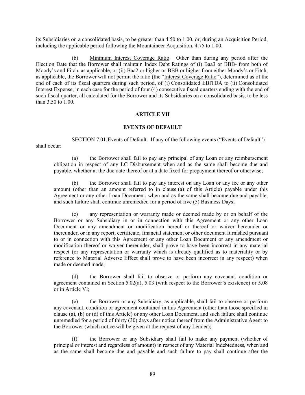 its Subsidiaries on a consolidated basis, to be greater than 4.50 to 1.00, or, during an Acquisition Period, including the applicable period following the Mountaineer Acquisition, 4.75 to 1.00. (b) Minimum Interest Coverage Ratio. Other than during any period after the Election Date that the Borrower shall maintain Index Debt Ratings of (i) Baa3 or BBB- from both of Moody’s and Fitch, as applicable, or (ii) Baa2 or higher or BBB or higher from either Moody’s or Fitch, as applicable, the Borrower will not permit the ratio (the “Interest Coverage Ratio”), determined as of the end of each of its fiscal quarters during such period, of (i) Consolidated EBITDA to (ii) Consolidated Interest Expense, in each case for the period of four (4) consecutive fiscal quarters ending with the end of such fiscal quarter, all calculated for the Borrower and its Subsidiaries on a consolidated basis, to be less than 3.50 to 1.00. ARTICLE VII EVENTS OF DEFAULT SECTION 7.01.Events of Default. If any of the following events (“Events of Default”) shall occur: (a) the Borrower shall fail to pay any principal of any Loan or any reimbursement obligation in respect of any LC Disbursement when and as the same shall become due and payable, whether at the due date thereof or at a date fixed for prepayment thereof or otherwise; (b) the Borrower shall fail to pay any interest on any Loan or any fee or any other amount (other than an amount referred to in clause (a) of this Article) payable under this Agreement or any other Loan Document, when and as the same shall become due and payable, and such failure shall continue unremedied for a period of five (5) Business Days; (c) any representation or warranty made or deemed made by or on behalf of the Borrower or any Subsidiary in or in connection with this Agreement or any other Loan Document or any amendment or modification hereof or thereof or waiver hereunder or thereunder, or in any report, certificate, financial statement or other document furnished pursuant to or in connection with this Agreement or any other Loan Document or any amendment or modification thereof or waiver thereunder, shall prove to have been incorrect in any material respect (or any representation or warranty which is already qualified as to materiality or by reference to Material Adverse Effect shall prove to have been incorrect in any respect) when made or deemed made; (d) the Borrower shall fail to observe or perform any covenant, condition or agreement contained in Section 5.02(a), 5.03 (with respect to the Borrower’s existence) or 5.08 or in Article VI; (e) the Borrower or any Subsidiary, as applicable, shall fail to observe or perform any covenant, condition or agreement contained in this Agreement (other than those specified in clause (a), (b) or (d) of this Article) or any other Loan Document, and such failure shall continue unremedied for a period of thirty (30) days after notice thereof from the Administrative Agent to the Borrower (which notice will be given at the request of any Lender); (f) the Borrower or any Subsidiary shall fail to make any payment (whether of principal or interest and regardless of amount) in respect of any Material Indebtedness, when and as the same shall become due and payable and such failure to pay shall continue after the 89