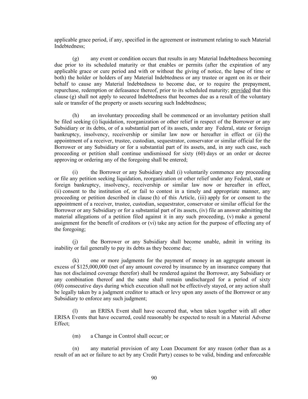 applicable grace period, if any, specified in the agreement or instrument relating to such Material Indebtedness; (g) any event or condition occurs that results in any Material Indebtedness becoming due prior to its scheduled maturity or that enables or permits (after the expiration of any applicable grace or cure period and with or without the giving of notice, the lapse of time or both) the holder or holders of any Material Indebtedness or any trustee or agent on its or their behalf to cause any Material Indebtedness to become due, or to require the prepayment, repurchase, redemption or defeasance thereof, prior to its scheduled maturity; provided that this clause (g) shall not apply to secured Indebtedness that becomes due as a result of the voluntary sale or transfer of the property or assets securing such Indebtedness; (h) an involuntary proceeding shall be commenced or an involuntary petition shall be filed seeking (i) liquidation, reorganization or other relief in respect of the Borrower or any Subsidiary or its debts, or of a substantial part of its assets, under any Federal, state or foreign bankruptcy, insolvency, receivership or similar law now or hereafter in effect or (ii) the appointment of a receiver, trustee, custodian, sequestrator, conservator or similar official for the Borrower or any Subsidiary or for a substantial part of its assets, and, in any such case, such proceeding or petition shall continue undismissed for sixty (60) days or an order or decree approving or ordering any of the foregoing shall be entered; (i) the Borrower or any Subsidiary shall (i) voluntarily commence any proceeding or file any petition seeking liquidation, reorganization or other relief under any Federal, state or foreign bankruptcy, insolvency, receivership or similar law now or hereafter in effect, (ii) consent to the institution of, or fail to contest in a timely and appropriate manner, any proceeding or petition described in clause (h) of this Article, (iii) apply for or consent to the appointment of a receiver, trustee, custodian, sequestrator, conservator or similar official for the Borrower or any Subsidiary or for a substantial part of its assets, (iv) file an answer admitting the material allegations of a petition filed against it in any such proceeding, (v) make a general assignment for the benefit of creditors or (vi) take any action for the purpose of effecting any of the foregoing; (j) the Borrower or any Subsidiary shall become unable, admit in writing its inability or fail generally to pay its debts as they become due; (k) one or more judgments for the payment of money in an aggregate amount in excess of $125,000,000 (net of any amount covered by insurance by an insurance company that has not disclaimed coverage therefor) shall be rendered against the Borrower, any Subsidiary or any combination thereof and the same shall remain undischarged for a period of sixty (60) consecutive days during which execution shall not be effectively stayed, or any action shall be legally taken by a judgment creditor to attach or levy upon any assets of the Borrower or any Subsidiary to enforce any such judgment; (l) an ERISA Event shall have occurred that, when taken together with all other ERISA Events that have occurred, could reasonably be expected to result in a Material Adverse Effect; (m) a Change in Control shall occur; or (n) any material provision of any Loan Document for any reason (other than as a result of an act or failure to act by any Credit Party) ceases to be valid, binding and enforceable 90