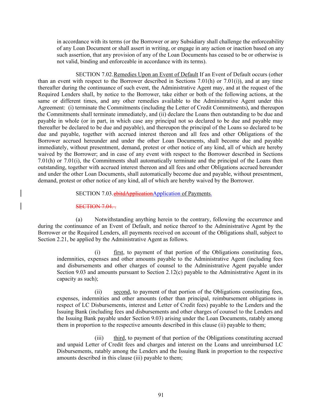 in accordance with its terms (or the Borrower or any Subsidiary shall challenge the enforceability of any Loan Document or shall assert in writing, or engage in any action or inaction based on any such assertion, that any provision of any of the Loan Documents has ceased to be or otherwise is not valid, binding and enforceable in accordance with its terms). SECTION 7.02.Remedies Upon an Event of Default If an Event of Default occurs (other than an event with respect to the Borrower described in Sections 7.01(h) or 7.01(i)), and at any time thereafter during the continuance of such event, the Administrative Agent may, and at the request of the Required Lenders shall, by notice to the Borrower, take either or both of the following actions, at the same or different times, and any other remedies available to the Administrative Agent under this Agreement: (i) terminate the Commitments (including the Letter of Credit Commitments), and thereupon the Commitments shall terminate immediately, and (ii) declare the Loans then outstanding to be due and payable in whole (or in part, in which case any principal not so declared to be due and payable may thereafter be declared to be due and payable), and thereupon the principal of the Loans so declared to be due and payable, together with accrued interest thereon and all fees and other Obligations of the Borrower accrued hereunder and under the other Loan Documents, shall become due and payable immediately, without presentment, demand, protest or other notice of any kind, all of which are hereby waived by the Borrower; and in case of any event with respect to the Borrower described in Sections 7.01(h) or 7.01(i), the Commitments shall automatically terminate and the principal of the Loans then outstanding, together with accrued interest thereon and all fees and other Obligations accrued hereunder and under the other Loan Documents, shall automatically become due and payable, without presentment, demand, protest or other notice of any kind, all of which are hereby waived by the Borrower. SECTION 7.03.ebitdApplicationApplication of Payments. SECTION 7.04. . (a) Notwithstanding anything herein to the contrary, following the occurrence and during the continuance of an Event of Default, and notice thereof to the Administrative Agent by the Borrower or the Required Lenders, all payments received on account of the Obligations shall, subject to Section 2.21, be applied by the Administrative Agent as follows. (i) first, to payment of that portion of the Obligations constituting fees, indemnities, expenses and other amounts payable to the Administrative Agent (including fees and disbursements and other charges of counsel to the Administrative Agent payable under Section 9.03 and amounts pursuant to Section 2.12(c) payable to the Administrative Agent in its capacity as such); (ii) second, to payment of that portion of the Obligations constituting fees, expenses, indemnities and other amounts (other than principal, reimbursement obligations in respect of LC Disbursements, interest and Letter of Credit fees) payable to the Lenders and the Issuing Bank (including fees and disbursements and other charges of counsel to the Lenders and the Issuing Bank payable under Section 9.03) arising under the Loan Documents, ratably among them in proportion to the respective amounts described in this clause (ii) payable to them; (iii) third, to payment of that portion of the Obligations constituting accrued and unpaid Letter of Credit fees and charges and interest on the Loans and unreimbursed LC Disbursements, ratably among the Lenders and the Issuing Bank in proportion to the respective amounts described in this clause (iii) payable to them; 91