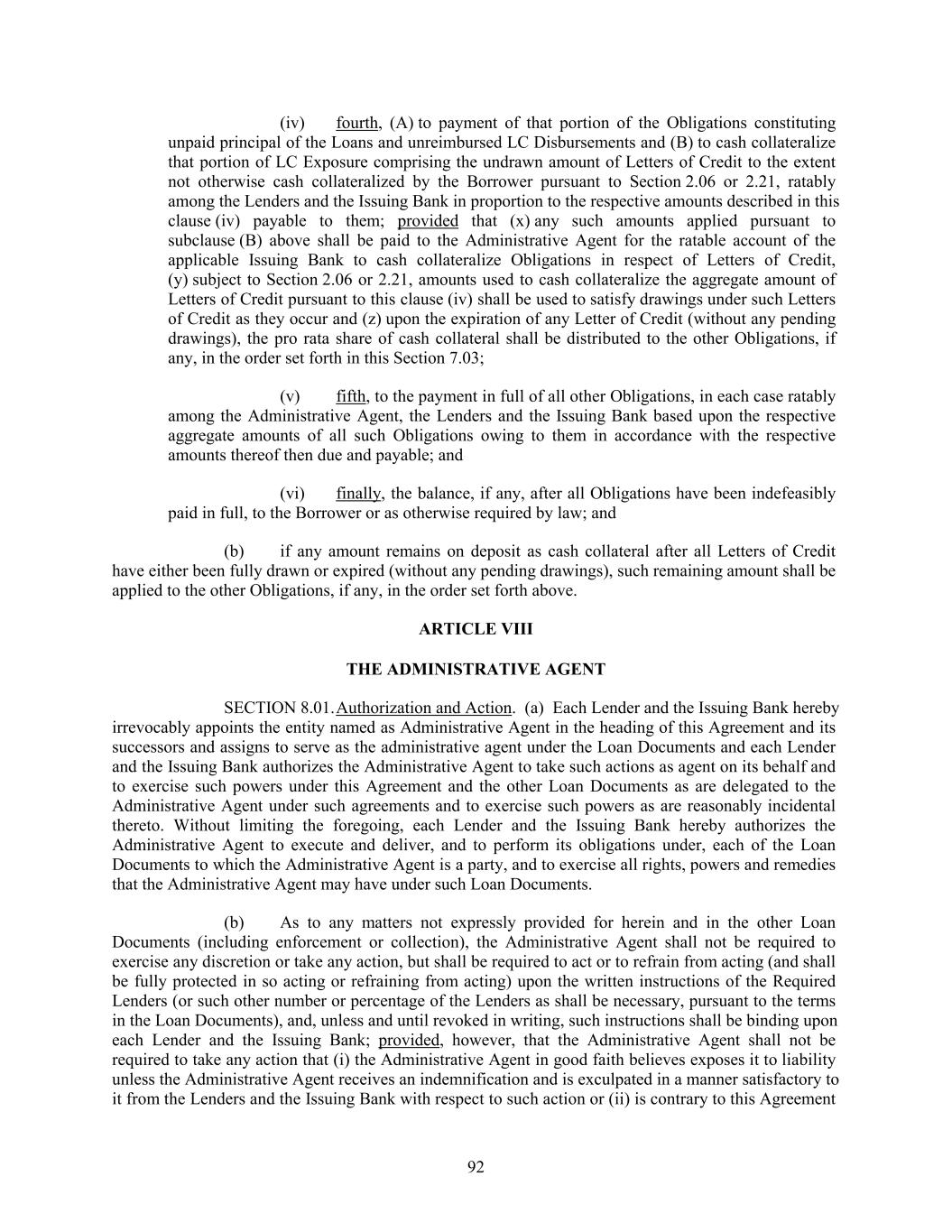 (iv) fourth, (A) to payment of that portion of the Obligations constituting unpaid principal of the Loans and unreimbursed LC Disbursements and (B) to cash collateralize that portion of LC Exposure comprising the undrawn amount of Letters of Credit to the extent not otherwise cash collateralized by the Borrower pursuant to Section 2.06 or 2.21, ratably among the Lenders and the Issuing Bank in proportion to the respective amounts described in this clause (iv) payable to them; provided that (x) any such amounts applied pursuant to subclause (B) above shall be paid to the Administrative Agent for the ratable account of the applicable Issuing Bank to cash collateralize Obligations in respect of Letters of Credit, (y) subject to Section 2.06 or 2.21, amounts used to cash collateralize the aggregate amount of Letters of Credit pursuant to this clause (iv) shall be used to satisfy drawings under such Letters of Credit as they occur and (z) upon the expiration of any Letter of Credit (without any pending drawings), the pro rata share of cash collateral shall be distributed to the other Obligations, if any, in the order set forth in this Section 7.03; (v) fifth, to the payment in full of all other Obligations, in each case ratably among the Administrative Agent, the Lenders and the Issuing Bank based upon the respective aggregate amounts of all such Obligations owing to them in accordance with the respective amounts thereof then due and payable; and (vi) finally, the balance, if any, after all Obligations have been indefeasibly paid in full, to the Borrower or as otherwise required by law; and (b) if any amount remains on deposit as cash collateral after all Letters of Credit have either been fully drawn or expired (without any pending drawings), such remaining amount shall be applied to the other Obligations, if any, in the order set forth above. ARTICLE VIII THE ADMINISTRATIVE AGENT SECTION 8.01.Authorization and Action. (a) Each Lender and the Issuing Bank hereby irrevocably appoints the entity named as Administrative Agent in the heading of this Agreement and its successors and assigns to serve as the administrative agent under the Loan Documents and each Lender and the Issuing Bank authorizes the Administrative Agent to take such actions as agent on its behalf and to exercise such powers under this Agreement and the other Loan Documents as are delegated to the Administrative Agent under such agreements and to exercise such powers as are reasonably incidental thereto. Without limiting the foregoing, each Lender and the Issuing Bank hereby authorizes the Administrative Agent to execute and deliver, and to perform its obligations under, each of the Loan Documents to which the Administrative Agent is a party, and to exercise all rights, powers and remedies that the Administrative Agent may have under such Loan Documents. (b) As to any matters not expressly provided for herein and in the other Loan Documents (including enforcement or collection), the Administrative Agent shall not be required to exercise any discretion or take any action, but shall be required to act or to refrain from acting (and shall be fully protected in so acting or refraining from acting) upon the written instructions of the Required Lenders (or such other number or percentage of the Lenders as shall be necessary, pursuant to the terms in the Loan Documents), and, unless and until revoked in writing, such instructions shall be binding upon each Lender and the Issuing Bank; provided, however, that the Administrative Agent shall not be required to take any action that (i) the Administrative Agent in good faith believes exposes it to liability unless the Administrative Agent receives an indemnification and is exculpated in a manner satisfactory to it from the Lenders and the Issuing Bank with respect to such action or (ii) is contrary to this Agreement 92