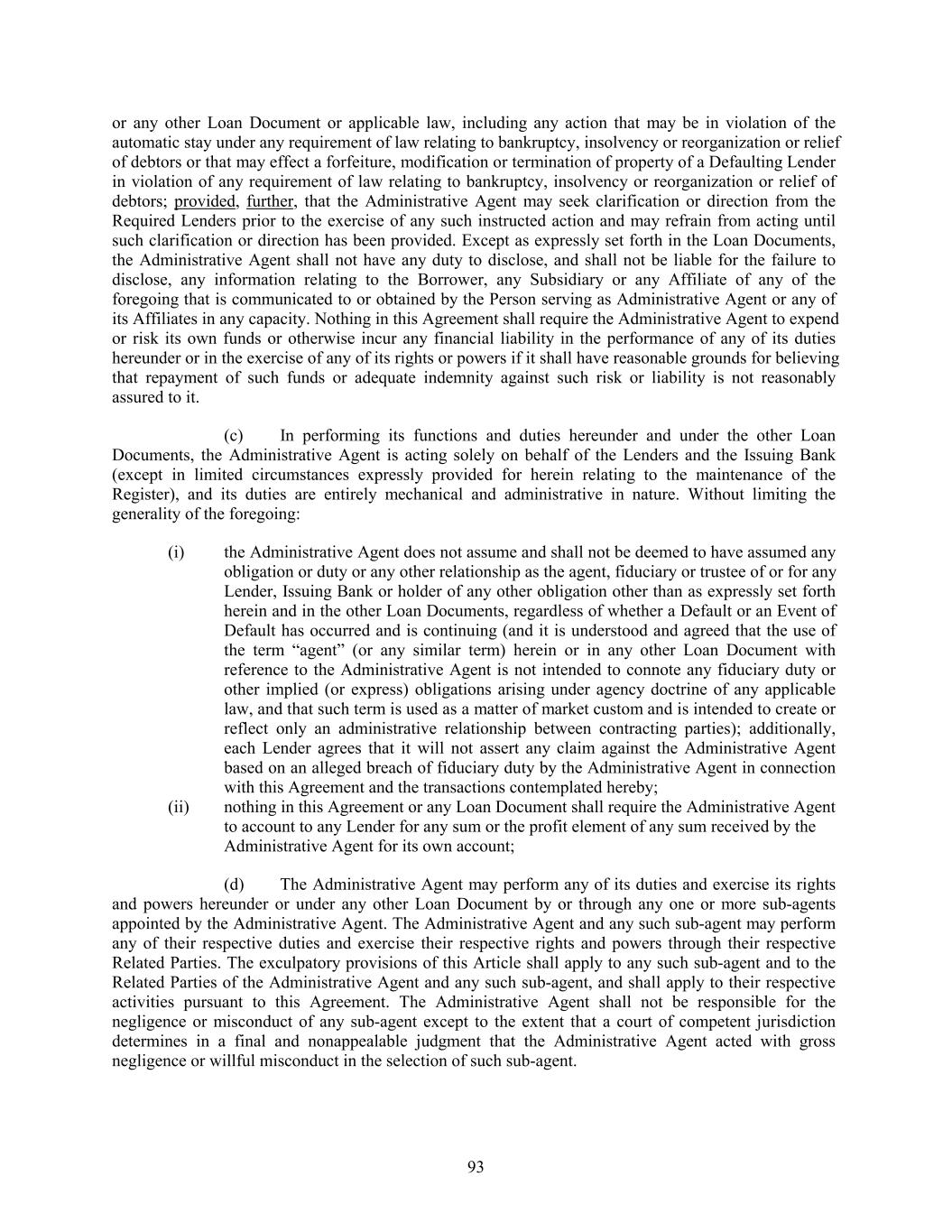 or any other Loan Document or applicable law, including any action that may be in violation of the automatic stay under any requirement of law relating to bankruptcy, insolvency or reorganization or relief of debtors or that may effect a forfeiture, modification or termination of property of a Defaulting Lender in violation of any requirement of law relating to bankruptcy, insolvency or reorganization or relief of debtors; provided, further, that the Administrative Agent may seek clarification or direction from the Required Lenders prior to the exercise of any such instructed action and may refrain from acting until such clarification or direction has been provided. Except as expressly set forth in the Loan Documents, the Administrative Agent shall not have any duty to disclose, and shall not be liable for the failure to disclose, any information relating to the Borrower, any Subsidiary or any Affiliate of any of the foregoing that is communicated to or obtained by the Person serving as Administrative Agent or any of its Affiliates in any capacity. Nothing in this Agreement shall require the Administrative Agent to expend or risk its own funds or otherwise incur any financial liability in the performance of any of its duties hereunder or in the exercise of any of its rights or powers if it shall have reasonable grounds for believing that repayment of such funds or adequate indemnity against such risk or liability is not reasonably assured to it. (c) In performing its functions and duties hereunder and under the other Loan Documents, the Administrative Agent is acting solely on behalf of the Lenders and the Issuing Bank (except in limited circumstances expressly provided for herein relating to the maintenance of the Register), and its duties are entirely mechanical and administrative in nature. Without limiting the generality of the foregoing: (i) the Administrative Agent does not assume and shall not be deemed to have assumed any obligation or duty or any other relationship as the agent, fiduciary or trustee of or for any Lender, Issuing Bank or holder of any other obligation other than as expressly set forth herein and in the other Loan Documents, regardless of whether a Default or an Event of Default has occurred and is continuing (and it is understood and agreed that the use of the term “agent” (or any similar term) herein or in any other Loan Document with reference to the Administrative Agent is not intended to connote any fiduciary duty or other implied (or express) obligations arising under agency doctrine of any applicable law, and that such term is used as a matter of market custom and is intended to create or reflect only an administrative relationship between contracting parties); additionally, each Lender agrees that it will not assert any claim against the Administrative Agent based on an alleged breach of fiduciary duty by the Administrative Agent in connection with this Agreement and the transactions contemplated hereby; (ii) nothing in this Agreement or any Loan Document shall require the Administrative Agent to account to any Lender for any sum or the profit element of any sum received by the Administrative Agent for its own account; (d) The Administrative Agent may perform any of its duties and exercise its rights and powers hereunder or under any other Loan Document by or through any one or more sub-agents appointed by the Administrative Agent. The Administrative Agent and any such sub-agent may perform any of their respective duties and exercise their respective rights and powers through their respective Related Parties. The exculpatory provisions of this Article shall apply to any such sub-agent and to the Related Parties of the Administrative Agent and any such sub-agent, and shall apply to their respective activities pursuant to this Agreement. The Administrative Agent shall not be responsible for the negligence or misconduct of any sub-agent except to the extent that a court of competent jurisdiction determines in a final and nonappealable judgment that the Administrative Agent acted with gross negligence or willful misconduct in the selection of such sub-agent. 93