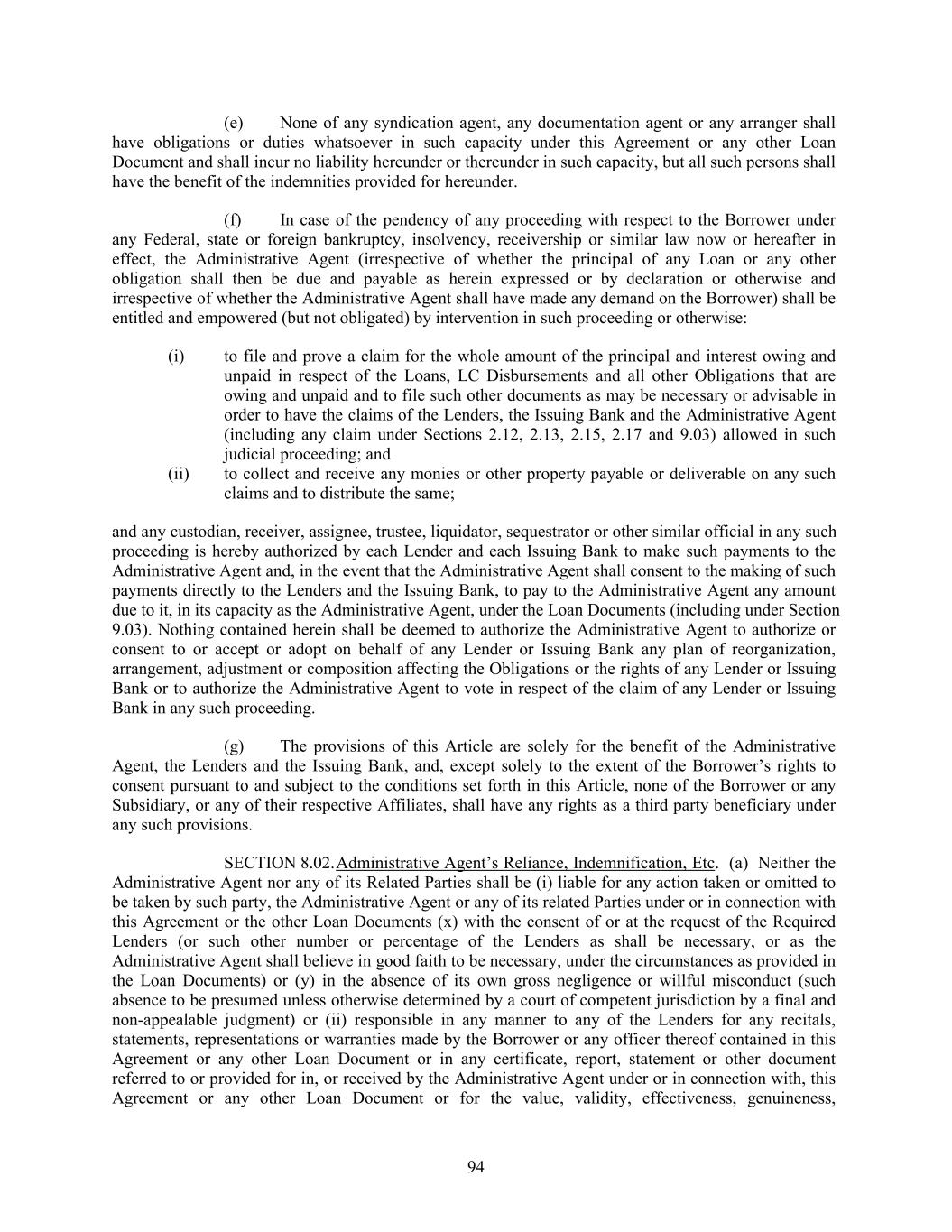 (e) None of any syndication agent, any documentation agent or any arranger shall have obligations or duties whatsoever in such capacity under this Agreement or any other Loan Document and shall incur no liability hereunder or thereunder in such capacity, but all such persons shall have the benefit of the indemnities provided for hereunder. (f) In case of the pendency of any proceeding with respect to the Borrower under any Federal, state or foreign bankruptcy, insolvency, receivership or similar law now or hereafter in effect, the Administrative Agent (irrespective of whether the principal of any Loan or any other obligation shall then be due and payable as herein expressed or by declaration or otherwise and irrespective of whether the Administrative Agent shall have made any demand on the Borrower) shall be entitled and empowered (but not obligated) by intervention in such proceeding or otherwise: (i) to file and prove a claim for the whole amount of the principal and interest owing and unpaid in respect of the Loans, LC Disbursements and all other Obligations that are owing and unpaid and to file such other documents as may be necessary or advisable in order to have the claims of the Lenders, the Issuing Bank and the Administrative Agent (including any claim under Sections 2.12, 2.13, 2.15, 2.17 and 9.03) allowed in such judicial proceeding; and (ii) to collect and receive any monies or other property payable or deliverable on any such claims and to distribute the same; and any custodian, receiver, assignee, trustee, liquidator, sequestrator or other similar official in any such proceeding is hereby authorized by each Lender and each Issuing Bank to make such payments to the Administrative Agent and, in the event that the Administrative Agent shall consent to the making of such payments directly to the Lenders and the Issuing Bank, to pay to the Administrative Agent any amount due to it, in its capacity as the Administrative Agent, under the Loan Documents (including under Section 9.03). Nothing contained herein shall be deemed to authorize the Administrative Agent to authorize or consent to or accept or adopt on behalf of any Lender or Issuing Bank any plan of reorganization, arrangement, adjustment or composition affecting the Obligations or the rights of any Lender or Issuing Bank or to authorize the Administrative Agent to vote in respect of the claim of any Lender or Issuing Bank in any such proceeding. (g) The provisions of this Article are solely for the benefit of the Administrative Agent, the Lenders and the Issuing Bank, and, except solely to the extent of the Borrower’s rights to consent pursuant to and subject to the conditions set forth in this Article, none of the Borrower or any Subsidiary, or any of their respective Affiliates, shall have any rights as a third party beneficiary under any such provisions. SECTION 8.02.Administrative Agent’s Reliance, Indemnification, Etc. (a) Neither the Administrative Agent nor any of its Related Parties shall be (i) liable for any action taken or omitted to be taken by such party, the Administrative Agent or any of its related Parties under or in connection with this Agreement or the other Loan Documents (x) with the consent of or at the request of the Required Lenders (or such other number or percentage of the Lenders as shall be necessary, or as the Administrative Agent shall believe in good faith to be necessary, under the circumstances as provided in the Loan Documents) or (y) in the absence of its own gross negligence or willful misconduct (such absence to be presumed unless otherwise determined by a court of competent jurisdiction by a final and non-appealable judgment) or (ii) responsible in any manner to any of the Lenders for any recitals, statements, representations or warranties made by the Borrower or any officer thereof contained in this Agreement or any other Loan Document or in any certificate, report, statement or other document referred to or provided for in, or received by the Administrative Agent under or in connection with, this Agreement or any other Loan Document or for the value, validity, effectiveness, genuineness, 94
