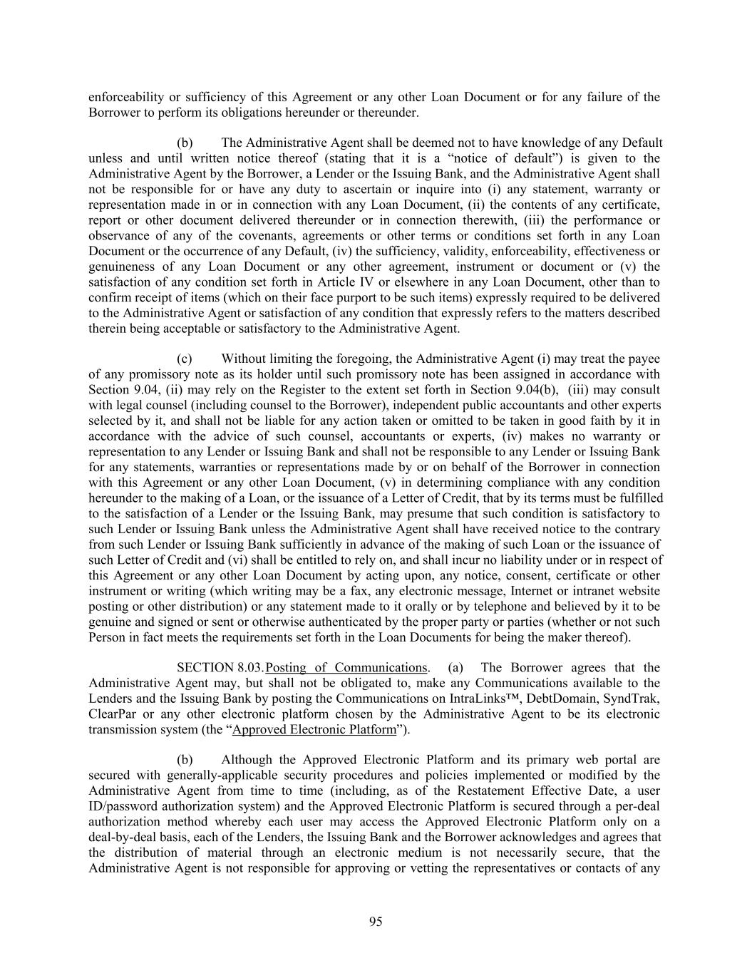 enforceability or sufficiency of this Agreement or any other Loan Document or for any failure of the Borrower to perform its obligations hereunder or thereunder. (b) The Administrative Agent shall be deemed not to have knowledge of any Default unless and until written notice thereof (stating that it is a “notice of default”) is given to the Administrative Agent by the Borrower, a Lender or the Issuing Bank, and the Administrative Agent shall not be responsible for or have any duty to ascertain or inquire into (i) any statement, warranty or representation made in or in connection with any Loan Document, (ii) the contents of any certificate, report or other document delivered thereunder or in connection therewith, (iii) the performance or observance of any of the covenants, agreements or other terms or conditions set forth in any Loan Document or the occurrence of any Default, (iv) the sufficiency, validity, enforceability, effectiveness or genuineness of any Loan Document or any other agreement, instrument or document or (v) the satisfaction of any condition set forth in Article IV or elsewhere in any Loan Document, other than to confirm receipt of items (which on their face purport to be such items) expressly required to be delivered to the Administrative Agent or satisfaction of any condition that expressly refers to the matters described therein being acceptable or satisfactory to the Administrative Agent. (c) Without limiting the foregoing, the Administrative Agent (i) may treat the payee of any promissory note as its holder until such promissory note has been assigned in accordance with Section 9.04, (ii) may rely on the Register to the extent set forth in Section 9.04(b), (iii) may consult with legal counsel (including counsel to the Borrower), independent public accountants and other experts selected by it, and shall not be liable for any action taken or omitted to be taken in good faith by it in accordance with the advice of such counsel, accountants or experts, (iv) makes no warranty or representation to any Lender or Issuing Bank and shall not be responsible to any Lender or Issuing Bank for any statements, warranties or representations made by or on behalf of the Borrower in connection with this Agreement or any other Loan Document, (v) in determining compliance with any condition hereunder to the making of a Loan, or the issuance of a Letter of Credit, that by its terms must be fulfilled to the satisfaction of a Lender or the Issuing Bank, may presume that such condition is satisfactory to such Lender or Issuing Bank unless the Administrative Agent shall have received notice to the contrary from such Lender or Issuing Bank sufficiently in advance of the making of such Loan or the issuance of such Letter of Credit and (vi) shall be entitled to rely on, and shall incur no liability under or in respect of this Agreement or any other Loan Document by acting upon, any notice, consent, certificate or other instrument or writing (which writing may be a fax, any electronic message, Internet or intranet website posting or other distribution) or any statement made to it orally or by telephone and believed by it to be genuine and signed or sent or otherwise authenticated by the proper party or parties (whether or not such Person in fact meets the requirements set forth in the Loan Documents for being the maker thereof). SECTION 8.03.Posting of Communications. (a) The Borrower agrees that the Administrative Agent may, but shall not be obligated to, make any Communications available to the Lenders and the Issuing Bank by posting the Communications on IntraLinks™, DebtDomain, SyndTrak, ClearPar or any other electronic platform chosen by the Administrative Agent to be its electronic transmission system (the “Approved Electronic Platform”). (b) Although the Approved Electronic Platform and its primary web portal are secured with generally-applicable security procedures and policies implemented or modified by the Administrative Agent from time to time (including, as of the Restatement Effective Date, a user ID/password authorization system) and the Approved Electronic Platform is secured through a per-deal authorization method whereby each user may access the Approved Electronic Platform only on a deal-by-deal basis, each of the Lenders, the Issuing Bank and the Borrower acknowledges and agrees that the distribution of material through an electronic medium is not necessarily secure, that the Administrative Agent is not responsible for approving or vetting the representatives or contacts of any 95
