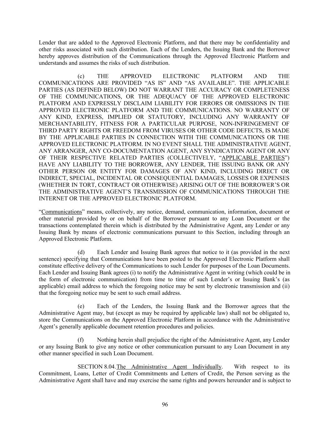 Lender that are added to the Approved Electronic Platform, and that there may be confidentiality and other risks associated with such distribution. Each of the Lenders, the Issuing Bank and the Borrower hereby approves distribution of the Communications through the Approved Electronic Platform and understands and assumes the risks of such distribution. (c) THE APPROVED ELECTRONIC PLATFORM AND THE COMMUNICATIONS ARE PROVIDED “AS IS” AND “AS AVAILABLE”. THE APPLICABLE PARTIES (AS DEFINED BELOW) DO NOT WARRANT THE ACCURACY OR COMPLETENESS OF THE COMMUNICATIONS, OR THE ADEQUACY OF THE APPROVED ELECTRONIC PLATFORM AND EXPRESSLY DISCLAIM LIABILITY FOR ERRORS OR OMISSIONS IN THE APPROVED ELECTRONIC PLATFORM AND THE COMMUNICATIONS. NO WARRANTY OF ANY KIND, EXPRESS, IMPLIED OR STATUTORY, INCLUDING ANY WARRANTY OF MERCHANTABILITY, FITNESS FOR A PARTICULAR PURPOSE, NON-INFRINGEMENT OF THIRD PARTY RIGHTS OR FREEDOM FROM VIRUSES OR OTHER CODE DEFECTS, IS MADE BY THE APPLICABLE PARTIES IN CONNECTION WITH THE COMMUNICATIONS OR THE APPROVED ELECTRONIC PLATFORM. IN NO EVENT SHALL THE ADMINISTRATIVE AGENT, ANY ARRANGER, ANY CO-DOCUMENTATION AGENT, ANY SYNDICATION AGENT OR ANY OF THEIR RESPECTIVE RELATED PARTIES (COLLECTIVELY, “APPLICABLE PARTIES”) HAVE ANY LIABILITY TO THE BORROWER, ANY LENDER, THE ISSUING BANK OR ANY OTHER PERSON OR ENTITY FOR DAMAGES OF ANY KIND, INCLUDING DIRECT OR INDIRECT, SPECIAL, INCIDENTAL OR CONSEQUENTIAL DAMAGES, LOSSES OR EXPENSES (WHETHER IN TORT, CONTRACT OR OTHERWISE) ARISING OUT OF THE BORROWER’S OR THE ADMINISTRATIVE AGENT’S TRANSMISSION OF COMMUNICATIONS THROUGH THE INTERNET OR THE APPROVED ELECTRONIC PLATFORM. “Communications” means, collectively, any notice, demand, communication, information, document or other material provided by or on behalf of the Borrower pursuant to any Loan Document or the transactions contemplated therein which is distributed by the Administrative Agent, any Lender or any Issuing Bank by means of electronic communications pursuant to this Section, including through an Approved Electronic Platform. (d) Each Lender and Issuing Bank agrees that notice to it (as provided in the next sentence) specifying that Communications have been posted to the Approved Electronic Platform shall constitute effective delivery of the Communications to such Lender for purposes of the Loan Documents. Each Lender and Issuing Bank agrees (i) to notify the Administrative Agent in writing (which could be in the form of electronic communication) from time to time of such Lender’s or Issuing Bank’s (as applicable) email address to which the foregoing notice may be sent by electronic transmission and (ii) that the foregoing notice may be sent to such email address. (e) Each of the Lenders, the Issuing Bank and the Borrower agrees that the Administrative Agent may, but (except as may be required by applicable law) shall not be obligated to, store the Communications on the Approved Electronic Platform in accordance with the Administrative Agent’s generally applicable document retention procedures and policies. (f) Nothing herein shall prejudice the right of the Administrative Agent, any Lender or any Issuing Bank to give any notice or other communication pursuant to any Loan Document in any other manner specified in such Loan Document. SECTION 8.04.The Administrative Agent Individually. With respect to its Commitment, Loans, Letter of Credit Commitments and Letters of Credit, the Person serving as the Administrative Agent shall have and may exercise the same rights and powers hereunder and is subject to 96