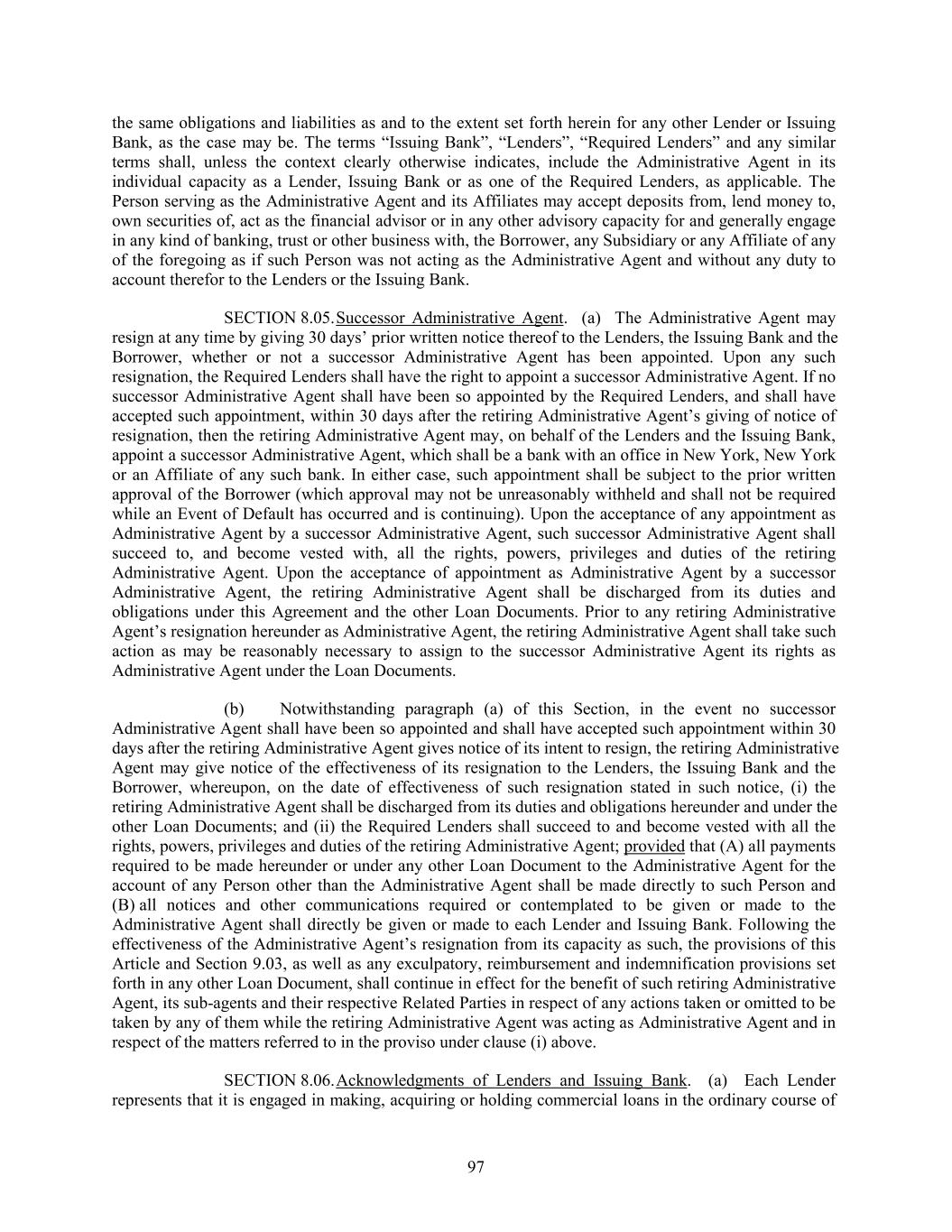 the same obligations and liabilities as and to the extent set forth herein for any other Lender or Issuing Bank, as the case may be. The terms “Issuing Bank”, “Lenders”, “Required Lenders” and any similar terms shall, unless the context clearly otherwise indicates, include the Administrative Agent in its individual capacity as a Lender, Issuing Bank or as one of the Required Lenders, as applicable. The Person serving as the Administrative Agent and its Affiliates may accept deposits from, lend money to, own securities of, act as the financial advisor or in any other advisory capacity for and generally engage in any kind of banking, trust or other business with, the Borrower, any Subsidiary or any Affiliate of any of the foregoing as if such Person was not acting as the Administrative Agent and without any duty to account therefor to the Lenders or the Issuing Bank. SECTION 8.05.Successor Administrative Agent. (a) The Administrative Agent may resign at any time by giving 30 days’ prior written notice thereof to the Lenders, the Issuing Bank and the Borrower, whether or not a successor Administrative Agent has been appointed. Upon any such resignation, the Required Lenders shall have the right to appoint a successor Administrative Agent. If no successor Administrative Agent shall have been so appointed by the Required Lenders, and shall have accepted such appointment, within 30 days after the retiring Administrative Agent’s giving of notice of resignation, then the retiring Administrative Agent may, on behalf of the Lenders and the Issuing Bank, appoint a successor Administrative Agent, which shall be a bank with an office in New York, New York or an Affiliate of any such bank. In either case, such appointment shall be subject to the prior written approval of the Borrower (which approval may not be unreasonably withheld and shall not be required while an Event of Default has occurred and is continuing). Upon the acceptance of any appointment as Administrative Agent by a successor Administrative Agent, such successor Administrative Agent shall succeed to, and become vested with, all the rights, powers, privileges and duties of the retiring Administrative Agent. Upon the acceptance of appointment as Administrative Agent by a successor Administrative Agent, the retiring Administrative Agent shall be discharged from its duties and obligations under this Agreement and the other Loan Documents. Prior to any retiring Administrative Agent’s resignation hereunder as Administrative Agent, the retiring Administrative Agent shall take such action as may be reasonably necessary to assign to the successor Administrative Agent its rights as Administrative Agent under the Loan Documents. (b) Notwithstanding paragraph (a) of this Section, in the event no successor Administrative Agent shall have been so appointed and shall have accepted such appointment within 30 days after the retiring Administrative Agent gives notice of its intent to resign, the retiring Administrative Agent may give notice of the effectiveness of its resignation to the Lenders, the Issuing Bank and the Borrower, whereupon, on the date of effectiveness of such resignation stated in such notice, (i) the retiring Administrative Agent shall be discharged from its duties and obligations hereunder and under the other Loan Documents; and (ii) the Required Lenders shall succeed to and become vested with all the rights, powers, privileges and duties of the retiring Administrative Agent; provided that (A) all payments required to be made hereunder or under any other Loan Document to the Administrative Agent for the account of any Person other than the Administrative Agent shall be made directly to such Person and (B) all notices and other communications required or contemplated to be given or made to the Administrative Agent shall directly be given or made to each Lender and Issuing Bank. Following the effectiveness of the Administrative Agent’s resignation from its capacity as such, the provisions of this Article and Section 9.03, as well as any exculpatory, reimbursement and indemnification provisions set forth in any other Loan Document, shall continue in effect for the benefit of such retiring Administrative Agent, its sub-agents and their respective Related Parties in respect of any actions taken or omitted to be taken by any of them while the retiring Administrative Agent was acting as Administrative Agent and in respect of the matters referred to in the proviso under clause (i) above. SECTION 8.06.Acknowledgments of Lenders and Issuing Bank. (a) Each Lender represents that it is engaged in making, acquiring or holding commercial loans in the ordinary course of 97