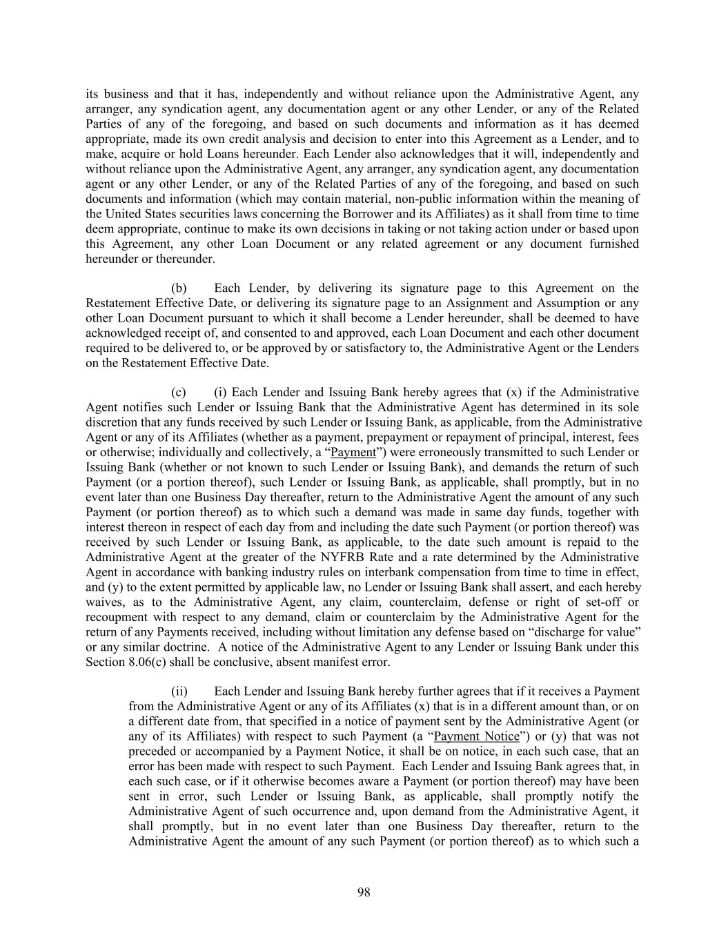 its business and that it has, independently and without reliance upon the Administrative Agent, any arranger, any syndication agent, any documentation agent or any other Lender, or any of the Related Parties of any of the foregoing, and based on such documents and information as it has deemed appropriate, made its own credit analysis and decision to enter into this Agreement as a Lender, and to make, acquire or hold Loans hereunder. Each Lender also acknowledges that it will, independently and without reliance upon the Administrative Agent, any arranger, any syndication agent, any documentation agent or any other Lender, or any of the Related Parties of any of the foregoing, and based on such documents and information (which may contain material, non-public information within the meaning of the United States securities laws concerning the Borrower and its Affiliates) as it shall from time to time deem appropriate, continue to make its own decisions in taking or not taking action under or based upon this Agreement, any other Loan Document or any related agreement or any document furnished hereunder or thereunder. (b) Each Lender, by delivering its signature page to this Agreement on the Restatement Effective Date, or delivering its signature page to an Assignment and Assumption or any other Loan Document pursuant to which it shall become a Lender hereunder, shall be deemed to have acknowledged receipt of, and consented to and approved, each Loan Document and each other document required to be delivered to, or be approved by or satisfactory to, the Administrative Agent or the Lenders on the Restatement Effective Date. (c) (i) Each Lender and Issuing Bank hereby agrees that (x) if the Administrative Agent notifies such Lender or Issuing Bank that the Administrative Agent has determined in its sole discretion that any funds received by such Lender or Issuing Bank, as applicable, from the Administrative Agent or any of its Affiliates (whether as a payment, prepayment or repayment of principal, interest, fees or otherwise; individually and collectively, a “Payment”) were erroneously transmitted to such Lender or Issuing Bank (whether or not known to such Lender or Issuing Bank), and demands the return of such Payment (or a portion thereof), such Lender or Issuing Bank, as applicable, shall promptly, but in no event later than one Business Day thereafter, return to the Administrative Agent the amount of any such Payment (or portion thereof) as to which such a demand was made in same day funds, together with interest thereon in respect of each day from and including the date such Payment (or portion thereof) was received by such Lender or Issuing Bank, as applicable, to the date such amount is repaid to the Administrative Agent at the greater of the NYFRB Rate and a rate determined by the Administrative Agent in accordance with banking industry rules on interbank compensation from time to time in effect, and (y) to the extent permitted by applicable law, no Lender or Issuing Bank shall assert, and each hereby waives, as to the Administrative Agent, any claim, counterclaim, defense or right of set-off or recoupment with respect to any demand, claim or counterclaim by the Administrative Agent for the return of any Payments received, including without limitation any defense based on “discharge for value” or any similar doctrine. A notice of the Administrative Agent to any Lender or Issuing Bank under this Section 8.06(c) shall be conclusive, absent manifest error. (ii) Each Lender and Issuing Bank hereby further agrees that if it receives a Payment from the Administrative Agent or any of its Affiliates (x) that is in a different amount than, or on a different date from, that specified in a notice of payment sent by the Administrative Agent (or any of its Affiliates) with respect to such Payment (a “Payment Notice”) or (y) that was not preceded or accompanied by a Payment Notice, it shall be on notice, in each such case, that an error has been made with respect to such Payment. Each Lender and Issuing Bank agrees that, in each such case, or if it otherwise becomes aware a Payment (or portion thereof) may have been sent in error, such Lender or Issuing Bank, as applicable, shall promptly notify the Administrative Agent of such occurrence and, upon demand from the Administrative Agent, it shall promptly, but in no event later than one Business Day thereafter, return to the Administrative Agent the amount of any such Payment (or portion thereof) as to which such a 98