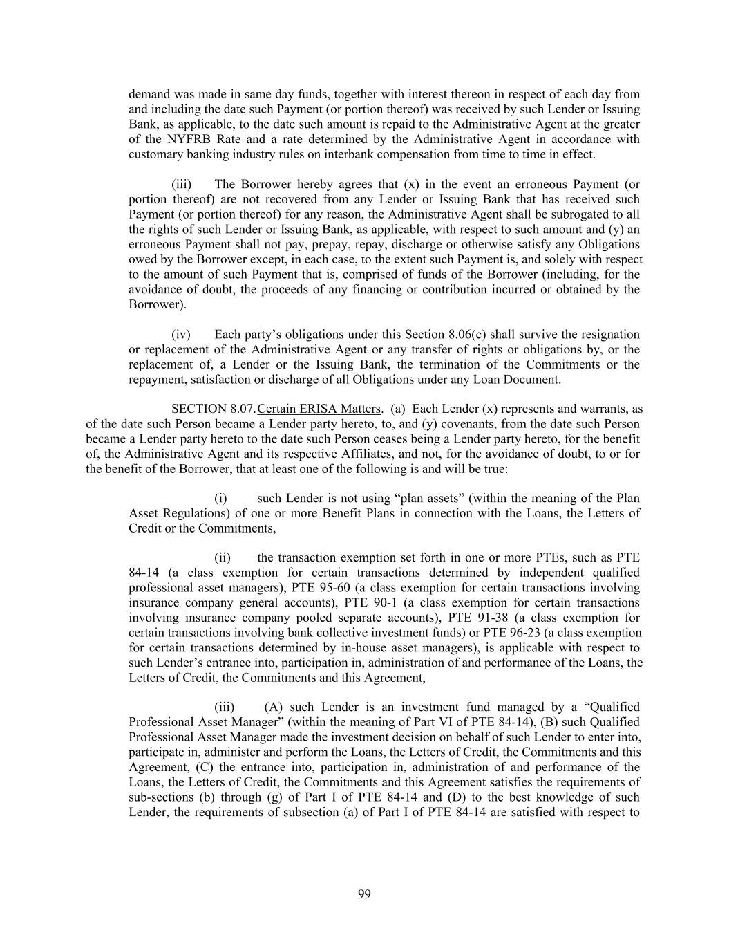 demand was made in same day funds, together with interest thereon in respect of each day from and including the date such Payment (or portion thereof) was received by such Lender or Issuing Bank, as applicable, to the date such amount is repaid to the Administrative Agent at the greater of the NYFRB Rate and a rate determined by the Administrative Agent in accordance with customary banking industry rules on interbank compensation from time to time in effect. (iii) The Borrower hereby agrees that (x) in the event an erroneous Payment (or portion thereof) are not recovered from any Lender or Issuing Bank that has received such Payment (or portion thereof) for any reason, the Administrative Agent shall be subrogated to all the rights of such Lender or Issuing Bank, as applicable, with respect to such amount and (y) an erroneous Payment shall not pay, prepay, repay, discharge or otherwise satisfy any Obligations owed by the Borrower except, in each case, to the extent such Payment is, and solely with respect to the amount of such Payment that is, comprised of funds of the Borrower (including, for the avoidance of doubt, the proceeds of any financing or contribution incurred or obtained by the Borrower). (iv) Each party’s obligations under this Section 8.06(c) shall survive the resignation or replacement of the Administrative Agent or any transfer of rights or obligations by, or the replacement of, a Lender or the Issuing Bank, the termination of the Commitments or the repayment, satisfaction or discharge of all Obligations under any Loan Document. SECTION 8.07.Certain ERISA Matters. (a) Each Lender (x) represents and warrants, as of the date such Person became a Lender party hereto, to, and (y) covenants, from the date such Person became a Lender party hereto to the date such Person ceases being a Lender party hereto, for the benefit of, the Administrative Agent and its respective Affiliates, and not, for the avoidance of doubt, to or for the benefit of the Borrower, that at least one of the following is and will be true: (i) such Lender is not using “plan assets” (within the meaning of the Plan Asset Regulations) of one or more Benefit Plans in connection with the Loans, the Letters of Credit or the Commitments, (ii) the transaction exemption set forth in one or more PTEs, such as PTE 84-14 (a class exemption for certain transactions determined by independent qualified professional asset managers), PTE 95-60 (a class exemption for certain transactions involving insurance company general accounts), PTE 90-1 (a class exemption for certain transactions involving insurance company pooled separate accounts), PTE 91-38 (a class exemption for certain transactions involving bank collective investment funds) or PTE 96-23 (a class exemption for certain transactions determined by in-house asset managers), is applicable with respect to such Lender’s entrance into, participation in, administration of and performance of the Loans, the Letters of Credit, the Commitments and this Agreement, (iii) (A) such Lender is an investment fund managed by a “Qualified Professional Asset Manager” (within the meaning of Part VI of PTE 84-14), (B) such Qualified Professional Asset Manager made the investment decision on behalf of such Lender to enter into, participate in, administer and perform the Loans, the Letters of Credit, the Commitments and this Agreement, (C) the entrance into, participation in, administration of and performance of the Loans, the Letters of Credit, the Commitments and this Agreement satisfies the requirements of sub-sections (b) through (g) of Part I of PTE 84-14 and (D) to the best knowledge of such Lender, the requirements of subsection (a) of Part I of PTE 84-14 are satisfied with respect to 99