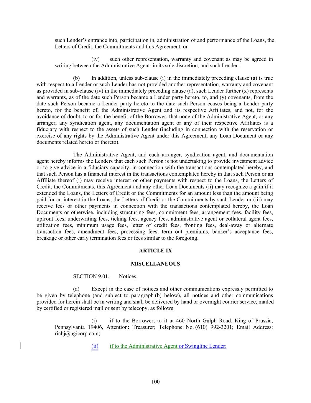 such Lender’s entrance into, participation in, administration of and performance of the Loans, the Letters of Credit, the Commitments and this Agreement, or (iv) such other representation, warranty and covenant as may be agreed in writing between the Administrative Agent, in its sole discretion, and such Lender. (b) In addition, unless sub-clause (i) in the immediately preceding clause (a) is true with respect to a Lender or such Lender has not provided another representation, warranty and covenant as provided in sub-clause (iv) in the immediately preceding clause (a), such Lender further (x) represents and warrants, as of the date such Person became a Lender party hereto, to, and (y) covenants, from the date such Person became a Lender party hereto to the date such Person ceases being a Lender party hereto, for the benefit of, the Administrative Agent and its respective Affiliates, and not, for the avoidance of doubt, to or for the benefit of the Borrower, that none of the Administrative Agent, or any arranger, any syndication agent, any documentation agent or any of their respective Affiliates is a fiduciary with respect to the assets of such Lender (including in connection with the reservation or exercise of any rights by the Administrative Agent under this Agreement, any Loan Document or any documents related hereto or thereto). The Administrative Agent, and each arranger, syndication agent, and documentation agent hereby informs the Lenders that each such Person is not undertaking to provide investment advice or to give advice in a fiduciary capacity, in connection with the transactions contemplated hereby, and that such Person has a financial interest in the transactions contemplated hereby in that such Person or an Affiliate thereof (i) may receive interest or other payments with respect to the Loans, the Letters of Credit, the Commitments, this Agreement and any other Loan Documents (ii) may recognize a gain if it extended the Loans, the Letters of Credit or the Commitments for an amount less than the amount being paid for an interest in the Loans, the Letters of Credit or the Commitments by such Lender or (iii) may receive fees or other payments in connection with the transactions contemplated hereby, the Loan Documents or otherwise, including structuring fees, commitment fees, arrangement fees, facility fees, upfront fees, underwriting fees, ticking fees, agency fees, administrative agent or collateral agent fees, utilization fees, minimum usage fees, letter of credit fees, fronting fees, deal-away or alternate transaction fees, amendment fees, processing fees, term out premiums, banker’s acceptance fees, breakage or other early termination fees or fees similar to the foregoing. ARTICLE IX MISCELLANEOUS SECTION 9.01. Notices. (a) Except in the case of notices and other communications expressly permitted to be given by telephone (and subject to paragraph (b) below), all notices and other communications provided for herein shall be in writing and shall be delivered by hand or overnight courier service, mailed by certified or registered mail or sent by telecopy, as follows: (i) if to the Borrower, to it at 460 North Gulph Road, King of Prussia, Pennsylvania 19406, Attention: Treasurer; Telephone No. (610) 992-3201; Email Address: richj@ugicorp.com; (ii) if to the Administrative Agent or Swingline Lender: 100
