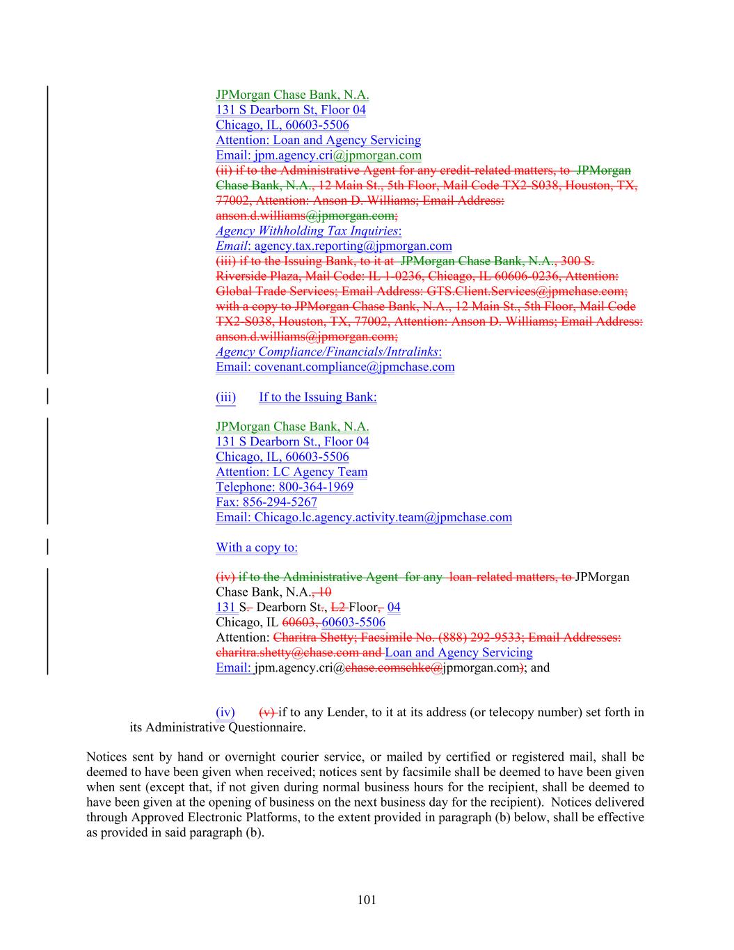 JPMorgan Chase Bank, N.A. 131 S Dearborn St, Floor 04 Chicago, IL, 60603-5506 Attention: Loan and Agency Servicing Email: jpm.agency.cri@jpmorgan.com (ii) if to the Administrative Agent for any credit-related matters, to JPMorgan Chase Bank, N.A., 12 Main St., 5th Floor, Mail Code TX2-S038, Houston, TX, 77002, Attention: Anson D. Williams; Email Address: anson.d.williams@jpmorgan.com; Agency Withholding Tax Inquiries: Email: agency.tax.reporting@jpmorgan.com (iii) if to the Issuing Bank, to it at JPMorgan Chase Bank, N.A., 300 S. Riverside Plaza, Mail Code: IL 1-0236, Chicago, IL 60606-0236, Attention: Global Trade Services; Email Address: GTS.Client.Services@jpmchase.com; with a copy to JPMorgan Chase Bank, N.A., 12 Main St., 5th Floor, Mail Code TX2-S038, Houston, TX, 77002, Attention: Anson D. Williams; Email Address: anson.d.williams@jpmorgan.com; Agency Compliance/Financials/Intralinks: Email: covenant.compliance@jpmchase.com (iii) If to the Issuing Bank: JPMorgan Chase Bank, N.A. 131 S Dearborn St., Floor 04 Chicago, IL, 60603-5506 Attention: LC Agency Team Telephone: 800-364-1969 Fax: 856-294-5267 Email: Chicago.lc.agency.activity.team@jpmchase.com With a copy to: (iv) if to the Administrative Agent for any loan-related matters, to JPMorgan Chase Bank, N.A., 10 131 S. Dearborn St., L2 Floor, 04 Chicago, IL 60603, 60603-5506 Attention: Charitra Shetty; Facsimile No. (888) 292-9533; Email Addresses: charitra.shetty@chase.com and Loan and Agency Servicing Email: jpm.agency.cri@chase.comschke@jpmorgan.com); and (iv) (v) if to any Lender, to it at its address (or telecopy number) set forth in its Administrative Questionnaire. Notices sent by hand or overnight courier service, or mailed by certified or registered mail, shall be deemed to have been given when received; notices sent by facsimile shall be deemed to have been given when sent (except that, if not given during normal business hours for the recipient, shall be deemed to have been given at the opening of business on the next business day for the recipient). Notices delivered through Approved Electronic Platforms, to the extent provided in paragraph (b) below, shall be effective as provided in said paragraph (b). 101