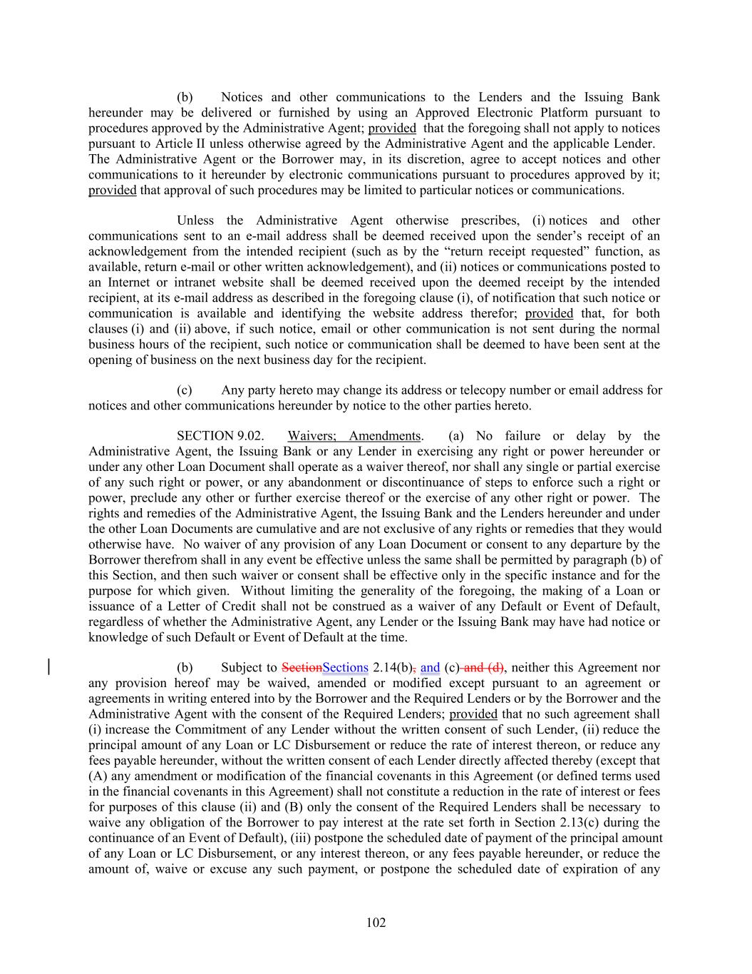 (b) Notices and other communications to the Lenders and the Issuing Bank hereunder may be delivered or furnished by using an Approved Electronic Platform pursuant to procedures approved by the Administrative Agent; provided that the foregoing shall not apply to notices pursuant to Article II unless otherwise agreed by the Administrative Agent and the applicable Lender. The Administrative Agent or the Borrower may, in its discretion, agree to accept notices and other communications to it hereunder by electronic communications pursuant to procedures approved by it; provided that approval of such procedures may be limited to particular notices or communications. Unless the Administrative Agent otherwise prescribes, (i) notices and other communications sent to an e-mail address shall be deemed received upon the sender’s receipt of an acknowledgement from the intended recipient (such as by the “return receipt requested” function, as available, return e-mail or other written acknowledgement), and (ii) notices or communications posted to an Internet or intranet website shall be deemed received upon the deemed receipt by the intended recipient, at its e-mail address as described in the foregoing clause (i), of notification that such notice or communication is available and identifying the website address therefor; provided that, for both clauses (i) and (ii) above, if such notice, email or other communication is not sent during the normal business hours of the recipient, such notice or communication shall be deemed to have been sent at the opening of business on the next business day for the recipient. (c) Any party hereto may change its address or telecopy number or email address for notices and other communications hereunder by notice to the other parties hereto. SECTION 9.02. Waivers; Amendments. (a) No failure or delay by the Administrative Agent, the Issuing Bank or any Lender in exercising any right or power hereunder or under any other Loan Document shall operate as a waiver thereof, nor shall any single or partial exercise of any such right or power, or any abandonment or discontinuance of steps to enforce such a right or power, preclude any other or further exercise thereof or the exercise of any other right or power. The rights and remedies of the Administrative Agent, the Issuing Bank and the Lenders hereunder and under the other Loan Documents are cumulative and are not exclusive of any rights or remedies that they would otherwise have. No waiver of any provision of any Loan Document or consent to any departure by the Borrower therefrom shall in any event be effective unless the same shall be permitted by paragraph (b) of this Section, and then such waiver or consent shall be effective only in the specific instance and for the purpose for which given. Without limiting the generality of the foregoing, the making of a Loan or issuance of a Letter of Credit shall not be construed as a waiver of any Default or Event of Default, regardless of whether the Administrative Agent, any Lender or the Issuing Bank may have had notice or knowledge of such Default or Event of Default at the time. (b) Subject to SectionSections 2.14(b), and (c) and (d), neither this Agreement nor any provision hereof may be waived, amended or modified except pursuant to an agreement or agreements in writing entered into by the Borrower and the Required Lenders or by the Borrower and the Administrative Agent with the consent of the Required Lenders; provided that no such agreement shall (i) increase the Commitment of any Lender without the written consent of such Lender, (ii) reduce the principal amount of any Loan or LC Disbursement or reduce the rate of interest thereon, or reduce any fees payable hereunder, without the written consent of each Lender directly affected thereby (except that (A) any amendment or modification of the financial covenants in this Agreement (or defined terms used in the financial covenants in this Agreement) shall not constitute a reduction in the rate of interest or fees for purposes of this clause (ii) and (B) only the consent of the Required Lenders shall be necessary to waive any obligation of the Borrower to pay interest at the rate set forth in Section 2.13(c) during the continuance of an Event of Default), (iii) postpone the scheduled date of payment of the principal amount of any Loan or LC Disbursement, or any interest thereon, or any fees payable hereunder, or reduce the amount of, waive or excuse any such payment, or postpone the scheduled date of expiration of any 102