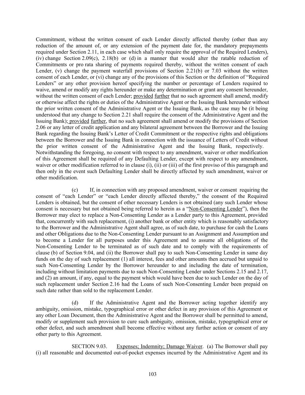 Commitment, without the written consent of each Lender directly affected thereby (other than any reduction of the amount of, or any extension of the payment date for, the mandatory prepayments required under Section 2.11, in each case which shall only require the approval of the Required Lenders), (iv) change Section 2.09(c), 2.18(b) or (d) in a manner that would alter the ratable reduction of Commitments or pro rata sharing of payments required thereby, without the written consent of each Lender, (v) change the payment waterfall provisions of Section 2.21(b) or 7.03 without the written consent of each Lender, or (vi) change any of the provisions of this Section or the definition of “Required Lenders” or any other provision hereof specifying the number or percentage of Lenders required to waive, amend or modify any rights hereunder or make any determination or grant any consent hereunder, without the written consent of each Lender; provided further that no such agreement shall amend, modify or otherwise affect the rights or duties of the Administrative Agent or the Issuing Bank hereunder without the prior written consent of the Administrative Agent or the Issuing Bank, as the case may be (it being understood that any change to Section 2.21 shall require the consent of the Administrative Agent and the Issuing Bank); provided further, that no such agreement shall amend or modify the provisions of Section 2.06 or any letter of credit application and any bilateral agreement between the Borrower and the Issuing Bank regarding the Issuing Bank’s Letter of Credit Commitment or the respective rights and obligations between the Borrower and the Issuing Bank in connection with the issuance of Letters of Credit without the prior written consent of the Administrative Agent and the Issuing Bank, respectively. Notwithstanding the foregoing, no consent with respect to any amendment, waiver or other modification of this Agreement shall be required of any Defaulting Lender, except with respect to any amendment, waiver or other modification referred to in clause (i), (ii) or (iii) of the first proviso of this paragraph and then only in the event such Defaulting Lender shall be directly affected by such amendment, waiver or other modification. (c) If, in connection with any proposed amendment, waiver or consent requiring the consent of “each Lender” or “each Lender directly affected thereby,” the consent of the Required Lenders is obtained, but the consent of other necessary Lenders is not obtained (any such Lender whose consent is necessary but not obtained being referred to herein as a “Non-Consenting Lender”), then the Borrower may elect to replace a Non-Consenting Lender as a Lender party to this Agreement, provided that, concurrently with such replacement, (i) another bank or other entity which is reasonably satisfactory to the Borrower and the Administrative Agent shall agree, as of such date, to purchase for cash the Loans and other Obligations due to the Non-Consenting Lender pursuant to an Assignment and Assumption and to become a Lender for all purposes under this Agreement and to assume all obligations of the Non-Consenting Lender to be terminated as of such date and to comply with the requirements of clause (b) of Section 9.04, and (ii) the Borrower shall pay to such Non-Consenting Lender in same day funds on the day of such replacement (1) all interest, fees and other amounts then accrued but unpaid to such Non-Consenting Lender by the Borrower hereunder to and including the date of termination, including without limitation payments due to such Non-Consenting Lender under Sections 2.15 and 2.17, and (2) an amount, if any, equal to the payment which would have been due to such Lender on the day of such replacement under Section 2.16 had the Loans of such Non-Consenting Lender been prepaid on such date rather than sold to the replacement Lender. (d) If the Administrative Agent and the Borrower acting together identify any ambiguity, omission, mistake, typographical error or other defect in any provision of this Agreement or any other Loan Document, then the Administrative Agent and the Borrower shall be permitted to amend, modify or supplement such provision to cure such ambiguity, omission, mistake, typographical error or other defect, and such amendment shall become effective without any further action or consent of any other party to this Agreement. SECTION 9.03. Expenses; Indemnity; Damage Waiver. (a) The Borrower shall pay (i) all reasonable and documented out-of-pocket expenses incurred by the Administrative Agent and its 103