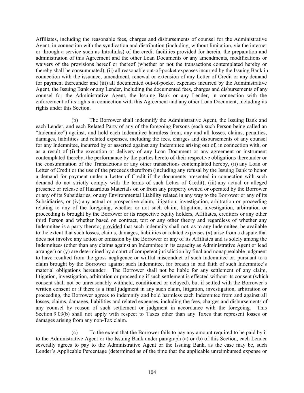 Affiliates, including the reasonable fees, charges and disbursements of counsel for the Administrative Agent, in connection with the syndication and distribution (including, without limitation, via the internet or through a service such as Intralinks) of the credit facilities provided for herein, the preparation and administration of this Agreement and the other Loan Documents or any amendments, modifications or waivers of the provisions hereof or thereof (whether or not the transactions contemplated hereby or thereby shall be consummated), (ii) all reasonable out-of-pocket expenses incurred by the Issuing Bank in connection with the issuance, amendment, renewal or extension of any Letter of Credit or any demand for payment thereunder and (iii) all documented out-of-pocket expenses incurred by the Administrative Agent, the Issuing Bank or any Lender, including the documented fees, charges and disbursements of any counsel for the Administrative Agent, the Issuing Bank or any Lender, in connection with the enforcement of its rights in connection with this Agreement and any other Loan Document, including its rights under this Section. (b) The Borrower shall indemnify the Administrative Agent, the Issuing Bank and each Lender, and each Related Party of any of the foregoing Persons (each such Person being called an “Indemnitee”) against, and hold each Indemnitee harmless from, any and all losses, claims, penalties, damages, liabilities and related expenses, including the fees, charges and disbursements of any counsel for any Indemnitee, incurred by or asserted against any Indemnitee arising out of, in connection with, or as a result of (i) the execution or delivery of any Loan Document or any agreement or instrument contemplated thereby, the performance by the parties hereto of their respective obligations thereunder or the consummation of the Transactions or any other transactions contemplated hereby, (ii) any Loan or Letter of Credit or the use of the proceeds therefrom (including any refusal by the Issuing Bank to honor a demand for payment under a Letter of Credit if the documents presented in connection with such demand do not strictly comply with the terms of such Letter of Credit), (iii) any actual or alleged presence or release of Hazardous Materials on or from any property owned or operated by the Borrower or any of its Subsidiaries, or any Environmental Liability related in any way to the Borrower or any of its Subsidiaries, or (iv) any actual or prospective claim, litigation, investigation, arbitration or proceeding relating to any of the foregoing, whether or not such claim, litigation, investigation, arbitration or proceeding is brought by the Borrower or its respective equity holders, Affiliates, creditors or any other third Person and whether based on contract, tort or any other theory and regardless of whether any Indemnitee is a party thereto; provided that such indemnity shall not, as to any Indemnitee, be available to the extent that such losses, claims, damages, liabilities or related expenses (x) arise from a dispute that does not involve any action or omission by the Borrower or any of its Affiliates and is solely among the Indemnitees (other than any claims against an Indemnitee in its capacity as Administrative Agent or lead arranger) or (y) are determined by a court of competent jurisdiction by final and nonappealable judgment to have resulted from the gross negligence or willful misconduct of such Indemnitee or, pursuant to a claim brought by the Borrower against such Indemnitee, for breach in bad faith of such Indemnitee’s material obligations hereunder. The Borrower shall not be liable for any settlement of any claim, litigation, investigation, arbitration or proceeding if such settlement is effected without its consent (which consent shall not be unreasonably withheld, conditioned or delayed), but if settled with the Borrower’s written consent or if there is a final judgment in any such claim, litigation, investigation, arbitration or proceeding, the Borrower agrees to indemnify and hold harmless each Indemnitee from and against all losses, claims, damages, liabilities and related expenses, including the fees, charges and disbursements of any counsel by reason of such settlement or judgment in accordance with the foregoing. This Section 9.03(b) shall not apply with respect to Taxes other than any Taxes that represent losses or damages arising from any non-Tax claim. (c) To the extent that the Borrower fails to pay any amount required to be paid by it to the Administrative Agent or the Issuing Bank under paragraph (a) or (b) of this Section, each Lender severally agrees to pay to the Administrative Agent or the Issuing Bank, as the case may be, such Lender’s Applicable Percentage (determined as of the time that the applicable unreimbursed expense or 104