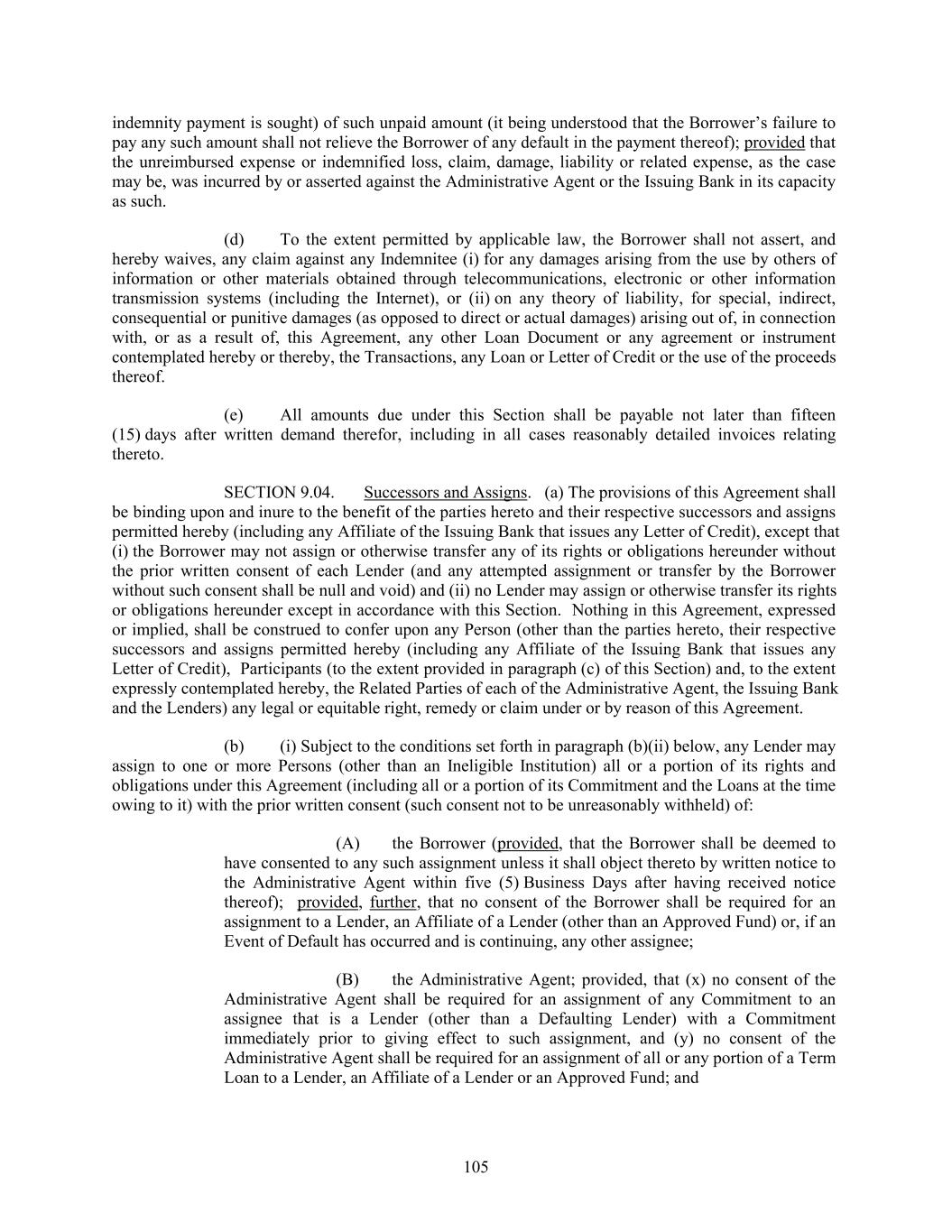 indemnity payment is sought) of such unpaid amount (it being understood that the Borrower’s failure to pay any such amount shall not relieve the Borrower of any default in the payment thereof); provided that the unreimbursed expense or indemnified loss, claim, damage, liability or related expense, as the case may be, was incurred by or asserted against the Administrative Agent or the Issuing Bank in its capacity as such. (d) To the extent permitted by applicable law, the Borrower shall not assert, and hereby waives, any claim against any Indemnitee (i) for any damages arising from the use by others of information or other materials obtained through telecommunications, electronic or other information transmission systems (including the Internet), or (ii) on any theory of liability, for special, indirect, consequential or punitive damages (as opposed to direct or actual damages) arising out of, in connection with, or as a result of, this Agreement, any other Loan Document or any agreement or instrument contemplated hereby or thereby, the Transactions, any Loan or Letter of Credit or the use of the proceeds thereof. (e) All amounts due under this Section shall be payable not later than fifteen (15) days after written demand therefor, including in all cases reasonably detailed invoices relating thereto. SECTION 9.04. Successors and Assigns. (a) The provisions of this Agreement shall be binding upon and inure to the benefit of the parties hereto and their respective successors and assigns permitted hereby (including any Affiliate of the Issuing Bank that issues any Letter of Credit), except that (i) the Borrower may not assign or otherwise transfer any of its rights or obligations hereunder without the prior written consent of each Lender (and any attempted assignment or transfer by the Borrower without such consent shall be null and void) and (ii) no Lender may assign or otherwise transfer its rights or obligations hereunder except in accordance with this Section. Nothing in this Agreement, expressed or implied, shall be construed to confer upon any Person (other than the parties hereto, their respective successors and assigns permitted hereby (including any Affiliate of the Issuing Bank that issues any Letter of Credit), Participants (to the extent provided in paragraph (c) of this Section) and, to the extent expressly contemplated hereby, the Related Parties of each of the Administrative Agent, the Issuing Bank and the Lenders) any legal or equitable right, remedy or claim under or by reason of this Agreement. (b) (i) Subject to the conditions set forth in paragraph (b)(ii) below, any Lender may assign to one or more Persons (other than an Ineligible Institution) all or a portion of its rights and obligations under this Agreement (including all or a portion of its Commitment and the Loans at the time owing to it) with the prior written consent (such consent not to be unreasonably withheld) of: (A) the Borrower (provided, that the Borrower shall be deemed to have consented to any such assignment unless it shall object thereto by written notice to the Administrative Agent within five (5) Business Days after having received notice thereof); provided, further, that no consent of the Borrower shall be required for an assignment to a Lender, an Affiliate of a Lender (other than an Approved Fund) or, if an Event of Default has occurred and is continuing, any other assignee; (B) the Administrative Agent; provided, that (x) no consent of the Administrative Agent shall be required for an assignment of any Commitment to an assignee that is a Lender (other than a Defaulting Lender) with a Commitment immediately prior to giving effect to such assignment, and (y) no consent of the Administrative Agent shall be required for an assignment of all or any portion of a Term Loan to a Lender, an Affiliate of a Lender or an Approved Fund; and 105