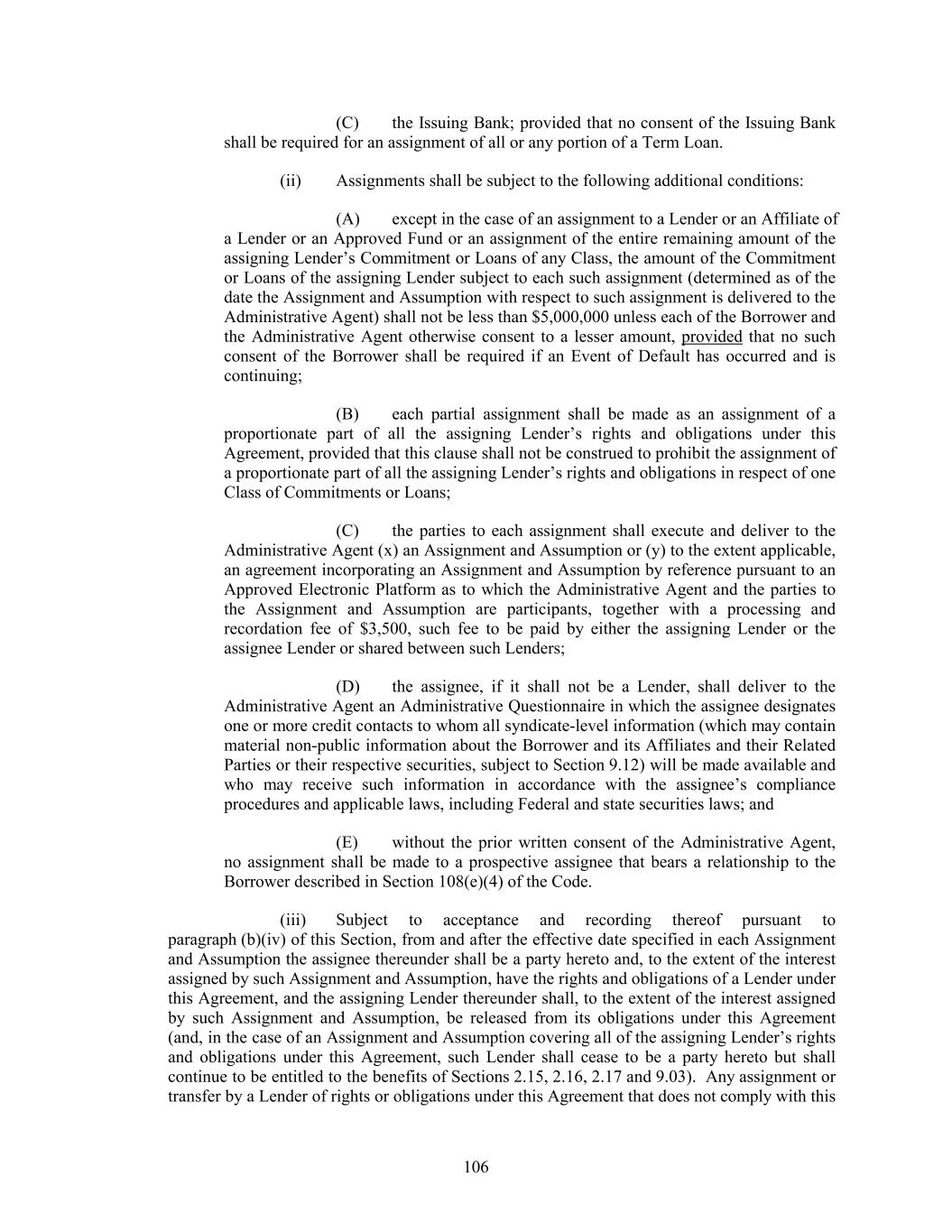 (C) the Issuing Bank; provided that no consent of the Issuing Bank shall be required for an assignment of all or any portion of a Term Loan. (ii) Assignments shall be subject to the following additional conditions: (A) except in the case of an assignment to a Lender or an Affiliate of a Lender or an Approved Fund or an assignment of the entire remaining amount of the assigning Lender’s Commitment or Loans of any Class, the amount of the Commitment or Loans of the assigning Lender subject to each such assignment (determined as of the date the Assignment and Assumption with respect to such assignment is delivered to the Administrative Agent) shall not be less than $5,000,000 unless each of the Borrower and the Administrative Agent otherwise consent to a lesser amount, provided that no such consent of the Borrower shall be required if an Event of Default has occurred and is continuing; (B) each partial assignment shall be made as an assignment of a proportionate part of all the assigning Lender’s rights and obligations under this Agreement, provided that this clause shall not be construed to prohibit the assignment of a proportionate part of all the assigning Lender’s rights and obligations in respect of one Class of Commitments or Loans; (C) the parties to each assignment shall execute and deliver to the Administrative Agent (x) an Assignment and Assumption or (y) to the extent applicable, an agreement incorporating an Assignment and Assumption by reference pursuant to an Approved Electronic Platform as to which the Administrative Agent and the parties to the Assignment and Assumption are participants, together with a processing and recordation fee of $3,500, such fee to be paid by either the assigning Lender or the assignee Lender or shared between such Lenders; (D) the assignee, if it shall not be a Lender, shall deliver to the Administrative Agent an Administrative Questionnaire in which the assignee designates one or more credit contacts to whom all syndicate-level information (which may contain material non-public information about the Borrower and its Affiliates and their Related Parties or their respective securities, subject to Section 9.12) will be made available and who may receive such information in accordance with the assignee’s compliance procedures and applicable laws, including Federal and state securities laws; and (E) without the prior written consent of the Administrative Agent, no assignment shall be made to a prospective assignee that bears a relationship to the Borrower described in Section 108(e)(4) of the Code. (iii) Subject to acceptance and recording thereof pursuant to paragraph (b)(iv) of this Section, from and after the effective date specified in each Assignment and Assumption the assignee thereunder shall be a party hereto and, to the extent of the interest assigned by such Assignment and Assumption, have the rights and obligations of a Lender under this Agreement, and the assigning Lender thereunder shall, to the extent of the interest assigned by such Assignment and Assumption, be released from its obligations under this Agreement (and, in the case of an Assignment and Assumption covering all of the assigning Lender’s rights and obligations under this Agreement, such Lender shall cease to be a party hereto but shall continue to be entitled to the benefits of Sections 2.15, 2.16, 2.17 and 9.03). Any assignment or transfer by a Lender of rights or obligations under this Agreement that does not comply with this 106