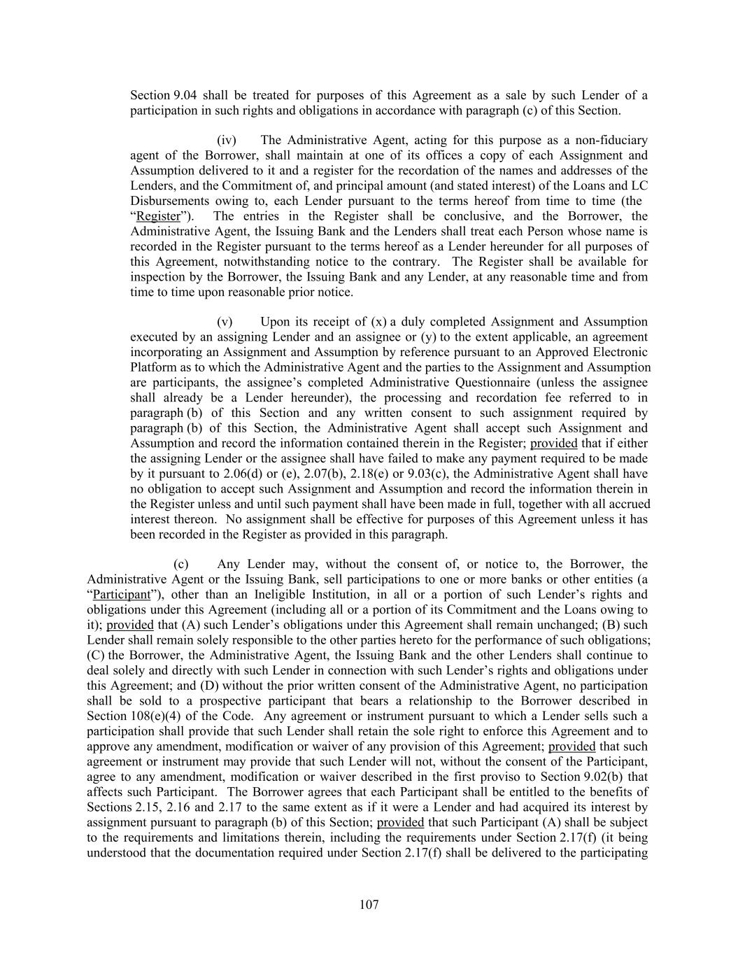 Section 9.04 shall be treated for purposes of this Agreement as a sale by such Lender of a participation in such rights and obligations in accordance with paragraph (c) of this Section. (iv) The Administrative Agent, acting for this purpose as a non-fiduciary agent of the Borrower, shall maintain at one of its offices a copy of each Assignment and Assumption delivered to it and a register for the recordation of the names and addresses of the Lenders, and the Commitment of, and principal amount (and stated interest) of the Loans and LC Disbursements owing to, each Lender pursuant to the terms hereof from time to time (the “Register”). The entries in the Register shall be conclusive, and the Borrower, the Administrative Agent, the Issuing Bank and the Lenders shall treat each Person whose name is recorded in the Register pursuant to the terms hereof as a Lender hereunder for all purposes of this Agreement, notwithstanding notice to the contrary. The Register shall be available for inspection by the Borrower, the Issuing Bank and any Lender, at any reasonable time and from time to time upon reasonable prior notice. (v) Upon its receipt of (x) a duly completed Assignment and Assumption executed by an assigning Lender and an assignee or (y) to the extent applicable, an agreement incorporating an Assignment and Assumption by reference pursuant to an Approved Electronic Platform as to which the Administrative Agent and the parties to the Assignment and Assumption are participants, the assignee’s completed Administrative Questionnaire (unless the assignee shall already be a Lender hereunder), the processing and recordation fee referred to in paragraph (b) of this Section and any written consent to such assignment required by paragraph (b) of this Section, the Administrative Agent shall accept such Assignment and Assumption and record the information contained therein in the Register; provided that if either the assigning Lender or the assignee shall have failed to make any payment required to be made by it pursuant to 2.06(d) or (e), 2.07(b), 2.18(e) or 9.03(c), the Administrative Agent shall have no obligation to accept such Assignment and Assumption and record the information therein in the Register unless and until such payment shall have been made in full, together with all accrued interest thereon. No assignment shall be effective for purposes of this Agreement unless it has been recorded in the Register as provided in this paragraph. (c) Any Lender may, without the consent of, or notice to, the Borrower, the Administrative Agent or the Issuing Bank, sell participations to one or more banks or other entities (a “Participant”), other than an Ineligible Institution, in all or a portion of such Lender’s rights and obligations under this Agreement (including all or a portion of its Commitment and the Loans owing to it); provided that (A) such Lender’s obligations under this Agreement shall remain unchanged; (B) such Lender shall remain solely responsible to the other parties hereto for the performance of such obligations; (C) the Borrower, the Administrative Agent, the Issuing Bank and the other Lenders shall continue to deal solely and directly with such Lender in connection with such Lender’s rights and obligations under this Agreement; and (D) without the prior written consent of the Administrative Agent, no participation shall be sold to a prospective participant that bears a relationship to the Borrower described in Section 108(e)(4) of the Code. Any agreement or instrument pursuant to which a Lender sells such a participation shall provide that such Lender shall retain the sole right to enforce this Agreement and to approve any amendment, modification or waiver of any provision of this Agreement; provided that such agreement or instrument may provide that such Lender will not, without the consent of the Participant, agree to any amendment, modification or waiver described in the first proviso to Section 9.02(b) that affects such Participant. The Borrower agrees that each Participant shall be entitled to the benefits of Sections 2.15, 2.16 and 2.17 to the same extent as if it were a Lender and had acquired its interest by assignment pursuant to paragraph (b) of this Section; provided that such Participant (A) shall be subject to the requirements and limitations therein, including the requirements under Section 2.17(f) (it being understood that the documentation required under Section 2.17(f) shall be delivered to the participating 107
