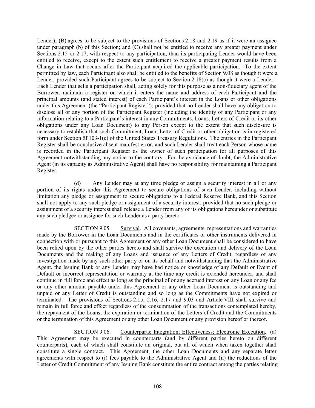 Lender); (B) agrees to be subject to the provisions of Sections 2.18 and 2.19 as if it were an assignee under paragraph (b) of this Section; and (C) shall not be entitled to receive any greater payment under Sections 2.15 or 2.17, with respect to any participation, than its participating Lender would have been entitled to receive, except to the extent such entitlement to receive a greater payment results from a Change in Law that occurs after the Participant acquired the applicable participation. To the extent permitted by law, each Participant also shall be entitled to the benefits of Section 9.08 as though it were a Lender, provided such Participant agrees to be subject to Section 2.18(c) as though it were a Lender. Each Lender that sells a participation shall, acting solely for this purpose as a non-fiduciary agent of the Borrower, maintain a register on which it enters the name and address of each Participant and the principal amounts (and stated interest) of each Participant’s interest in the Loans or other obligations under this Agreement (the “Participant Register”); provided that no Lender shall have any obligation to disclose all or any portion of the Participant Register (including the identity of any Participant or any information relating to a Participant’s interest in any Commitments, Loans, Letters of Credit or its other obligations under any Loan Document) to any Person except to the extent that such disclosure is necessary to establish that such Commitment, Loan, Letter of Credit or other obligation is in registered form under Section 5f.103-1(c) of the United States Treasury Regulations. The entries in the Participant Register shall be conclusive absent manifest error, and such Lender shall treat each Person whose name is recorded in the Participant Register as the owner of such participation for all purposes of this Agreement notwithstanding any notice to the contrary. For the avoidance of doubt, the Administrative Agent (in its capacity as Administrative Agent) shall have no responsibility for maintaining a Participant Register. (d) Any Lender may at any time pledge or assign a security interest in all or any portion of its rights under this Agreement to secure obligations of such Lender, including without limitation any pledge or assignment to secure obligations to a Federal Reserve Bank, and this Section shall not apply to any such pledge or assignment of a security interest; provided that no such pledge or assignment of a security interest shall release a Lender from any of its obligations hereunder or substitute any such pledgee or assignee for such Lender as a party hereto. SECTION 9.05. Survival. All covenants, agreements, representations and warranties made by the Borrower in the Loan Documents and in the certificates or other instruments delivered in connection with or pursuant to this Agreement or any other Loan Document shall be considered to have been relied upon by the other parties hereto and shall survive the execution and delivery of the Loan Documents and the making of any Loans and issuance of any Letters of Credit, regardless of any investigation made by any such other party or on its behalf and notwithstanding that the Administrative Agent, the Issuing Bank or any Lender may have had notice or knowledge of any Default or Event of Default or incorrect representation or warranty at the time any credit is extended hereunder, and shall continue in full force and effect as long as the principal of or any accrued interest on any Loan or any fee or any other amount payable under this Agreement or any other Loan Document is outstanding and unpaid or any Letter of Credit is outstanding and so long as the Commitments have not expired or terminated. The provisions of Sections 2.15, 2.16, 2.17 and 9.03 and Article VIII shall survive and remain in full force and effect regardless of the consummation of the transactions contemplated hereby, the repayment of the Loans, the expiration or termination of the Letters of Credit and the Commitments or the termination of this Agreement or any other Loan Document or any provision hereof or thereof. SECTION 9.06. Counterparts; Integration; Effectiveness; Electronic Execution. (a) This Agreement may be executed in counterparts (and by different parties hereto on different counterparts), each of which shall constitute an original, but all of which when taken together shall constitute a single contract. This Agreement, the other Loan Documents and any separate letter agreements with respect to (i) fees payable to the Administrative Agent and (ii) the reductions of the Letter of Credit Commitment of any Issuing Bank constitute the entire contract among the parties relating 108