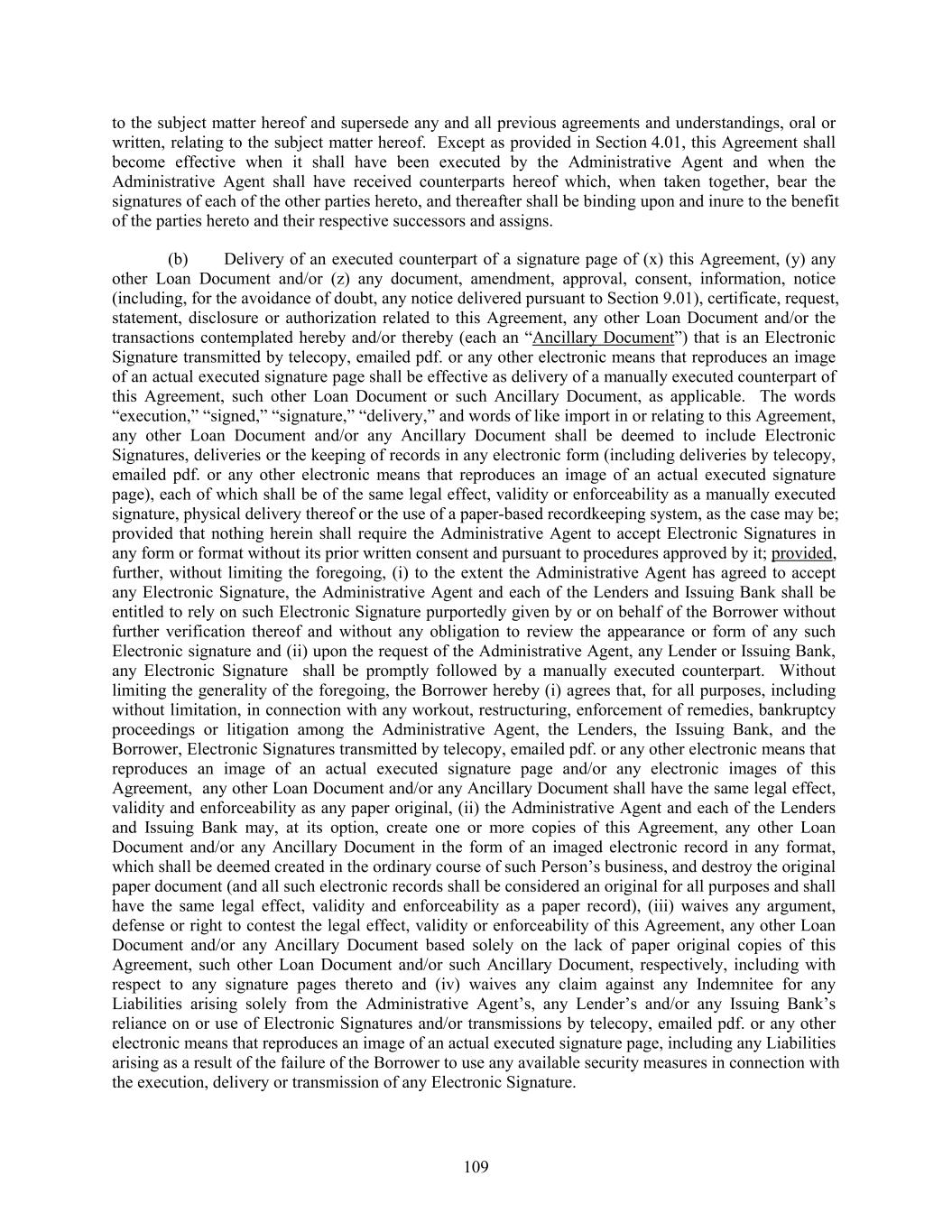 to the subject matter hereof and supersede any and all previous agreements and understandings, oral or written, relating to the subject matter hereof. Except as provided in Section 4.01, this Agreement shall become effective when it shall have been executed by the Administrative Agent and when the Administrative Agent shall have received counterparts hereof which, when taken together, bear the signatures of each of the other parties hereto, and thereafter shall be binding upon and inure to the benefit of the parties hereto and their respective successors and assigns. (b) Delivery of an executed counterpart of a signature page of (x) this Agreement, (y) any other Loan Document and/or (z) any document, amendment, approval, consent, information, notice (including, for the avoidance of doubt, any notice delivered pursuant to Section 9.01), certificate, request, statement, disclosure or authorization related to this Agreement, any other Loan Document and/or the transactions contemplated hereby and/or thereby (each an “Ancillary Document”) that is an Electronic Signature transmitted by telecopy, emailed pdf. or any other electronic means that reproduces an image of an actual executed signature page shall be effective as delivery of a manually executed counterpart of this Agreement, such other Loan Document or such Ancillary Document, as applicable. The words “execution,” “signed,” “signature,” “delivery,” and words of like import in or relating to this Agreement, any other Loan Document and/or any Ancillary Document shall be deemed to include Electronic Signatures, deliveries or the keeping of records in any electronic form (including deliveries by telecopy, emailed pdf. or any other electronic means that reproduces an image of an actual executed signature page), each of which shall be of the same legal effect, validity or enforceability as a manually executed signature, physical delivery thereof or the use of a paper-based recordkeeping system, as the case may be; provided that nothing herein shall require the Administrative Agent to accept Electronic Signatures in any form or format without its prior written consent and pursuant to procedures approved by it; provided, further, without limiting the foregoing, (i) to the extent the Administrative Agent has agreed to accept any Electronic Signature, the Administrative Agent and each of the Lenders and Issuing Bank shall be entitled to rely on such Electronic Signature purportedly given by or on behalf of the Borrower without further verification thereof and without any obligation to review the appearance or form of any such Electronic signature and (ii) upon the request of the Administrative Agent, any Lender or Issuing Bank, any Electronic Signature shall be promptly followed by a manually executed counterpart. Without limiting the generality of the foregoing, the Borrower hereby (i) agrees that, for all purposes, including without limitation, in connection with any workout, restructuring, enforcement of remedies, bankruptcy proceedings or litigation among the Administrative Agent, the Lenders, the Issuing Bank, and the Borrower, Electronic Signatures transmitted by telecopy, emailed pdf. or any other electronic means that reproduces an image of an actual executed signature page and/or any electronic images of this Agreement, any other Loan Document and/or any Ancillary Document shall have the same legal effect, validity and enforceability as any paper original, (ii) the Administrative Agent and each of the Lenders and Issuing Bank may, at its option, create one or more copies of this Agreement, any other Loan Document and/or any Ancillary Document in the form of an imaged electronic record in any format, which shall be deemed created in the ordinary course of such Person’s business, and destroy the original paper document (and all such electronic records shall be considered an original for all purposes and shall have the same legal effect, validity and enforceability as a paper record), (iii) waives any argument, defense or right to contest the legal effect, validity or enforceability of this Agreement, any other Loan Document and/or any Ancillary Document based solely on the lack of paper original copies of this Agreement, such other Loan Document and/or such Ancillary Document, respectively, including with respect to any signature pages thereto and (iv) waives any claim against any Indemnitee for any Liabilities arising solely from the Administrative Agent’s, any Lender’s and/or any Issuing Bank’s reliance on or use of Electronic Signatures and/or transmissions by telecopy, emailed pdf. or any other electronic means that reproduces an image of an actual executed signature page, including any Liabilities arising as a result of the failure of the Borrower to use any available security measures in connection with the execution, delivery or transmission of any Electronic Signature. 109